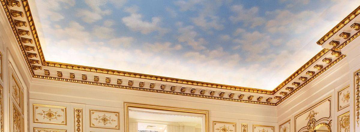 Потолок расписан под облачное небо и имеет подсветку, в вечернее время он производит незабываемое впечатление. Несмотря на то, что «облачные потолки» любят делать в современных интерьерах, здесь в классической атмосфере он смотрится не менее органично. Конечно, роль тут играет высокий потолок (7 метров).