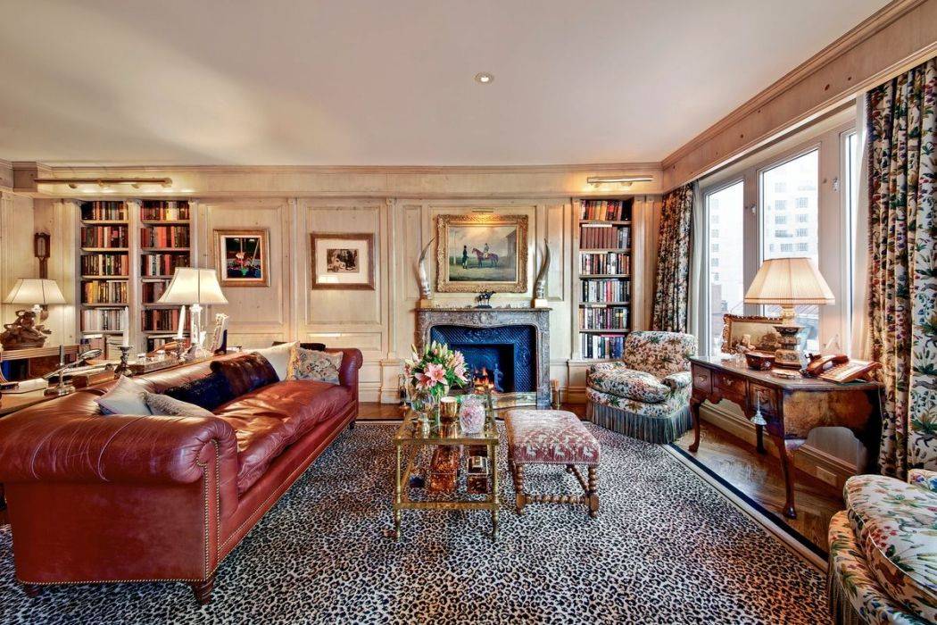 Обстановка кабинета носит более камерный и спокойный характер. Он решен в английском классическом стиле: с массивными панелями и библиотечными стеллажами из натуральной древесины, живописным полотном на тему охоты, кожаным диваном и комфортными мягкими креслами с цветочной обивкой в тон гардин. Небольшая и элегантная нотка стиля гламур проникает в этот интерьер в виде ковра с леопардовой расцветкой.