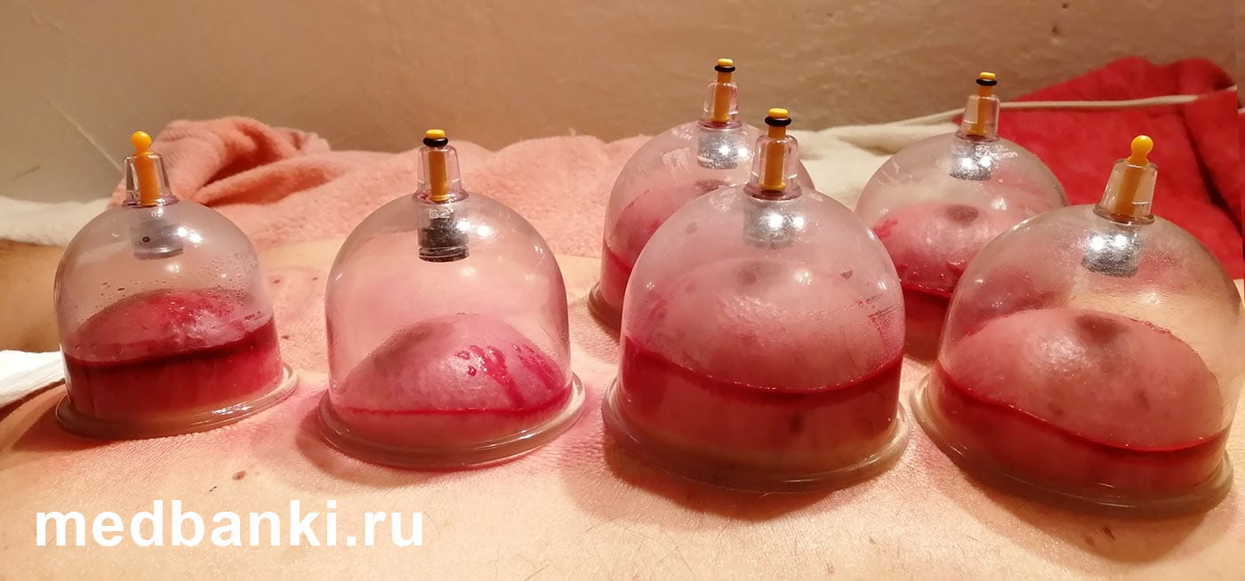 - На нужные точки устанавливаются банки. При помощи небольшого насоса воздух из них откачивается. По истечении не более 5 минут, когда кожные покровы станут темно-красными, банки снимают.