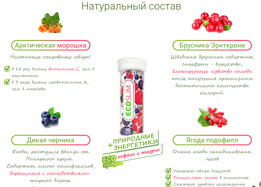 Таблетки для похудения Эко Слим – препарат полностью на растительной основе. Активные компоненты, входящие в состав препарата: