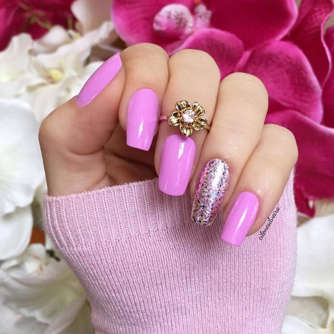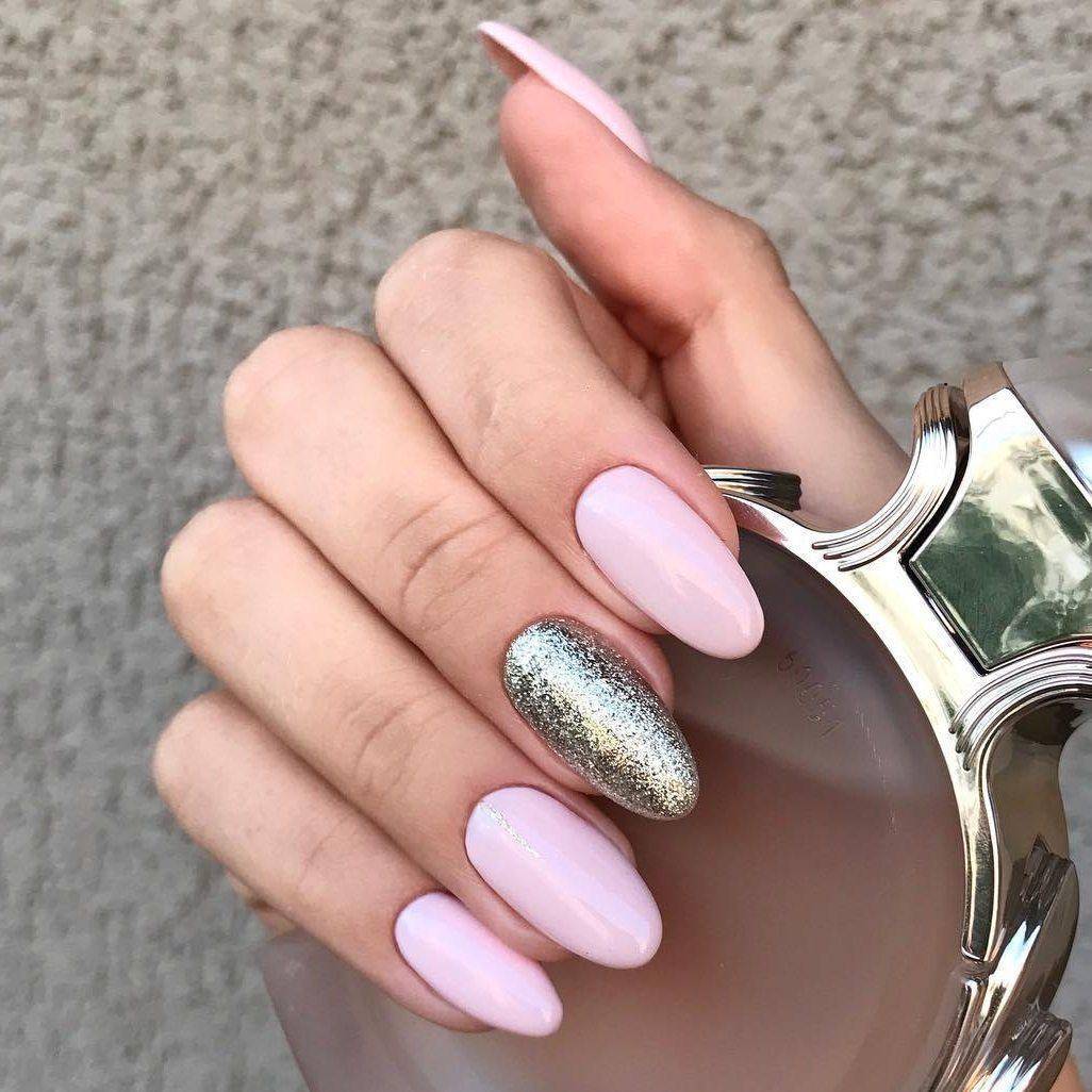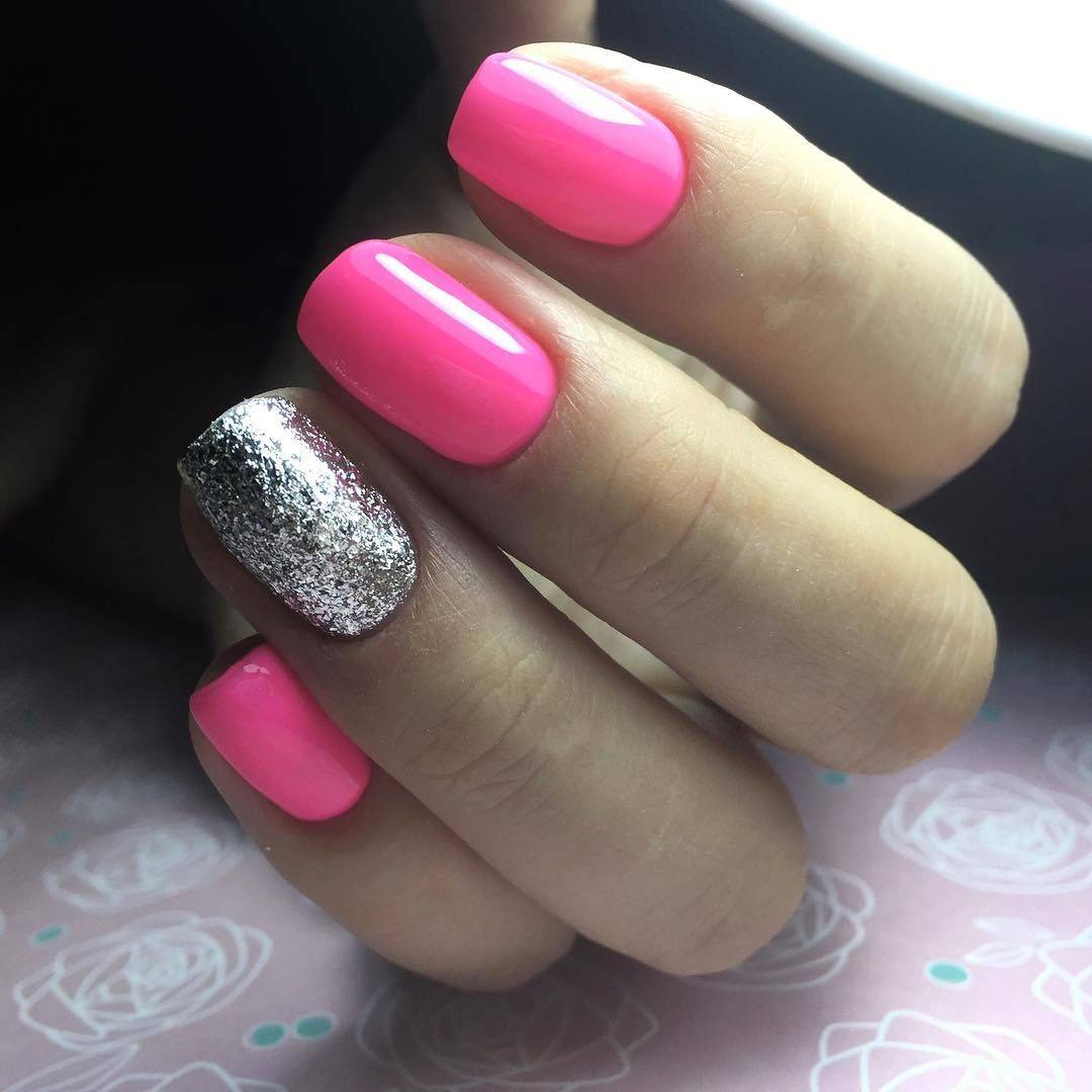 Если вы хотите получить стильный минималистичный дизайн ногтей, то выполните однотонное покрытие розовым цветом и выделите безымянный палец серебряным глиттером.