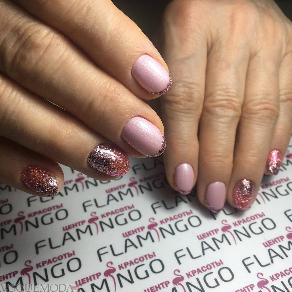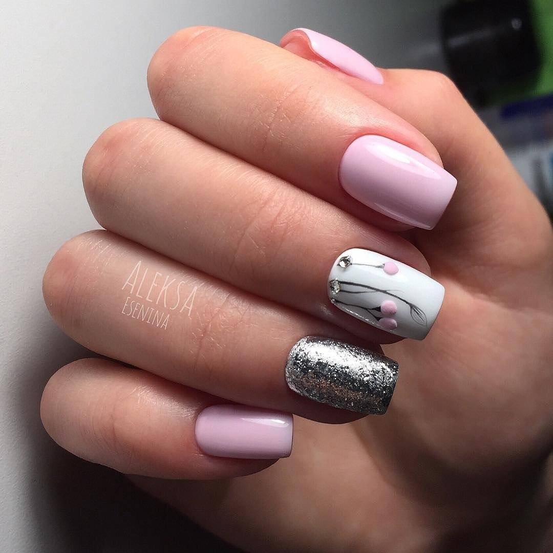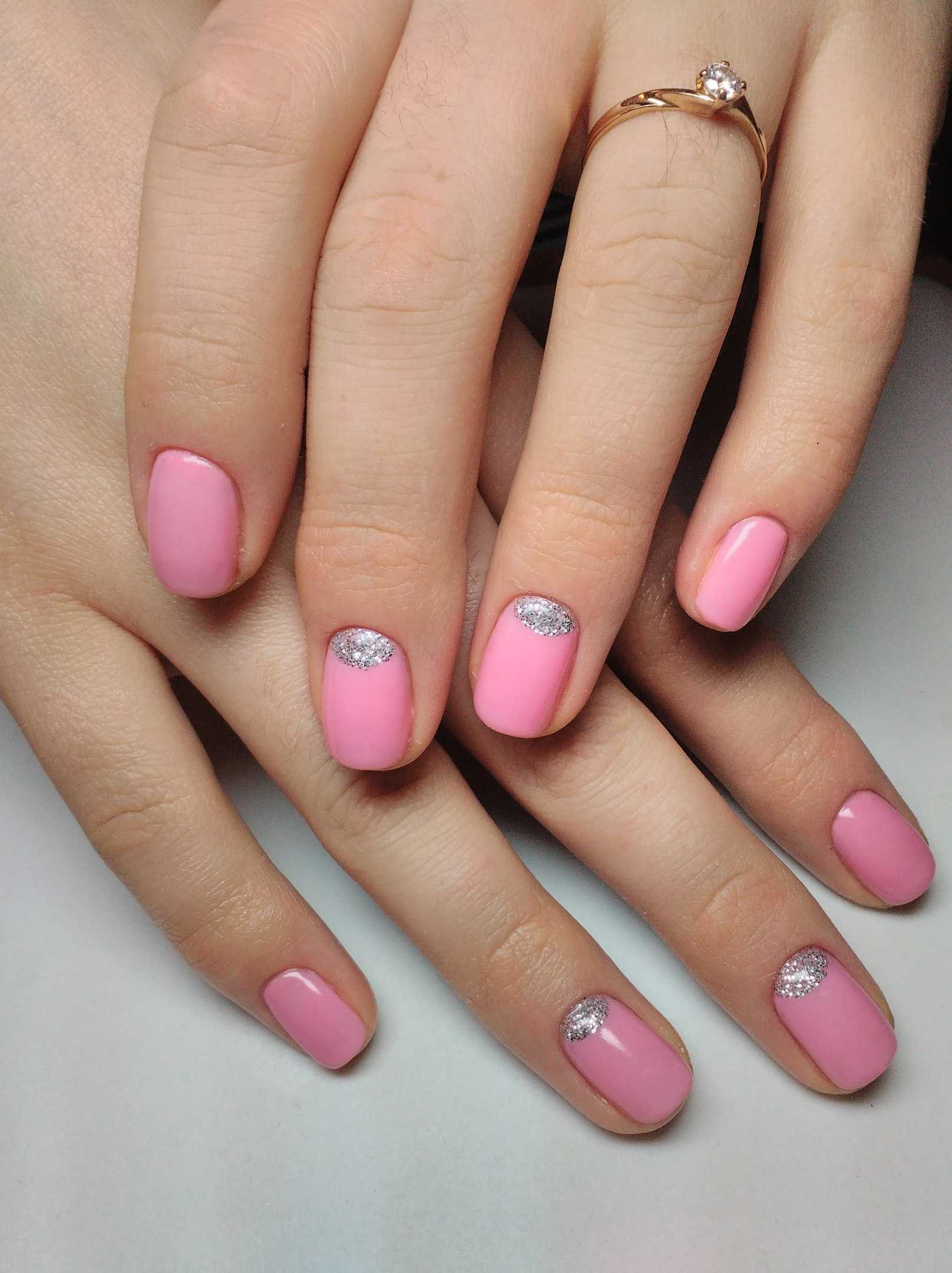 Розовый цвет в сочетании с серебряным глиттером смотрится сдержанно и очень женственно. Дизайн отлично впишется в повседневные и деловые образы. Даже наличие блестящего декора не сделает этот маникюр слишком заметным и вызывающим.