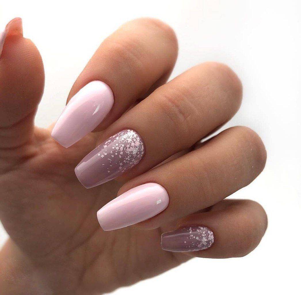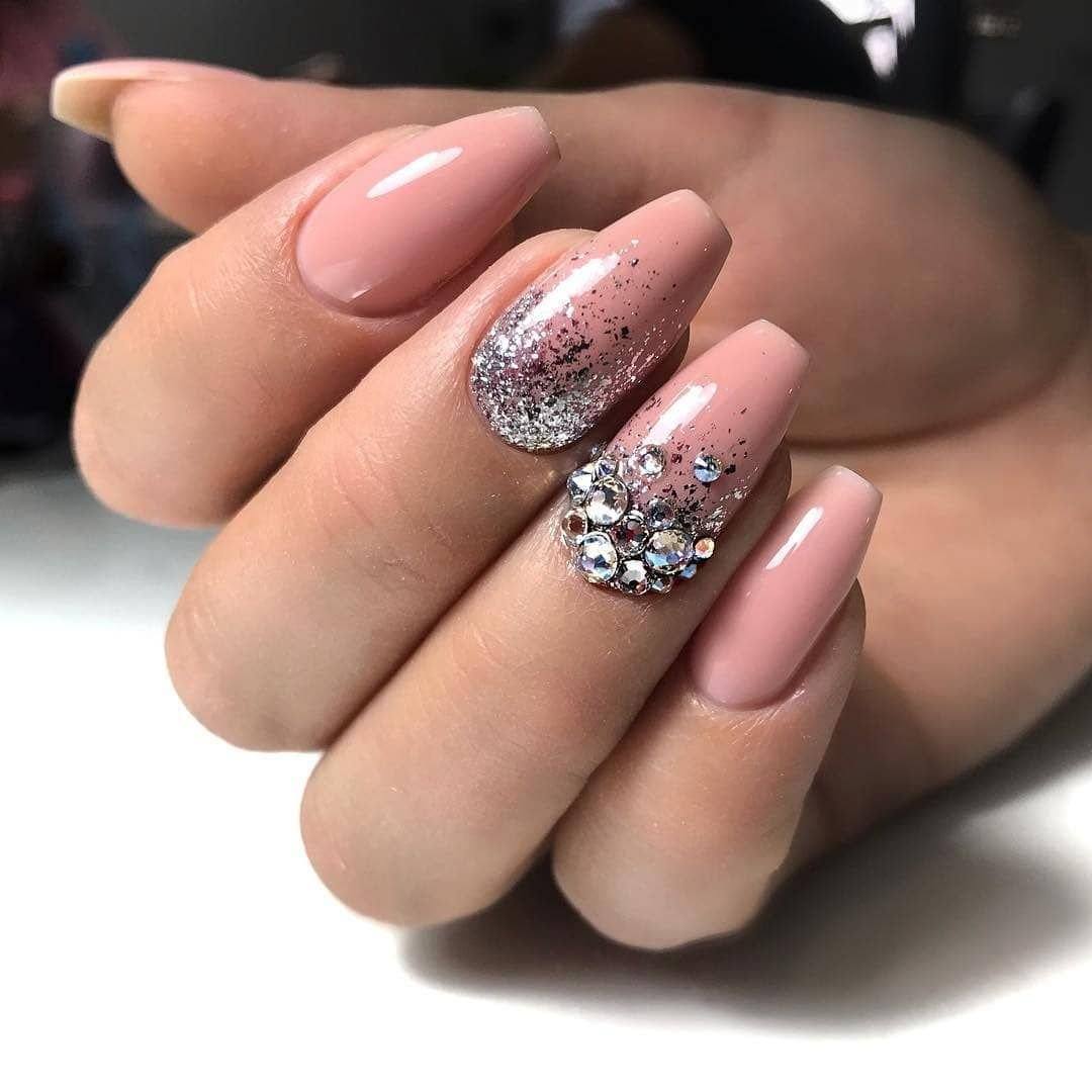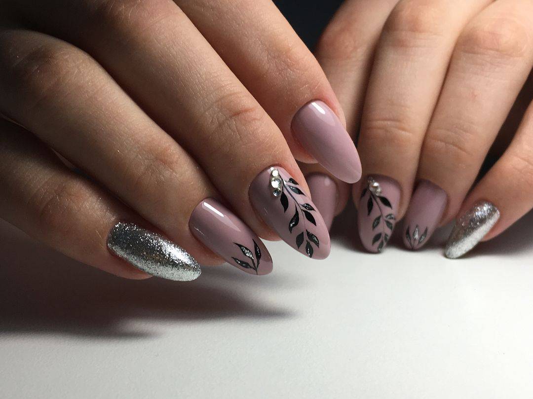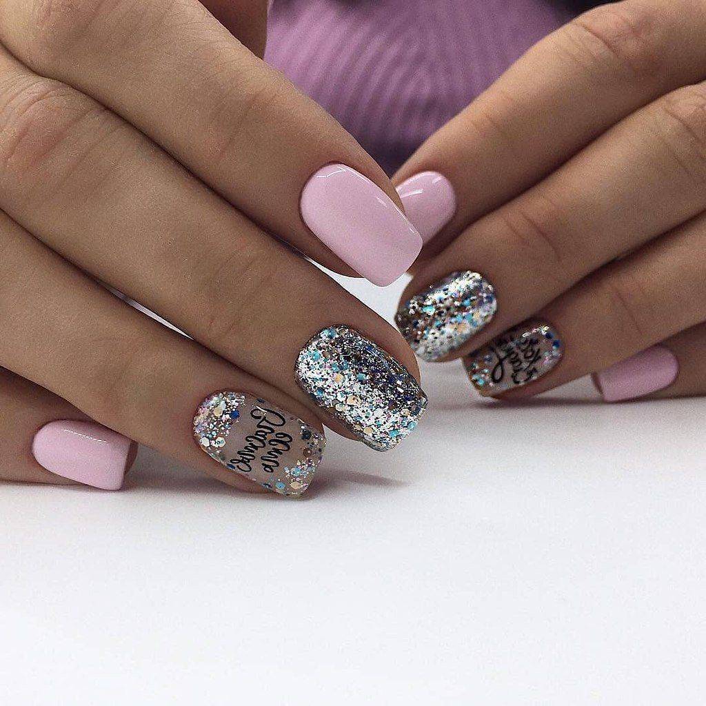 Розовый цвет в сочетании с серебряным глиттером смотрится сдержанно и очень женственно. Дизайн отлично впишется в повседневные и деловые образы. Даже наличие блестящего декора не сделает этот маникюр слишком заметным и вызывающим.