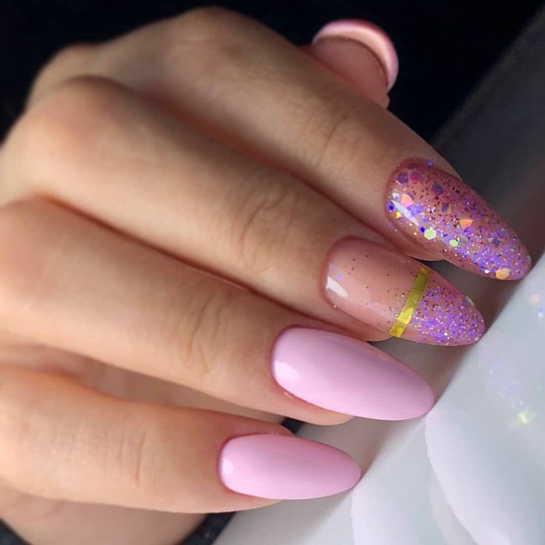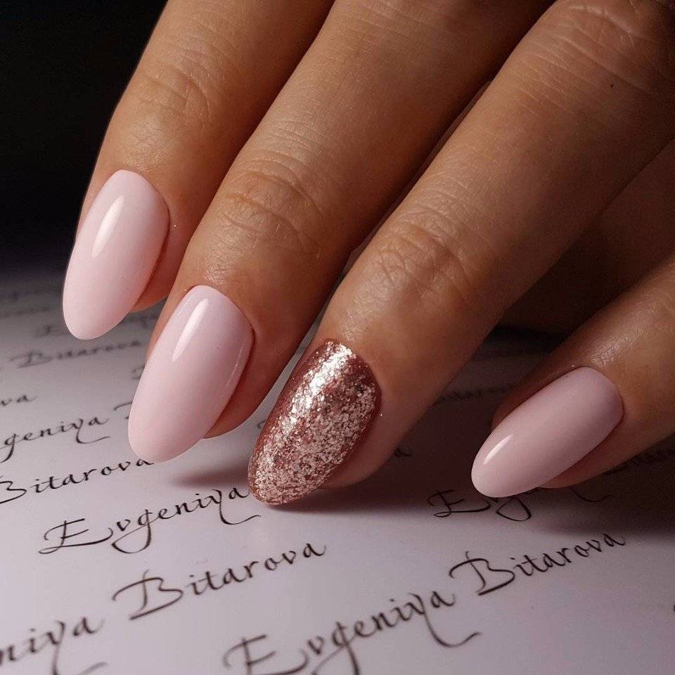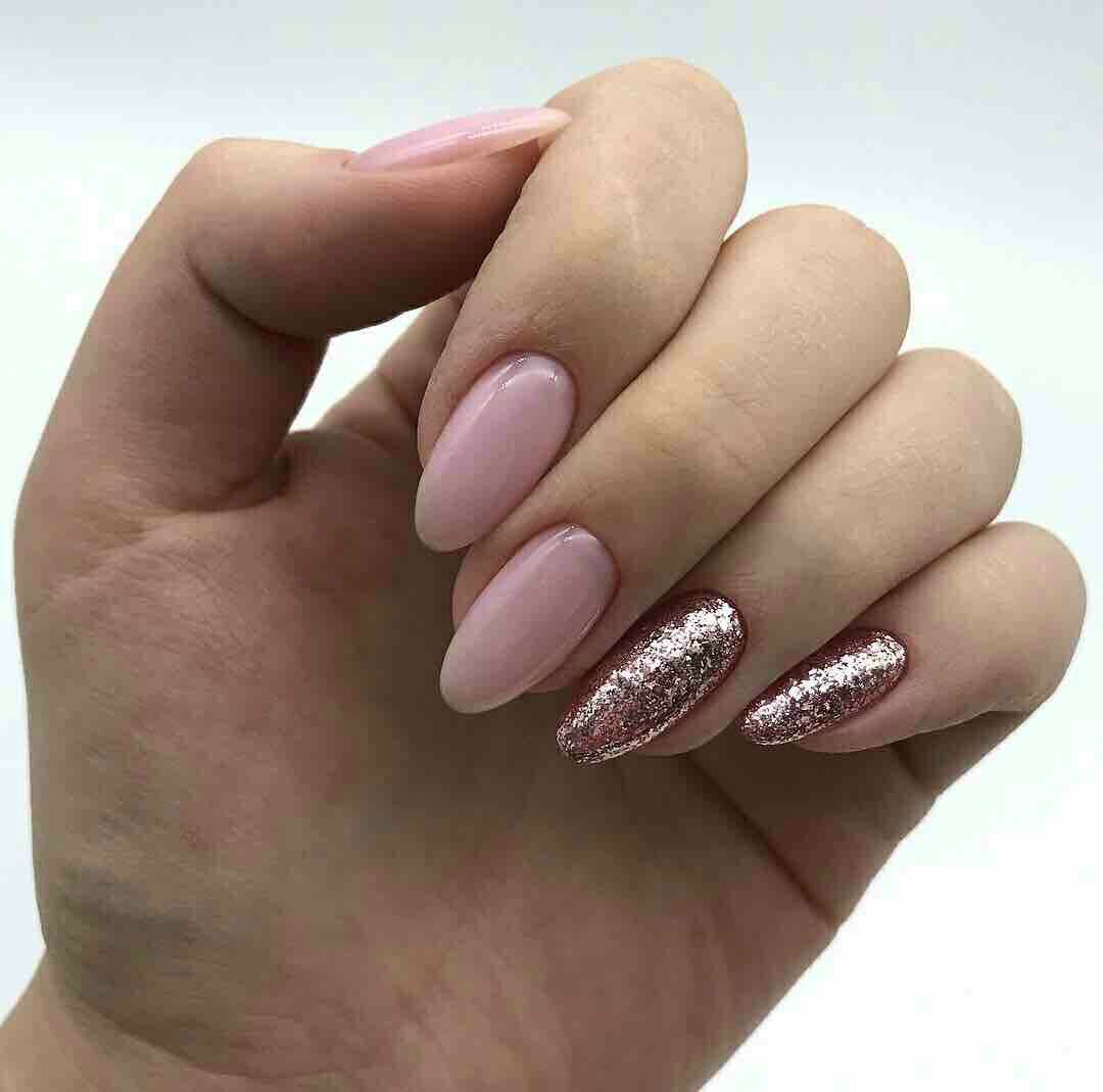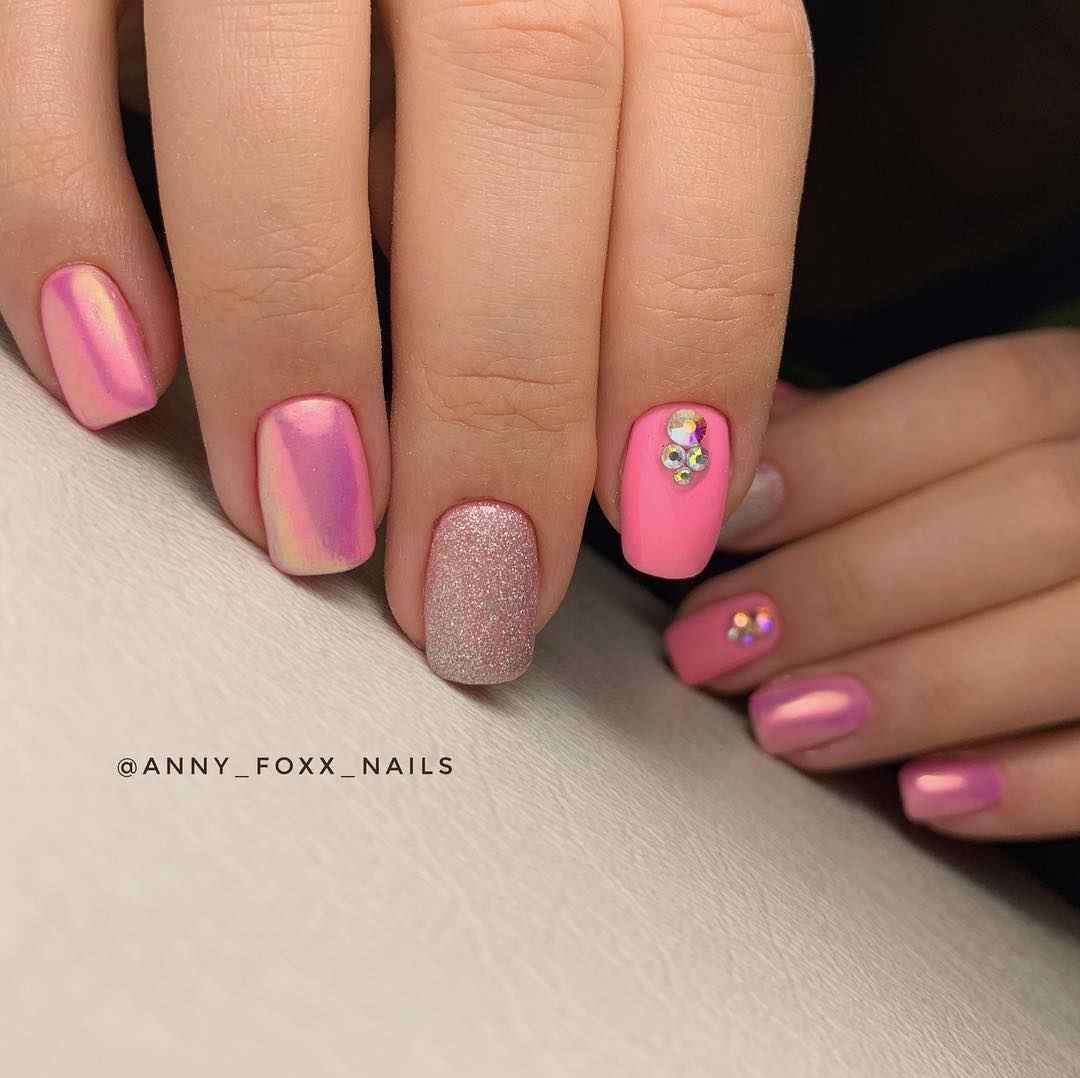 Такая эффектная и яркая деталь как глиттер вдохнет в розовый маникюр нотки торжественности и изыска. Даже матовый розовый цвет в соседстве с глиттером будет смотреться гораздо лаконичнее и эффектнее. Для декора выбирайте гель-лаки с глиттером, сухие блестки, пайетки и другой блестящий материал.