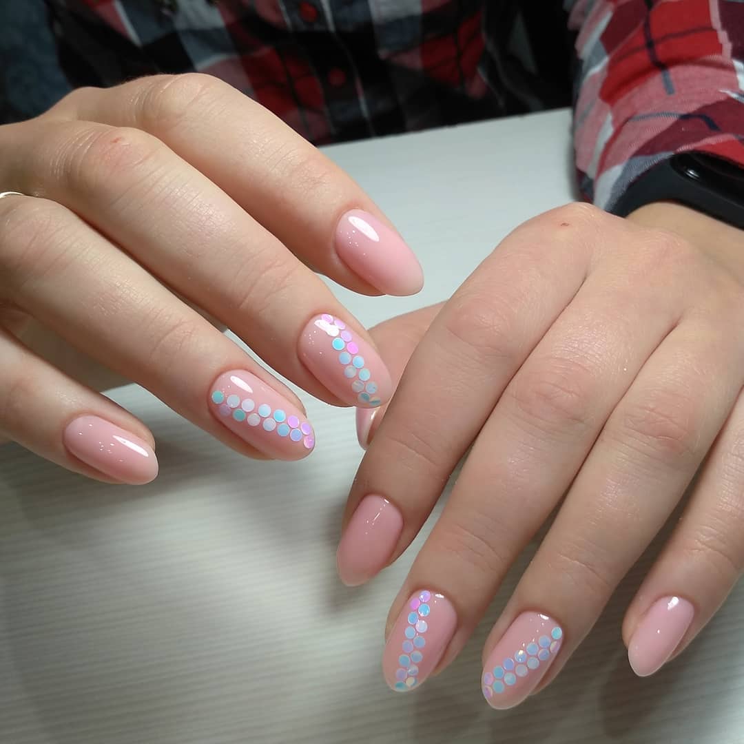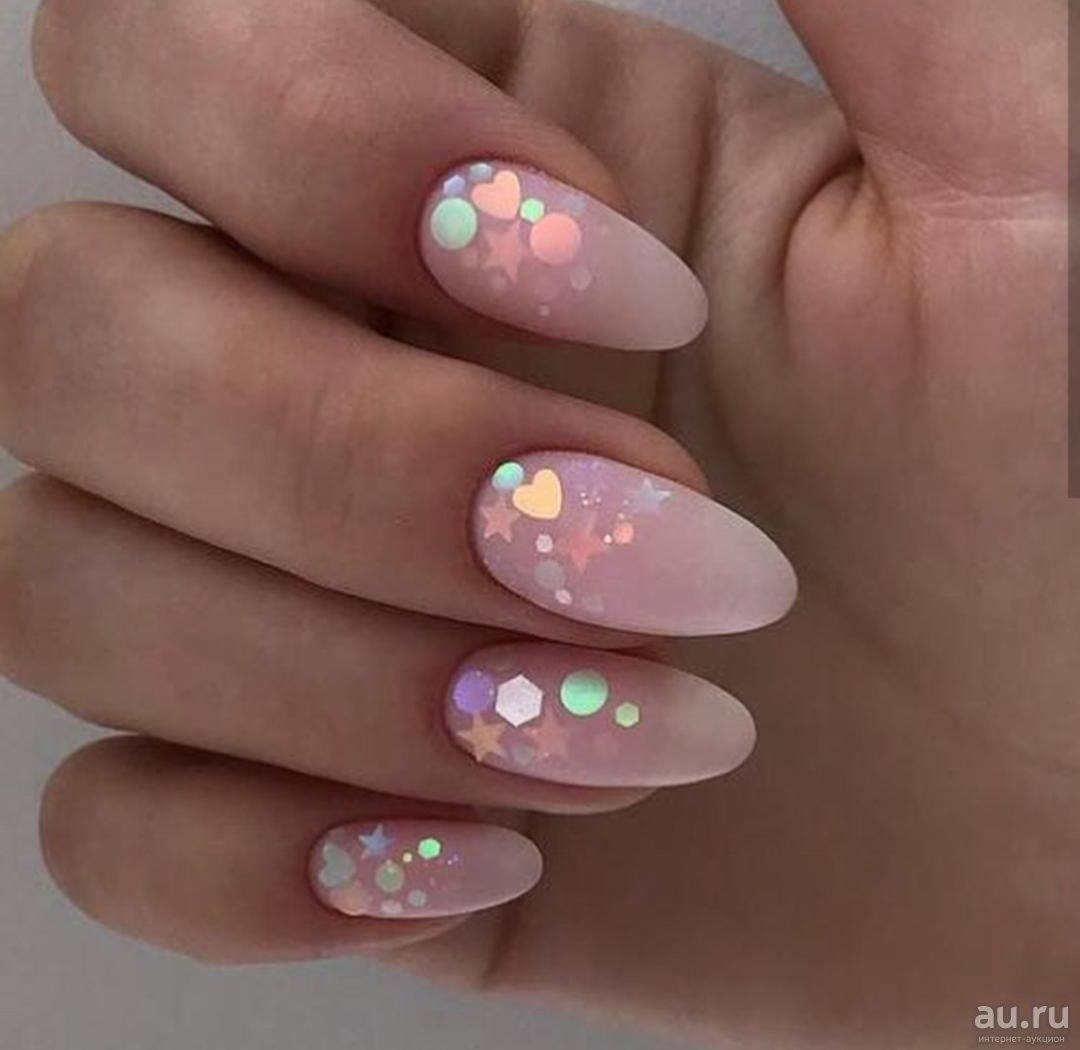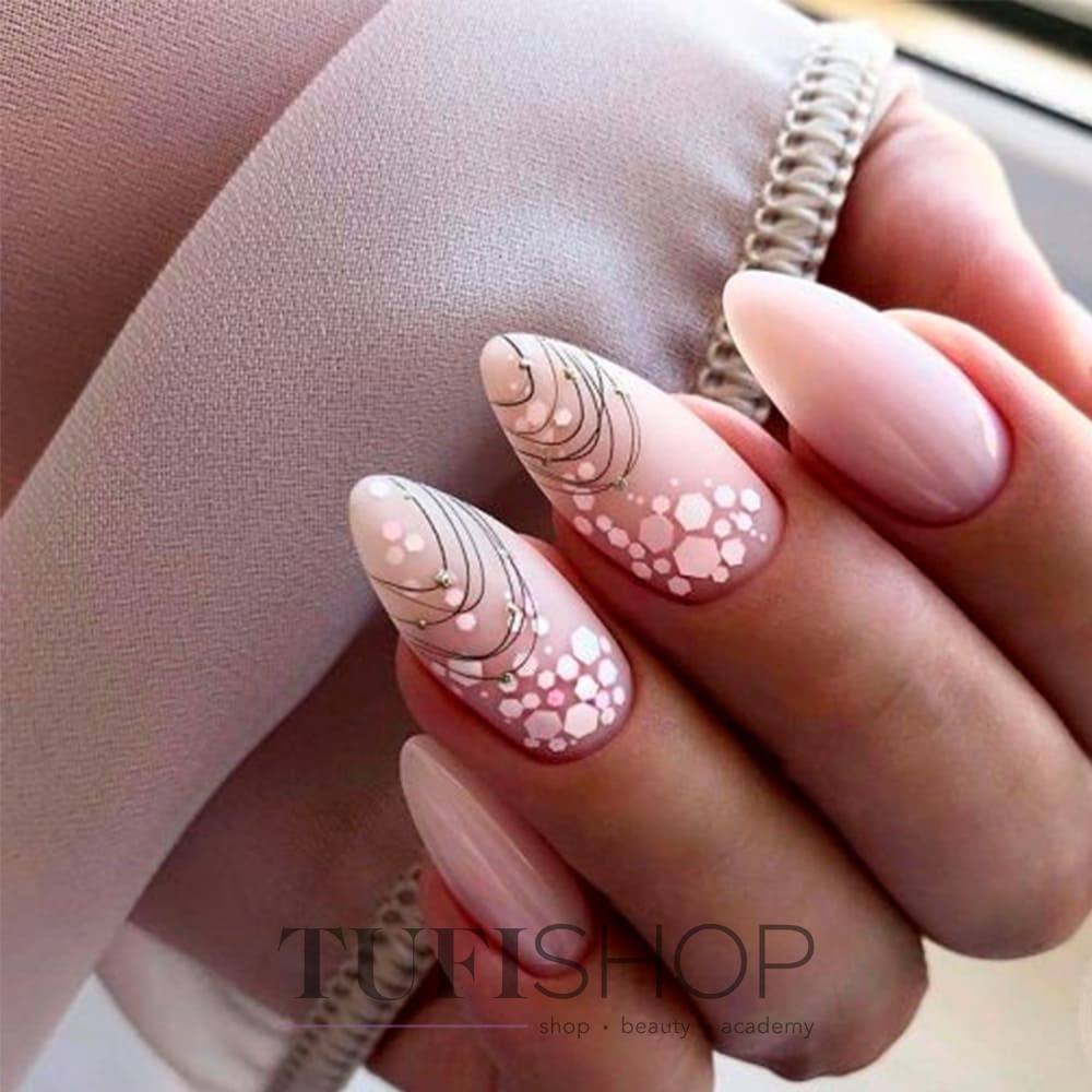 Пайетки отлично смотрятся с матовым розовым покрытием. Для эффектного дизайна достаточно украсить прикорневую зону пайетками и стильный нежный маникюр готов. Работать с пайетками также легко, как и с блестками. Используйте пайетки для создания повседневных и торжественных нейл-артов.