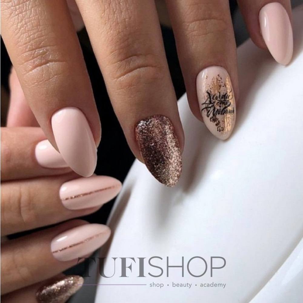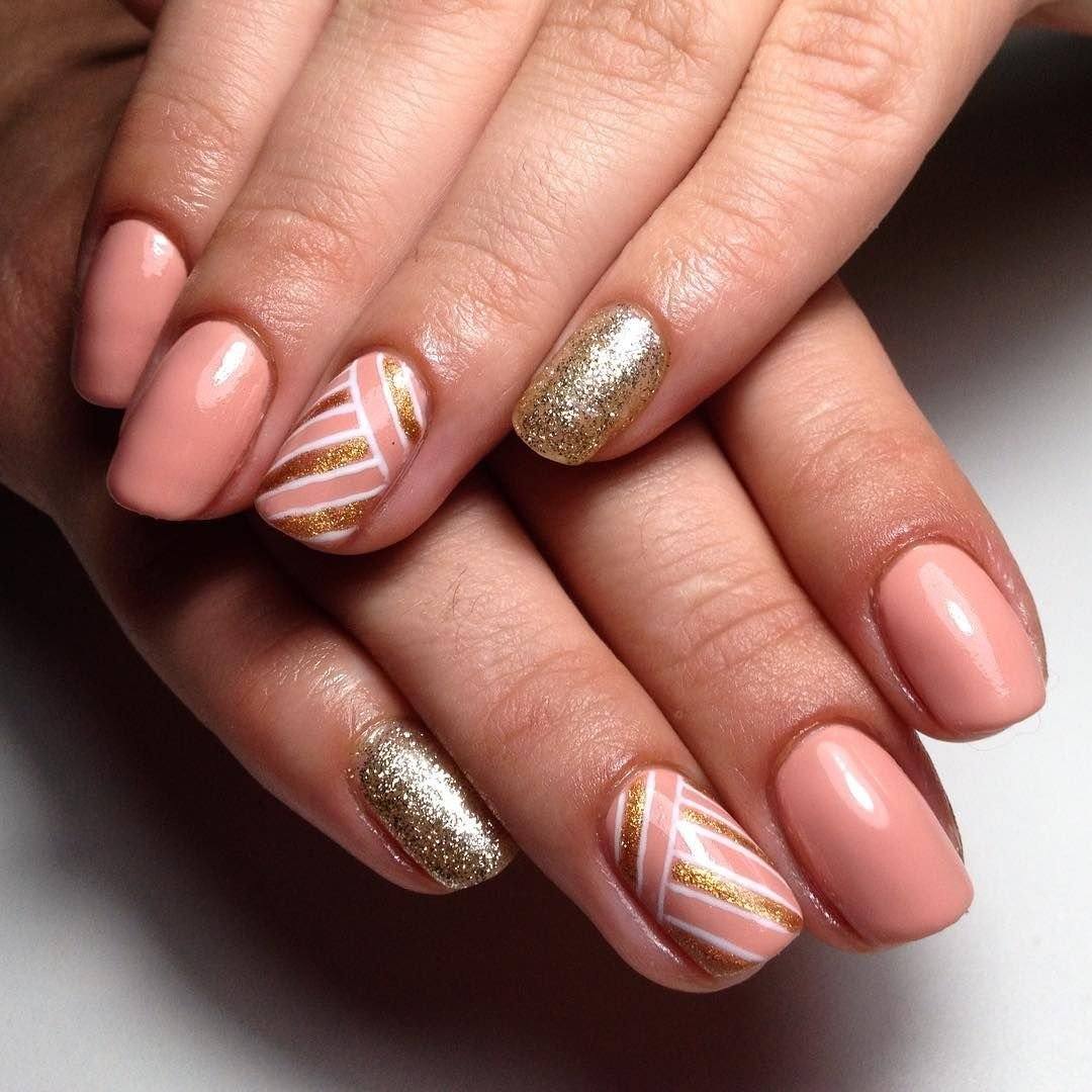 Приходится по душе настоящим леди. Естественный тон и золотой перелив отлично смотрятся в сочетании с золотой фольгой, ветвистыми узорами и френчем. Неплохо выглядят геометрические узоры и пайетки.