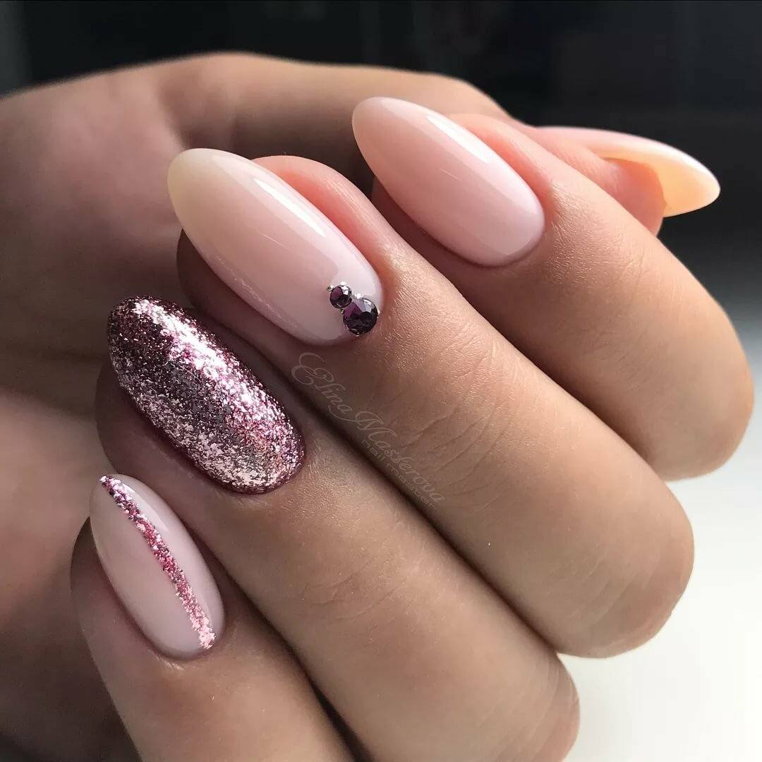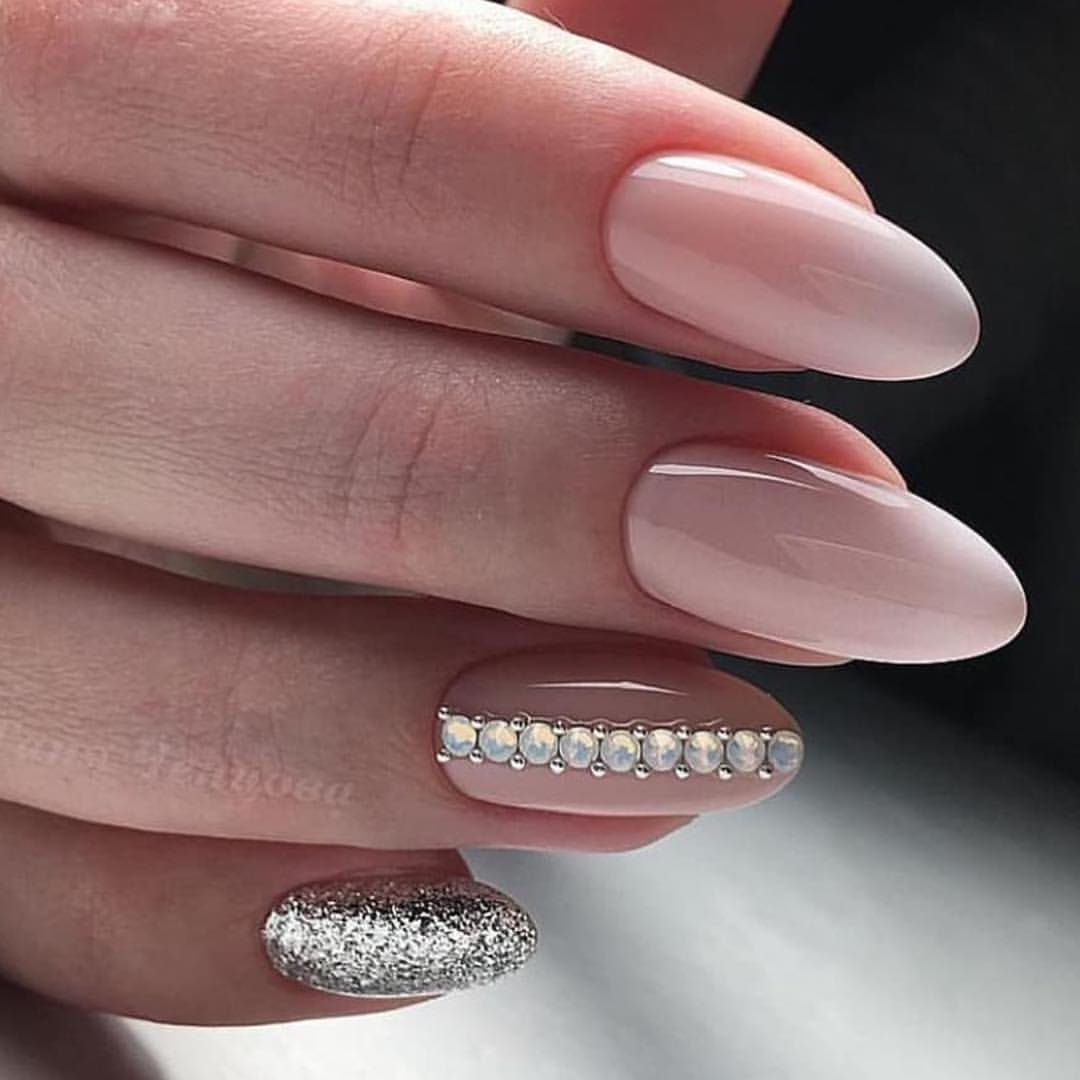 Гламурный и яркий нюд с яркими элементами выглядит не скучно, а даже нарядно и празднично. С помощью блестящих элементов удается подчеркнуть форму ногтей.