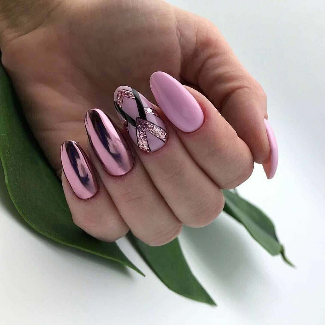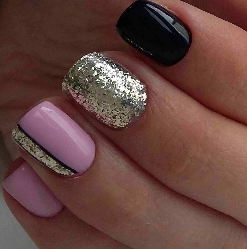 Не менее часто в черно-розовом дизайне используется серебристый или золотистый цвет. Они помогают сделать маникюр чуть более праздничным и ярким. Также блестки или глиттер часто выполняют роль акцента