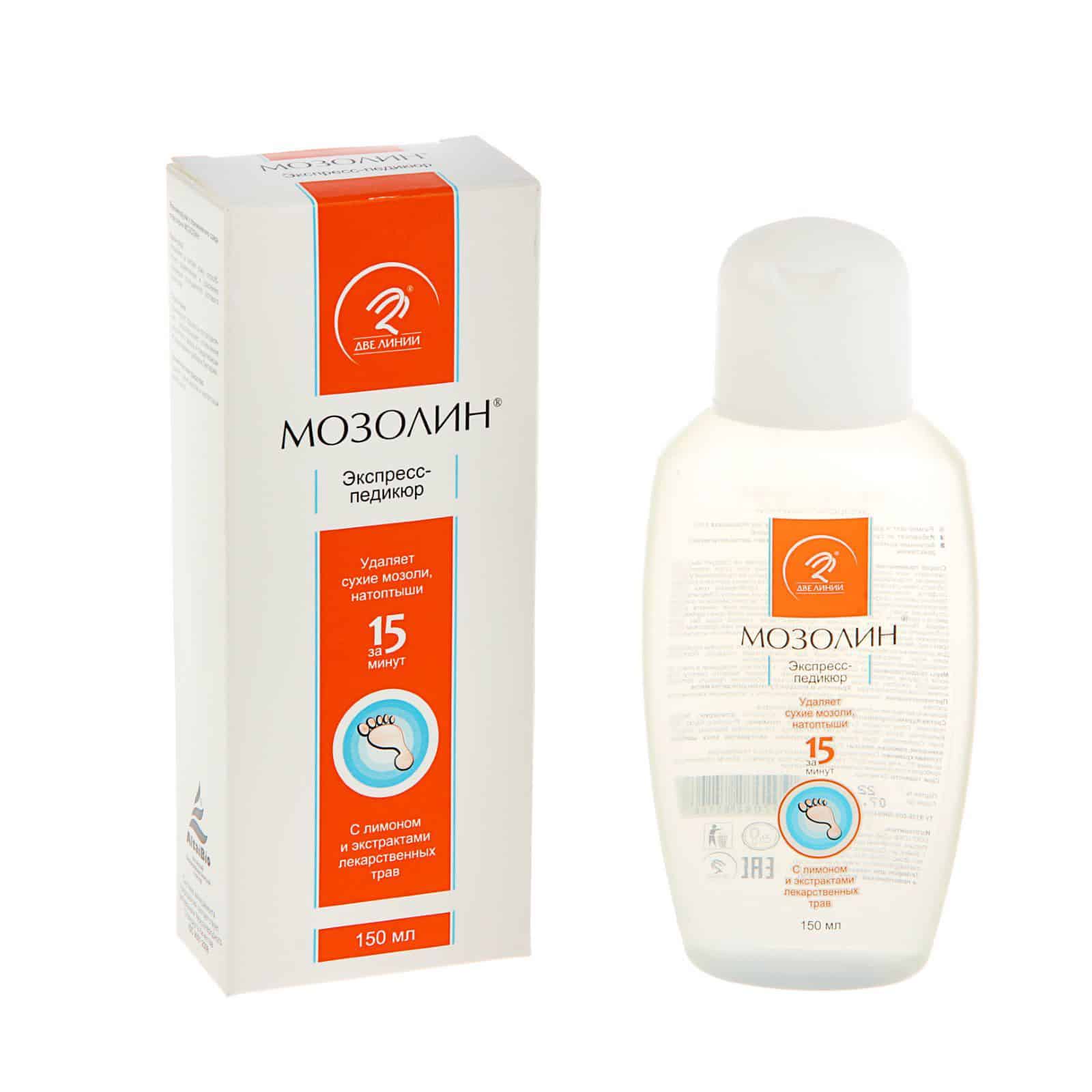 Стопы ножек при экспресс-педикюре обрабатываются специальными смягчающими составами, для быстрого удаления старой ороговевшей кожи. Одним из самых распространённых магазинных и аптечных составов считается «Мозолин экспресс-педикюр», которое часто используется даже в самых лучших салонах.