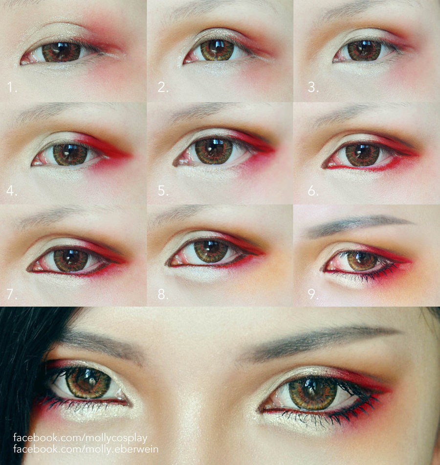 5) В аниме макияжа глаз самое трудное в пошаговом исполнении — создание формы, приближенной к азиатской. Для достижения «восточного» эффекта, карандашом рисуется линия, максимально приближенная к линии роста ресниц верхнего века до середины, затем она немного «приподнимается», а потом рисуется как в самом начале. Далее, следует взять тени светлых теней и нанести на всю область подвижного века.