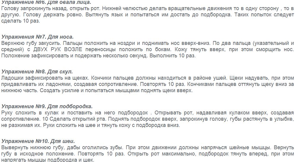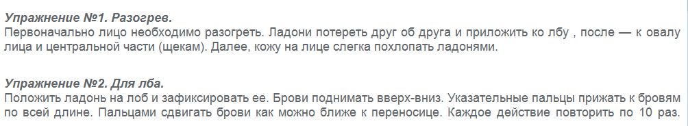 - Весь комплекс следует выполнять полностью даже в том случае, если упражнение затрагивает зоны лица, на которых отсутствуют возрастные изменения.