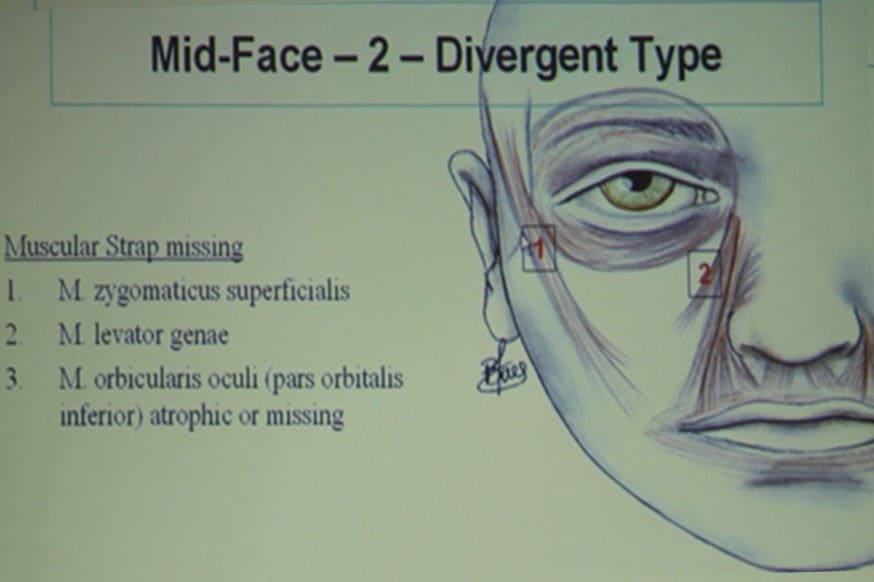 Дивергентный – самый неблагоприятный, обеспечивающий раннее старение, носослезная борозда появляется очень рано, в молодом возрасте: недоразвитие мышц лица, плотная орбито-малярная связка, которая очень плотно прикрепляется по всему краю орбиты, недостаточный объем и низкое прикрепление SOOF и поверхностного малярного жира, уплощенная скула, отрицательный вектор и выраженные гусиные лапки.