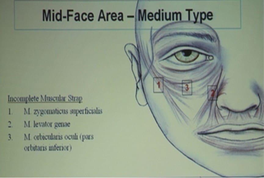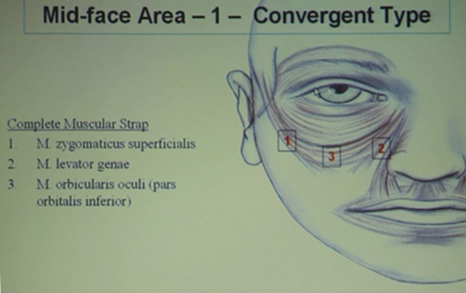 Конвергентный тип – гладкий переход веко – щека, положительный вектор (проекция скулы больше проекции глазного яблока – подробнее см ниже). Самый благоприятный, т.к. приводит к очень позднему появлению носослезной борозды и не выраженным гусиным лапкам. Характеризуется достаточным развитием лицевых мышц, высокой границей щеки, что определяется высоким прикреплением и хорошим объемом SOOF и поверхностного малярного жира.