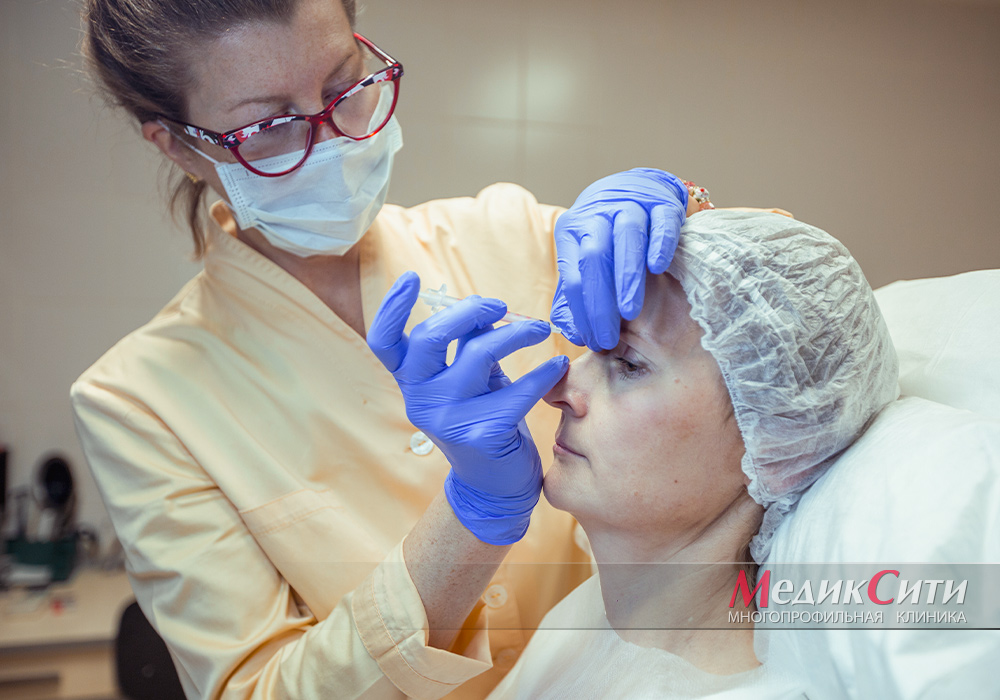 - Ботулинотерапией. Ботокс позволяет на время парализовать определенные мышцы. Такая методика обеспечивают профилактику образования мимических морщин. В области лба уколы используют для ликвидации заломов;
