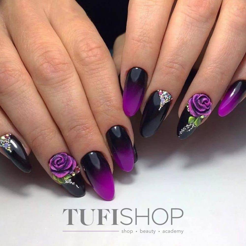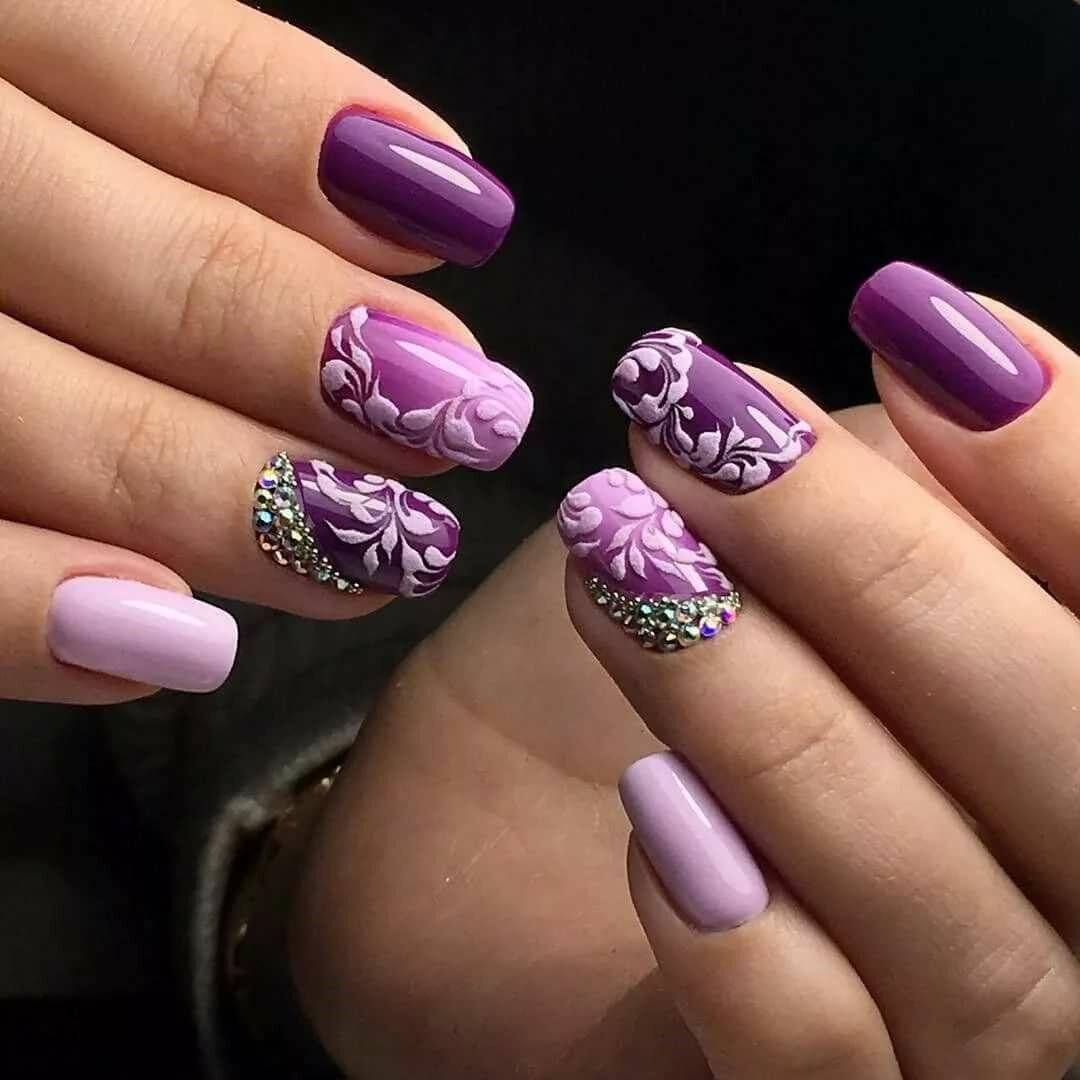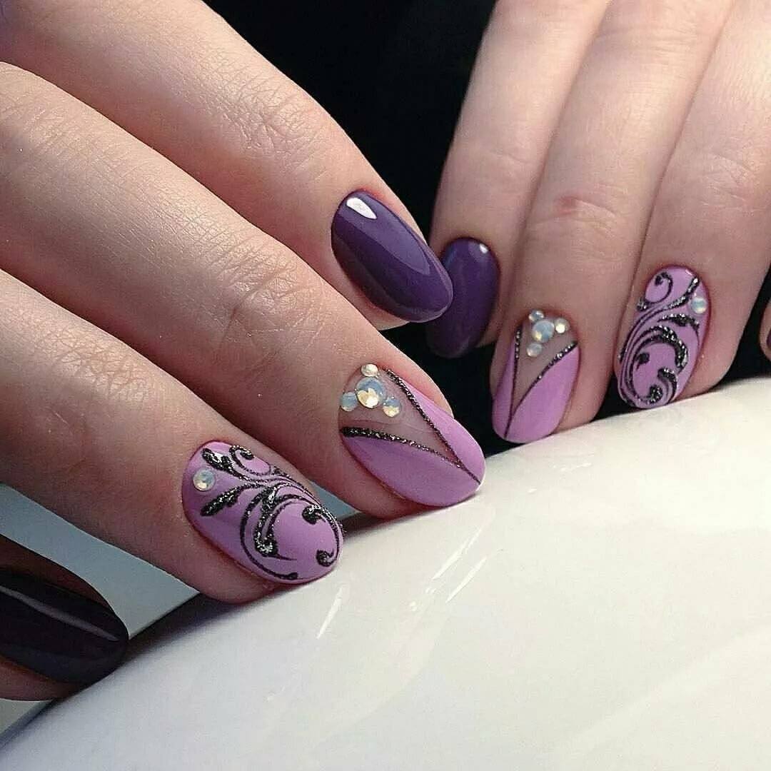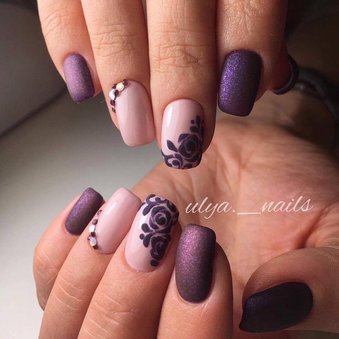 Темные оттенки чаще всего нуждаются в блестящей декоре. Стразы – лучшее украшение ноготков. Незначительное количество камней, бульонок отлично смотрится в прикорневой зоне, в качестве декора лепестков и бутонов. Бульонки также отлично выглядят в фиолетовом маникюре. Выбирайте для декора прозрачные, фиолетовые, розовые, серебряные, золотые бульонки.