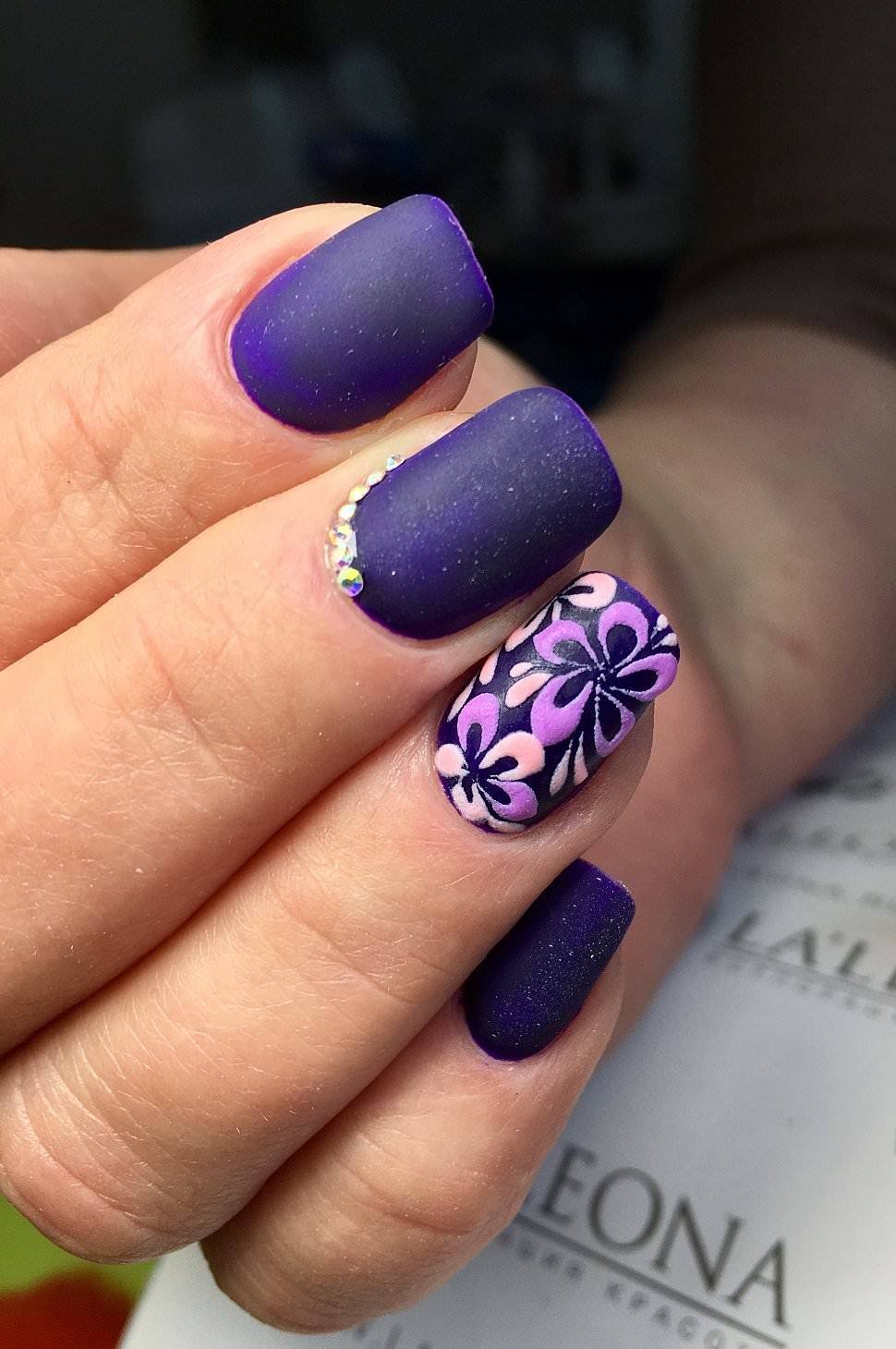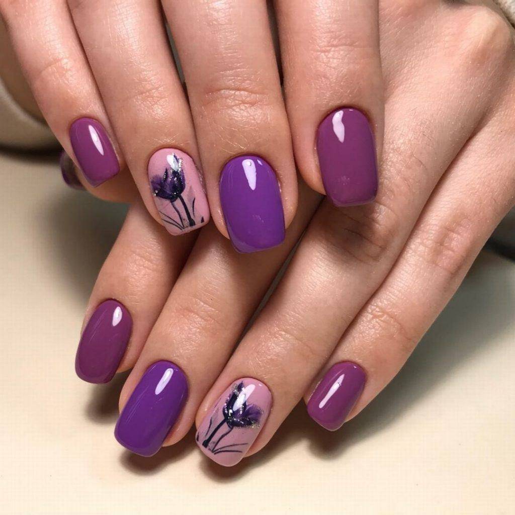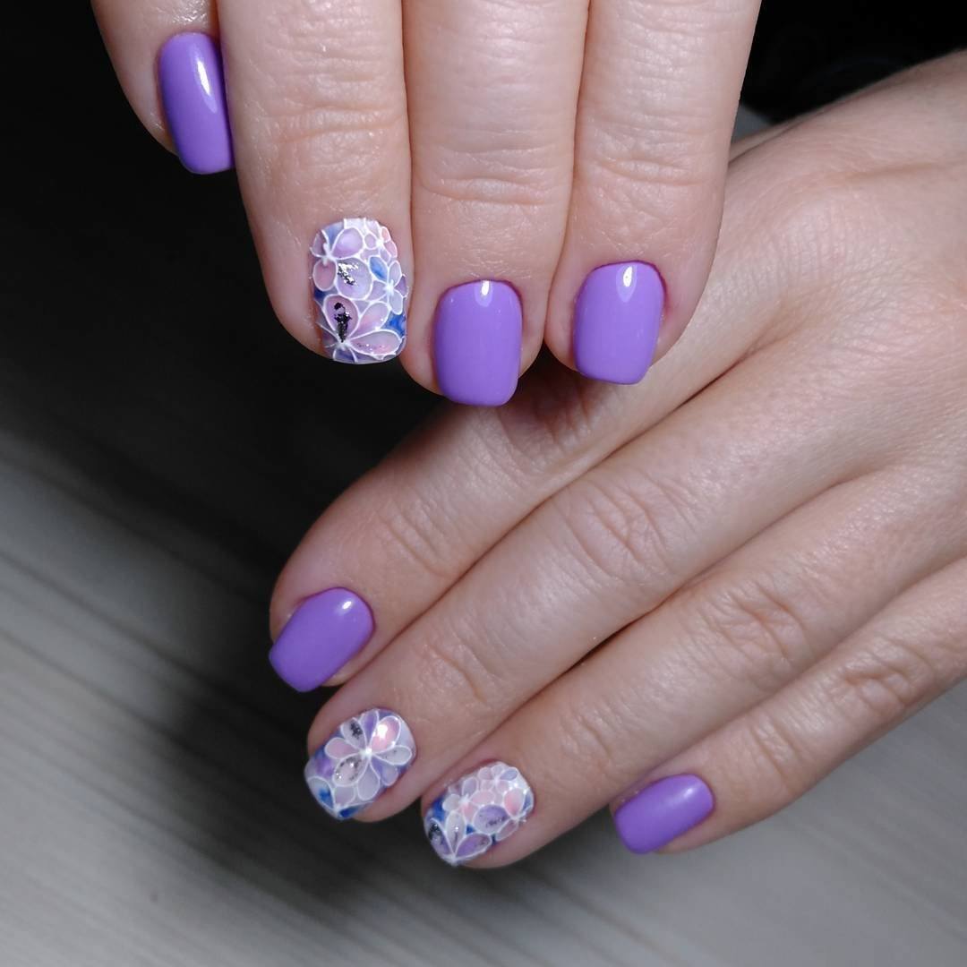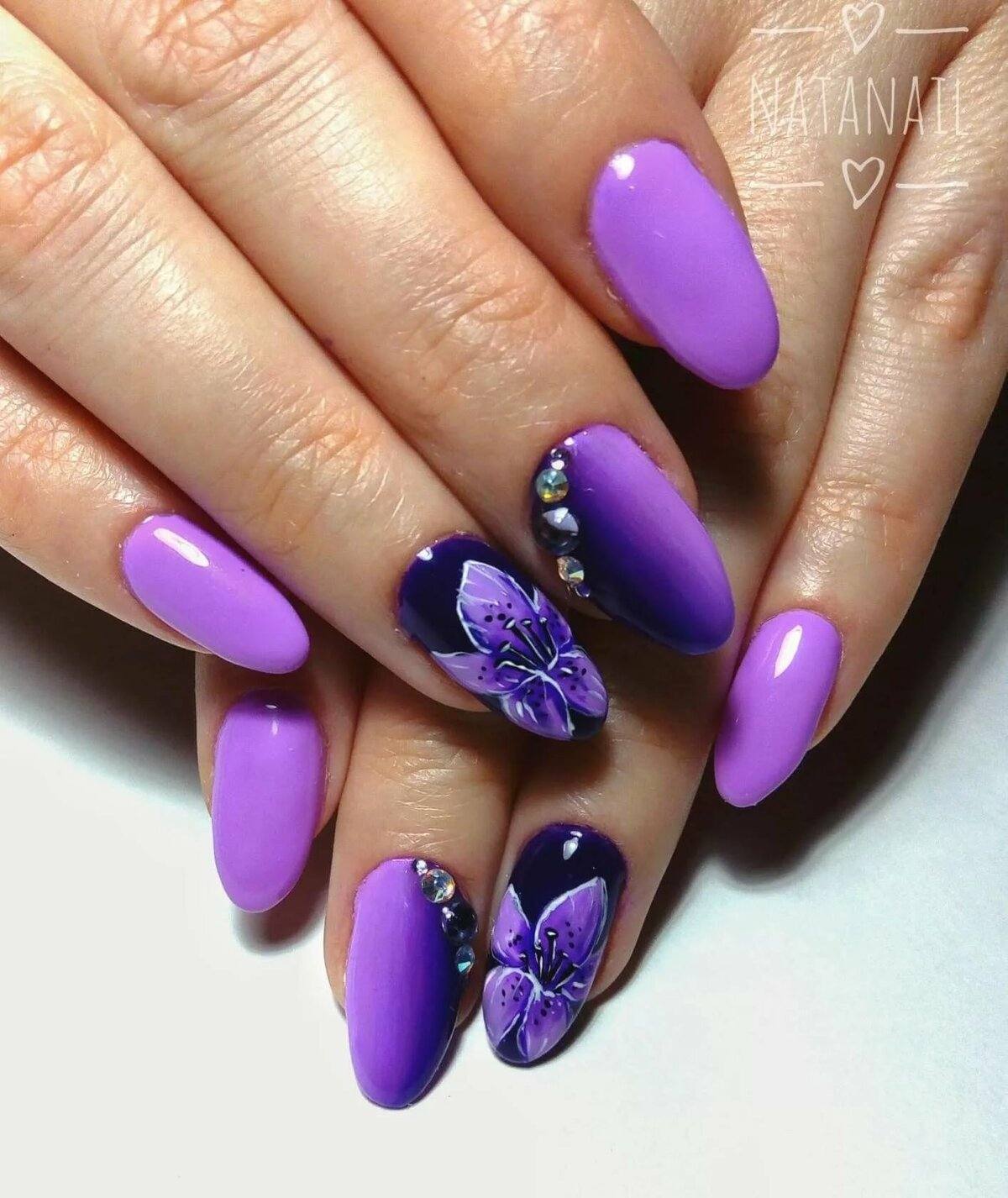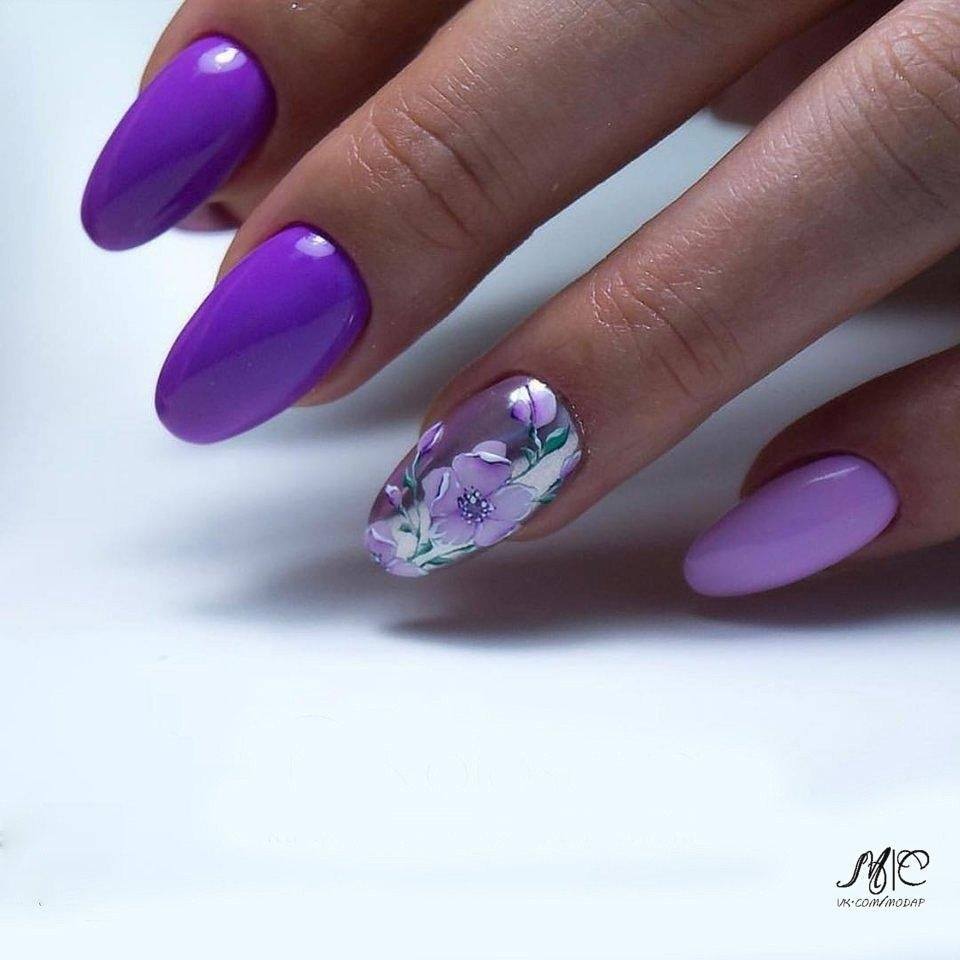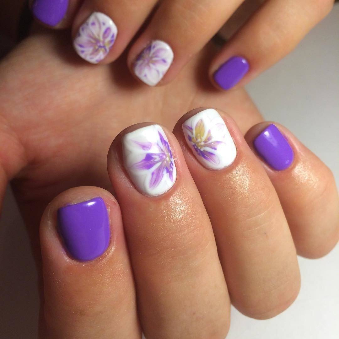 Фиолетовый маникюр – выбор далеко не каждой женщины. Дизайн смотрится очень насыщенно и заметно. Цветочный узор – лучшее, чем можно дополнить фиолетовый оттенок. Цветы гармонично вписываются как в светлые, так и в темные оттенки фиолетового.