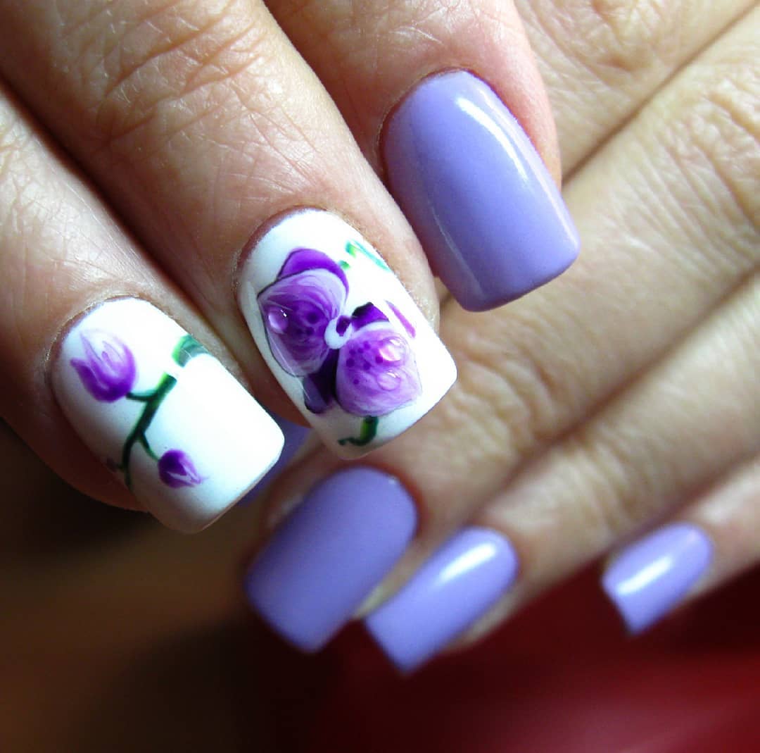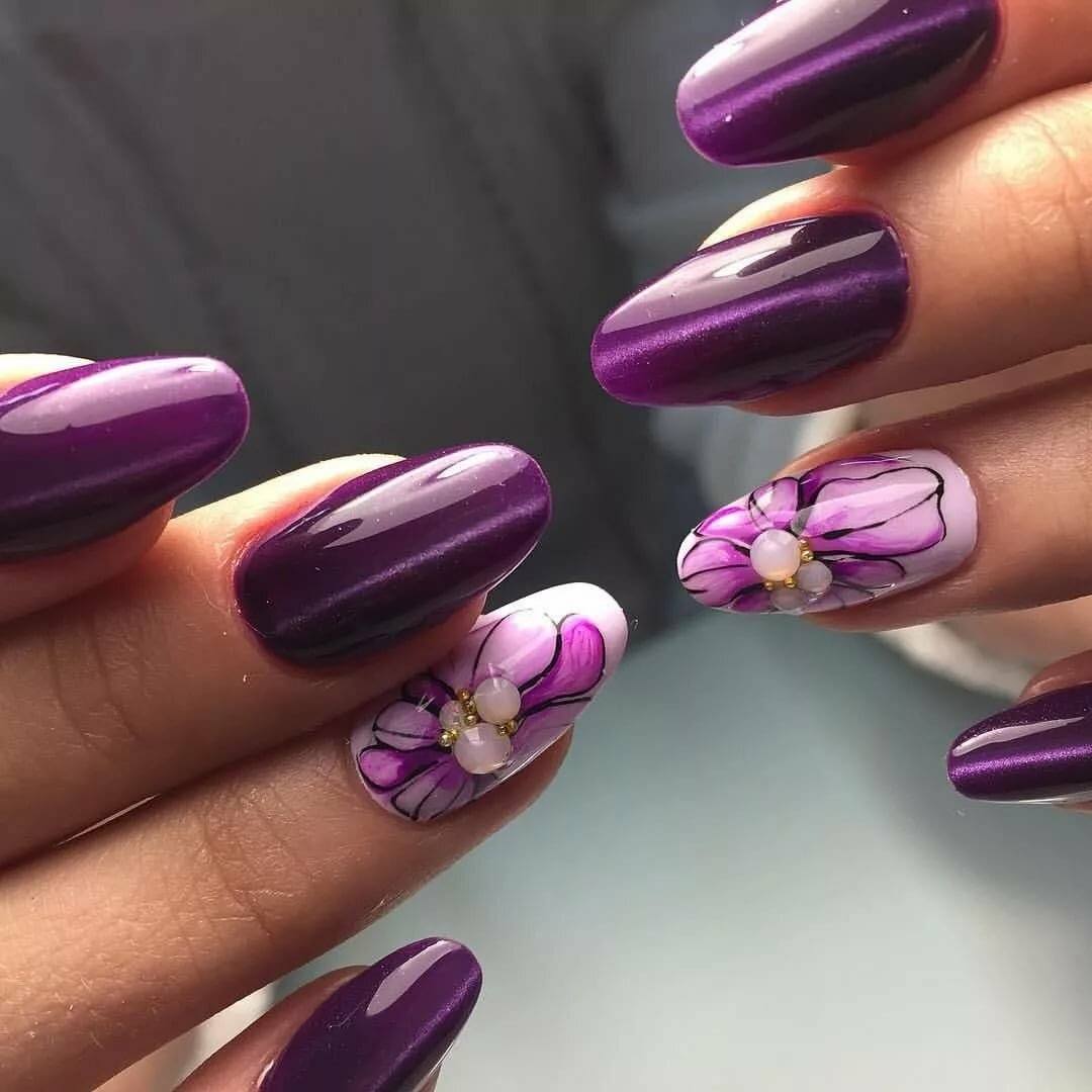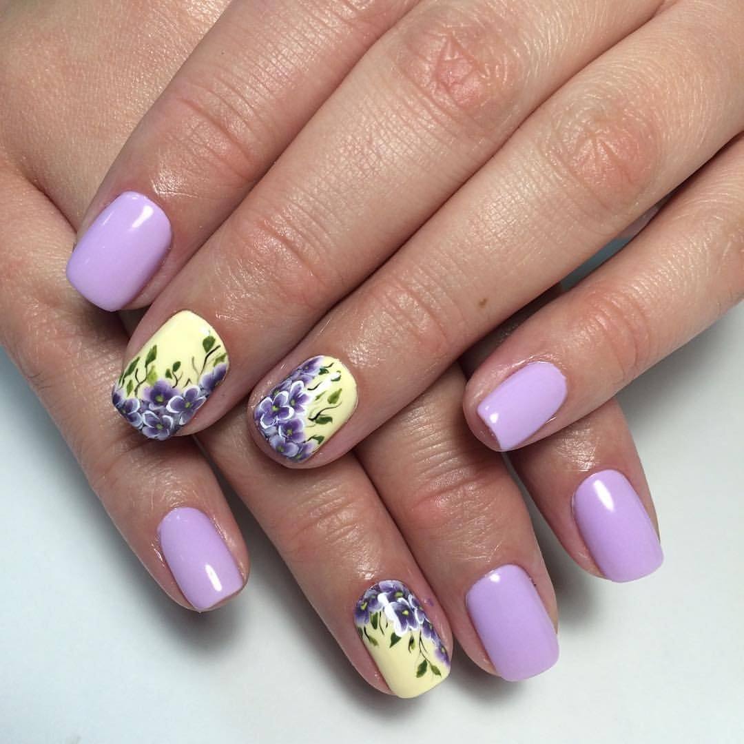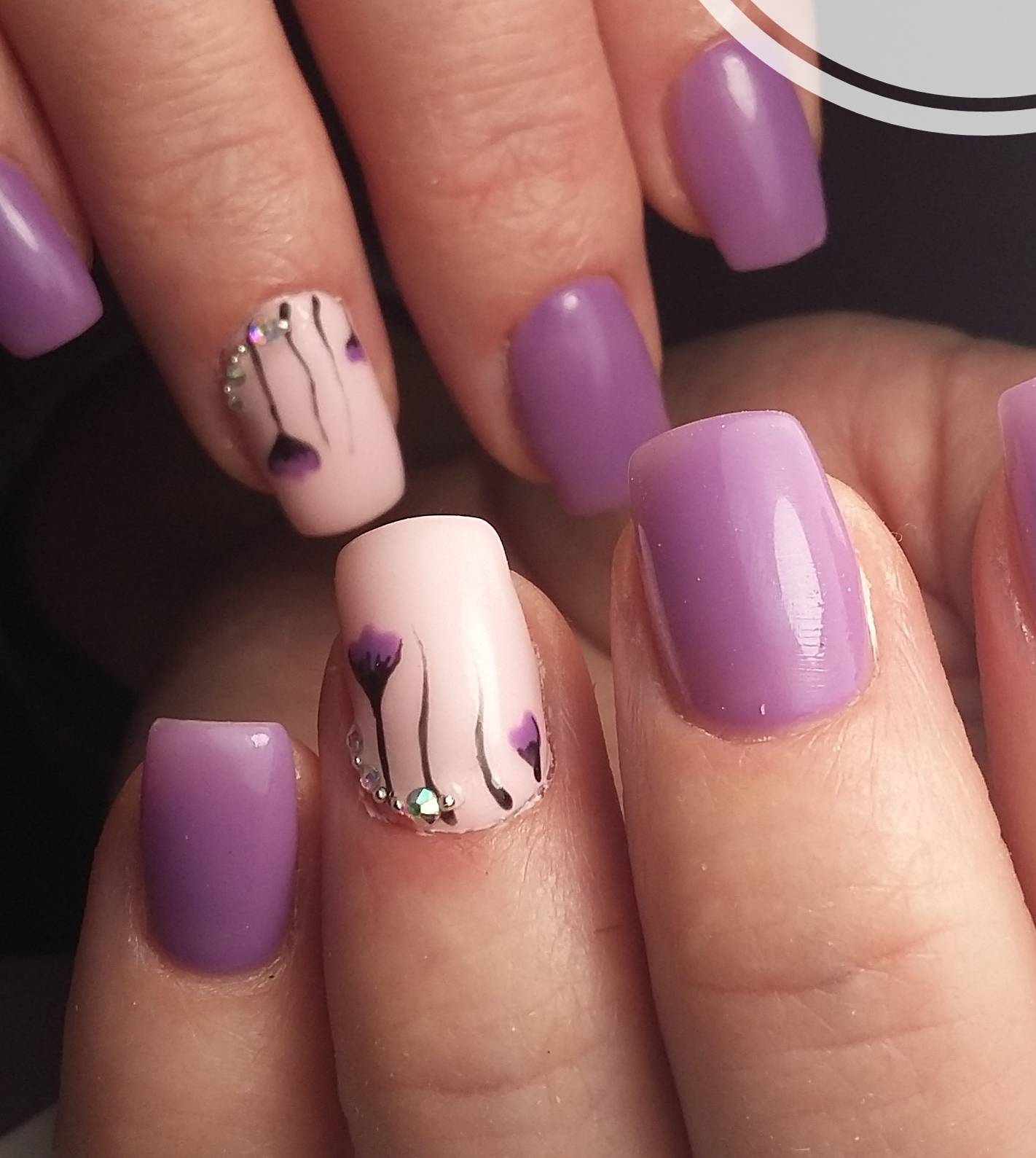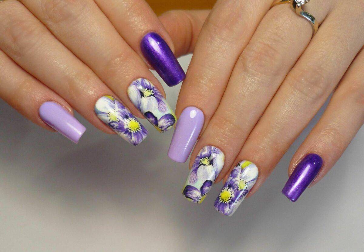 Фиолетовый маникюр – выбор далеко не каждой женщины. Дизайн смотрится очень насыщенно и заметно. Цветочный узор – лучшее, чем можно дополнить фиолетовый оттенок. Цветы гармонично вписываются как в светлые, так и в темные оттенки фиолетового.