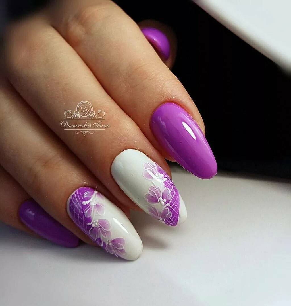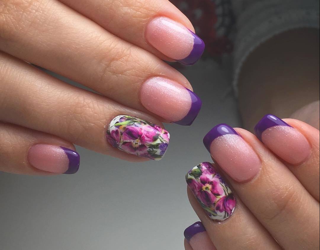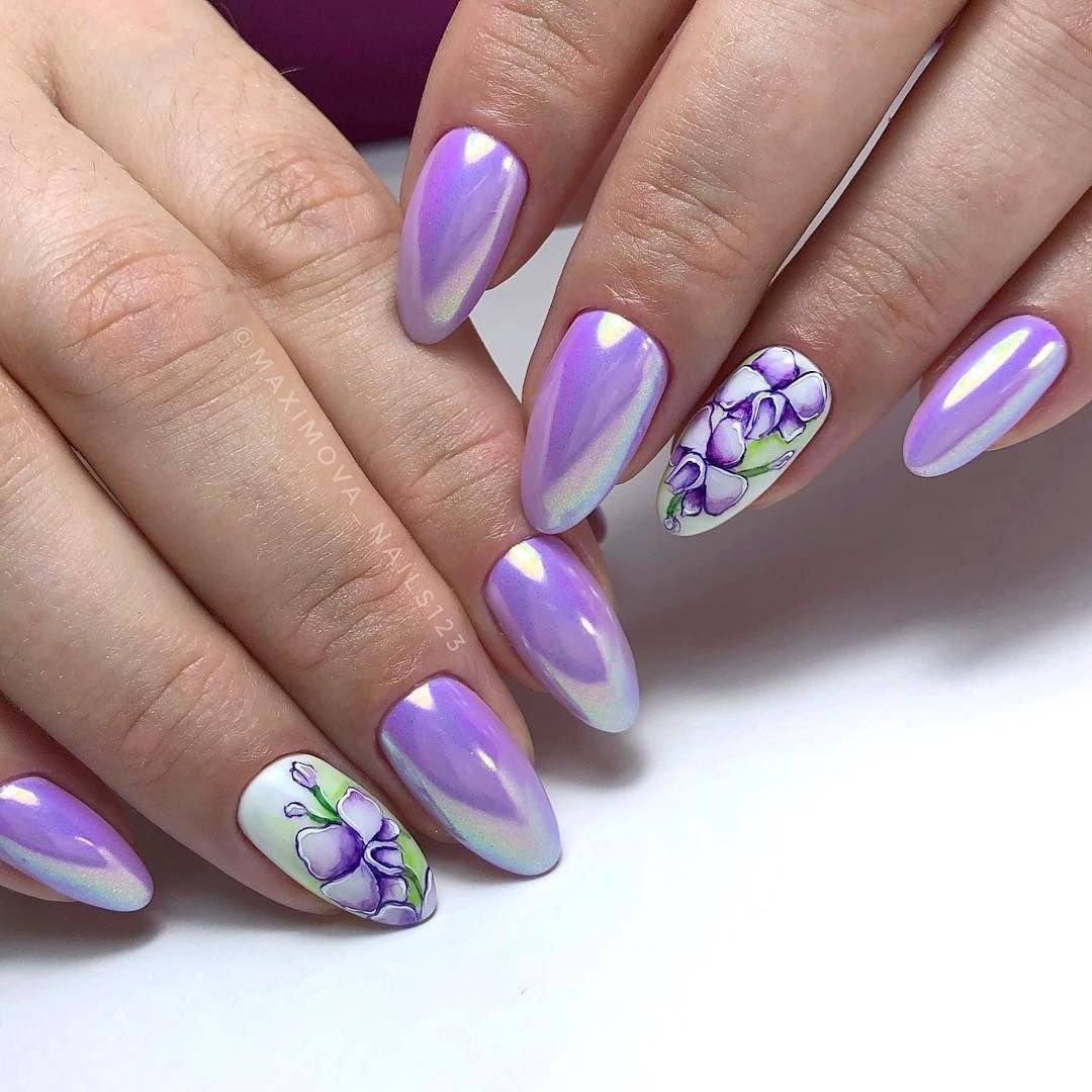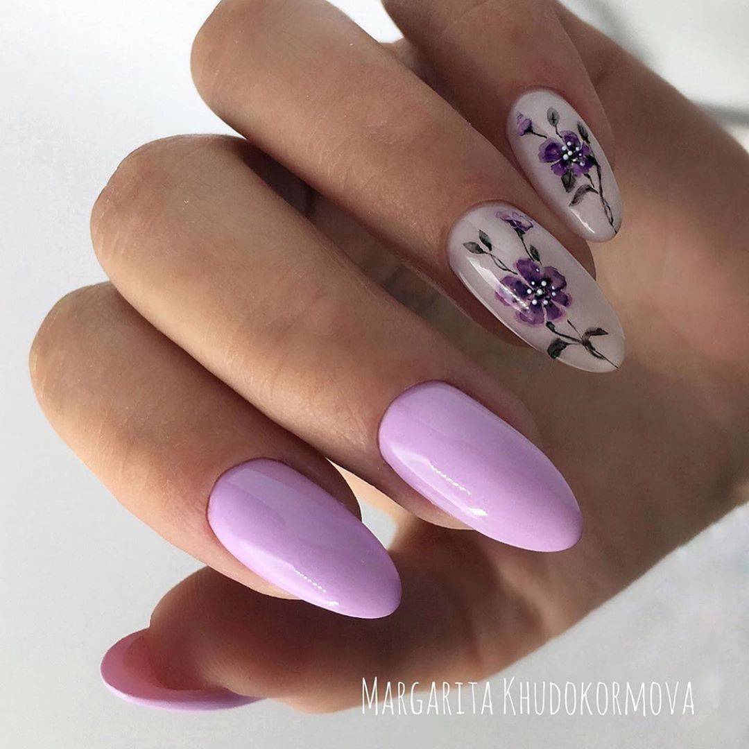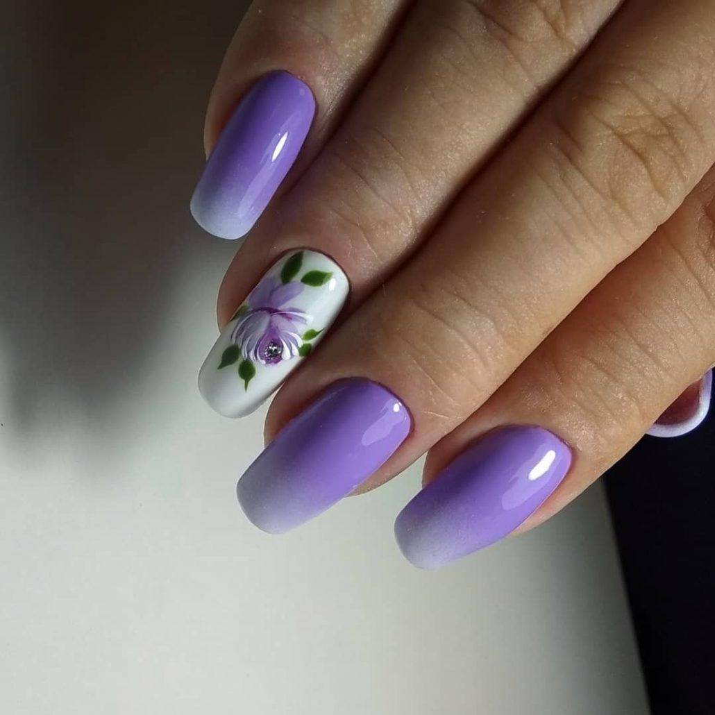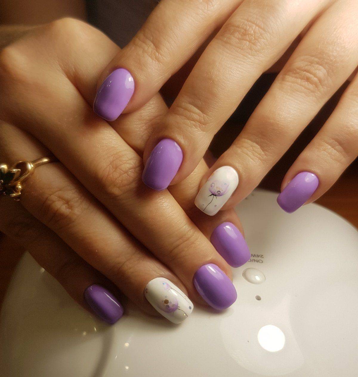 Фиолетовый маникюр – выбор далеко не каждой женщины. Дизайн смотрится очень насыщенно и заметно. Цветочный узор – лучшее, чем можно дополнить фиолетовый оттенок. Цветы гармонично вписываются как в светлые, так и в темные оттенки фиолетового.