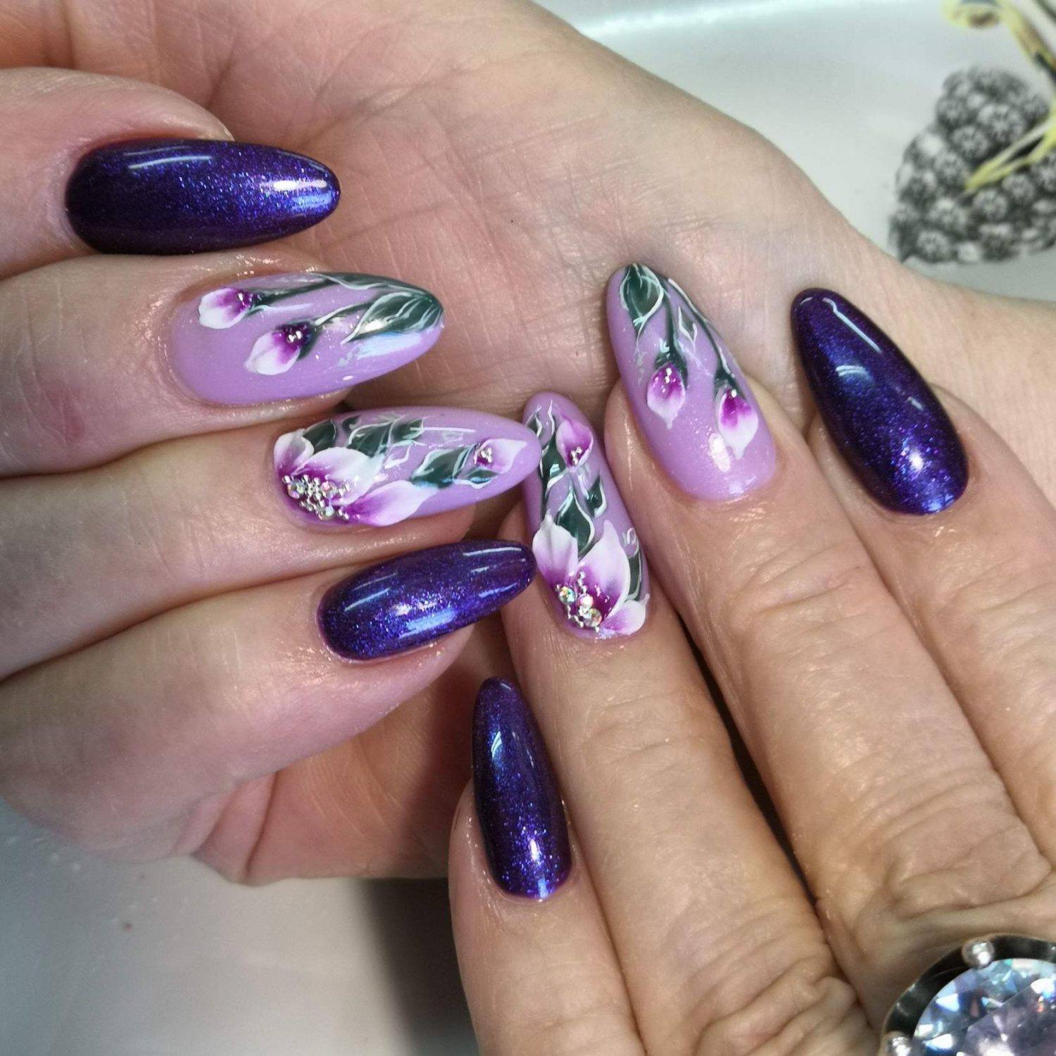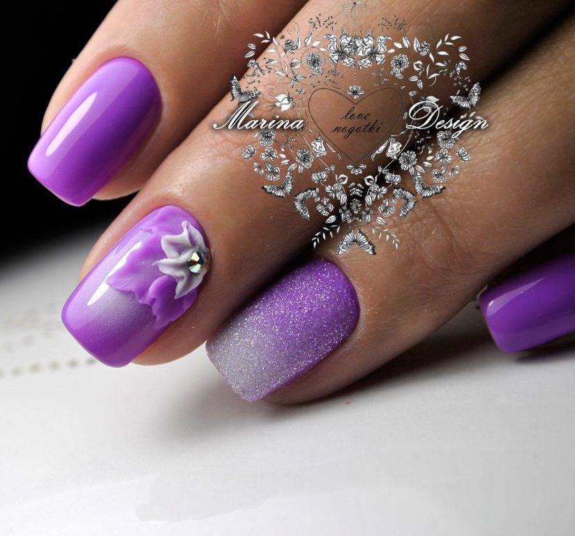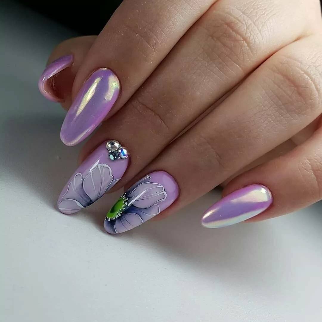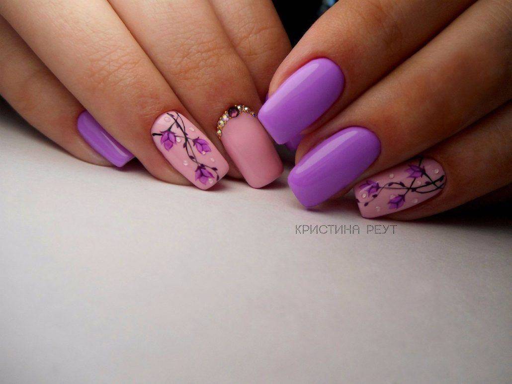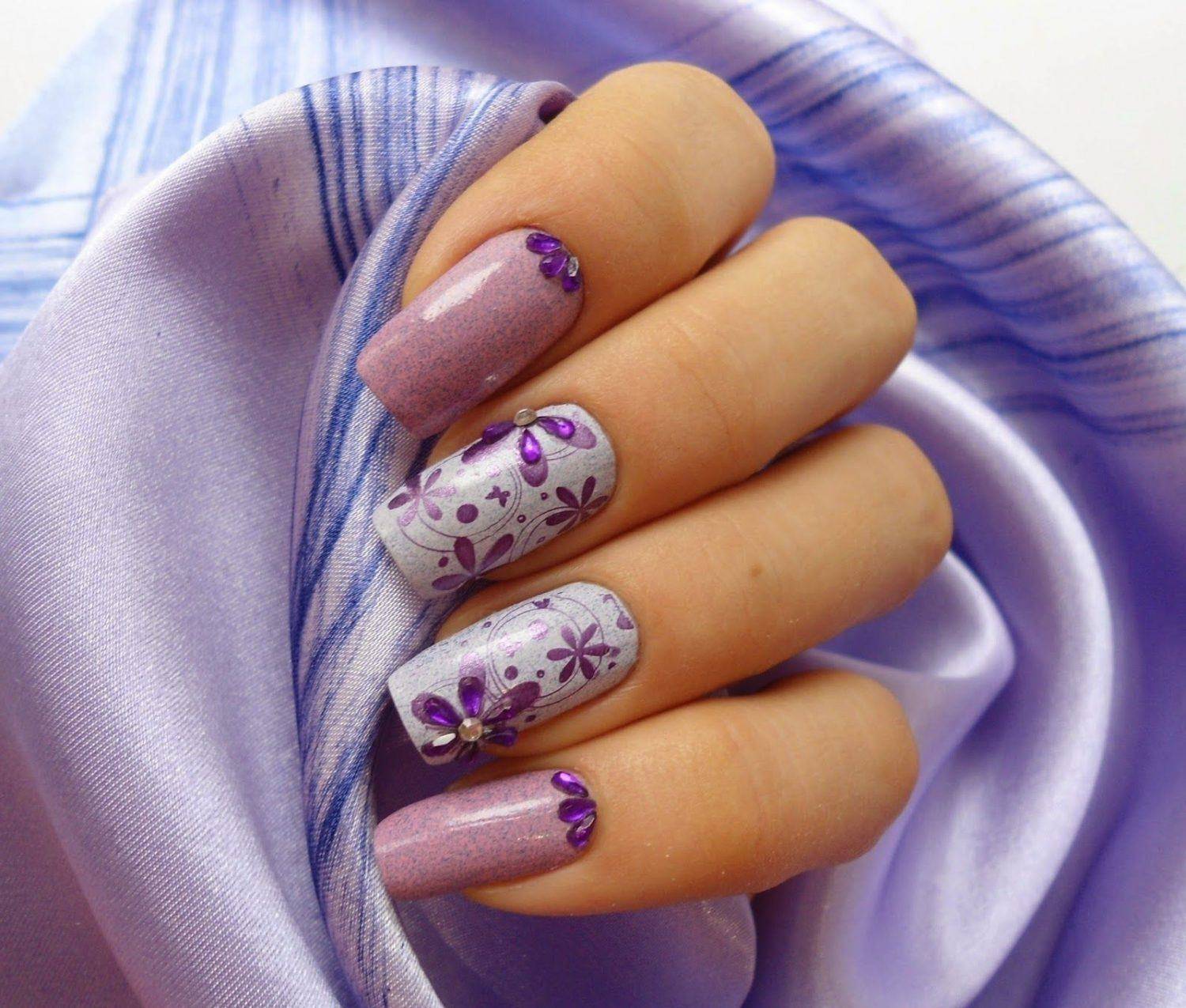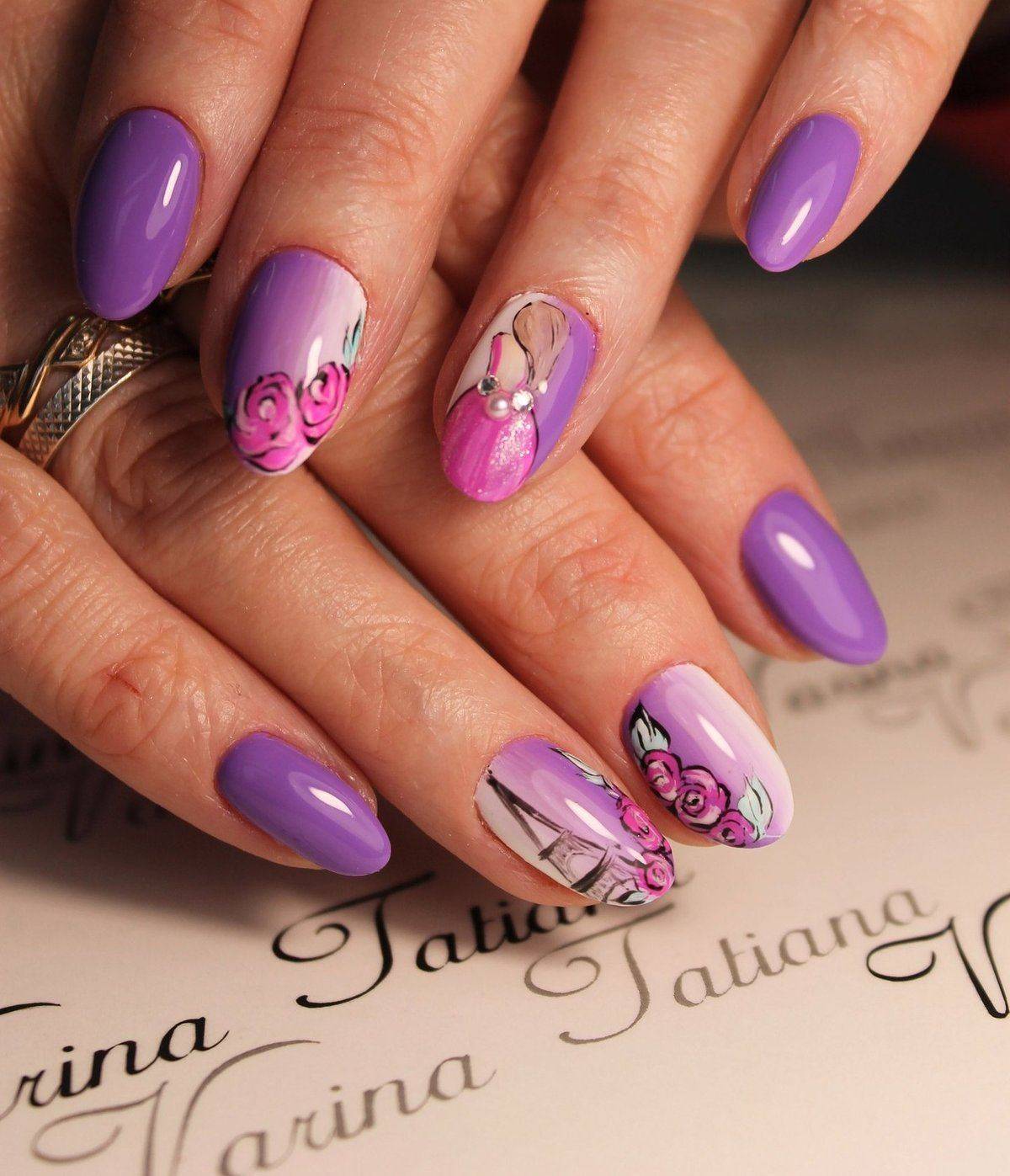 Фиолетовый маникюр – выбор далеко не каждой женщины. Дизайн смотрится очень насыщенно и заметно. Цветочный узор – лучшее, чем можно дополнить фиолетовый оттенок. Цветы гармонично вписываются как в светлые, так и в темные оттенки фиолетового.