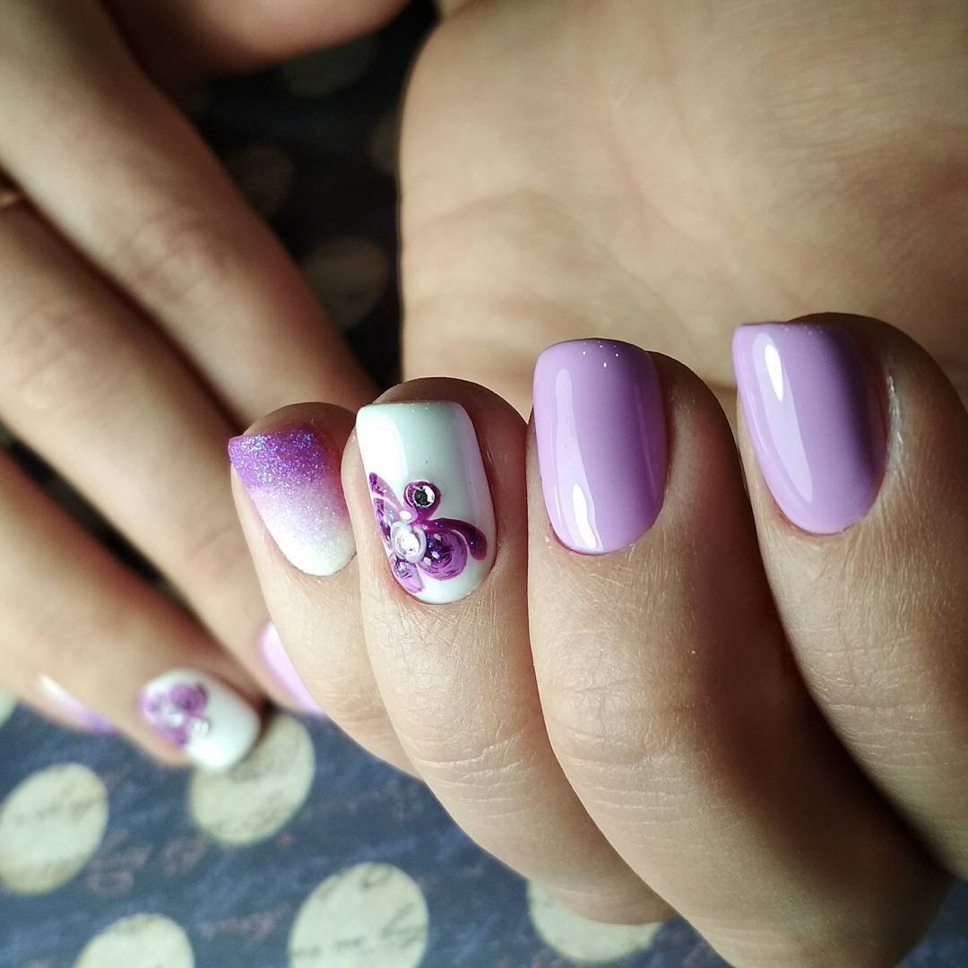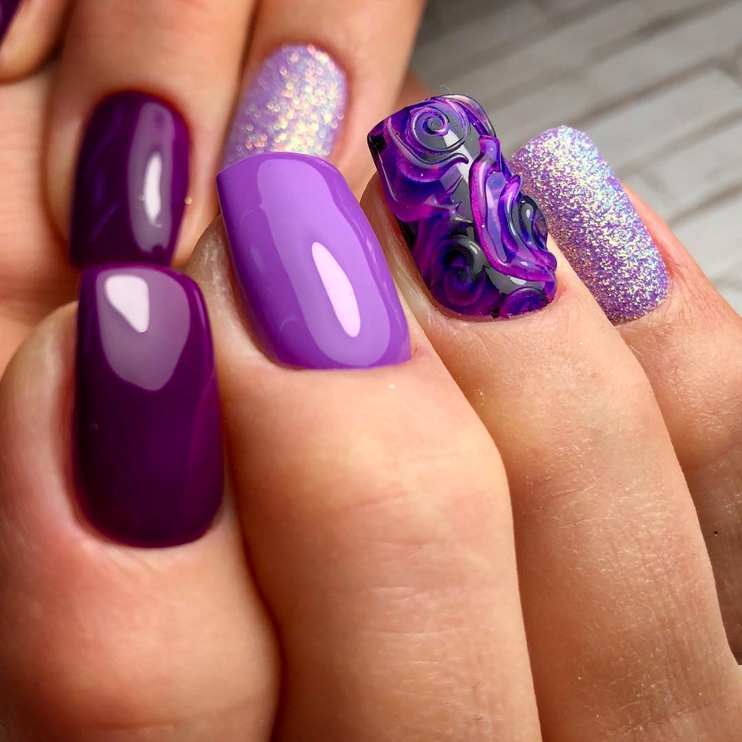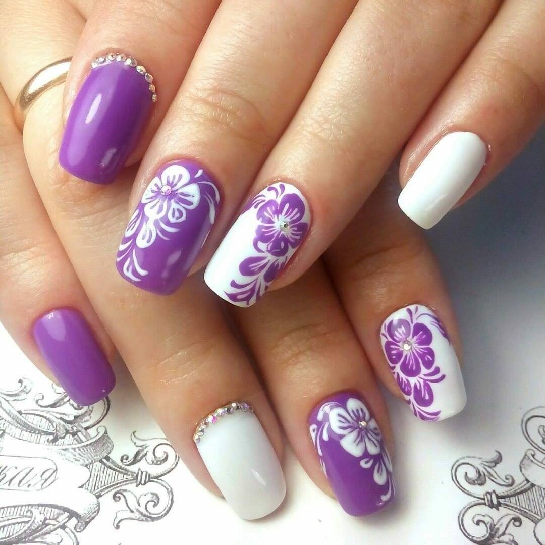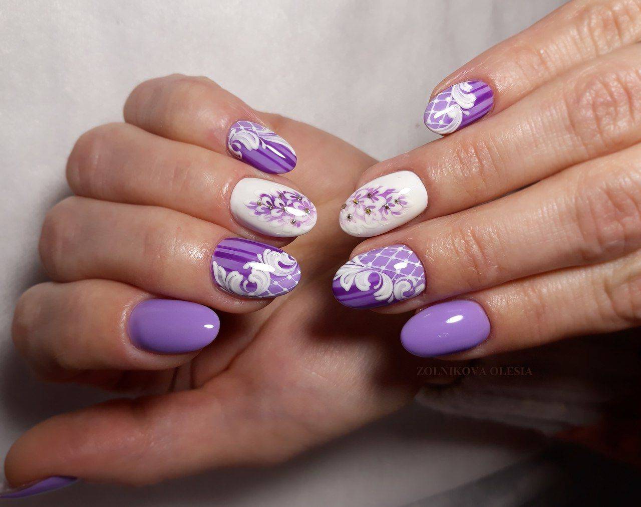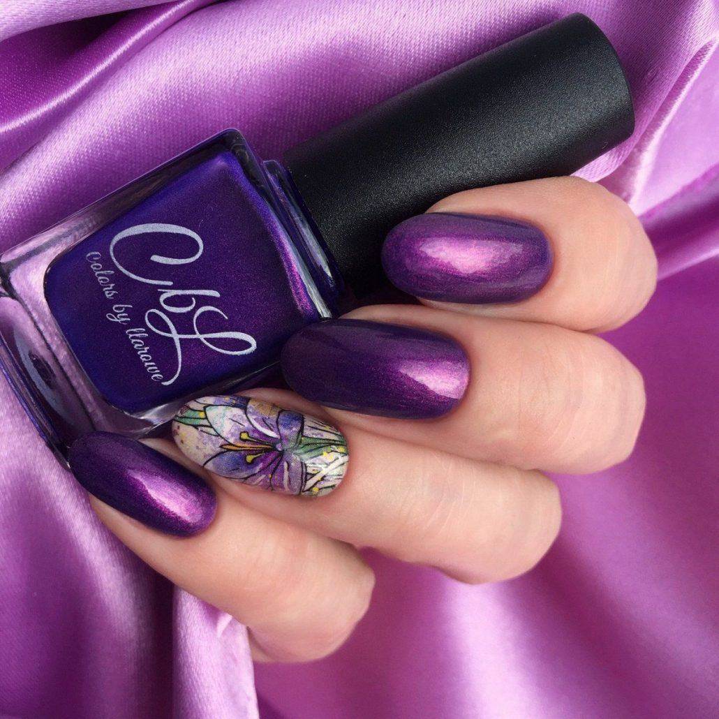 Фиолетовый маникюр – выбор далеко не каждой женщины. Дизайн смотрится очень насыщенно и заметно. Цветочный узор – лучшее, чем можно дополнить фиолетовый оттенок. Цветы гармонично вписываются как в светлые, так и в темные оттенки фиолетового.