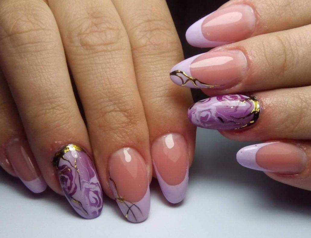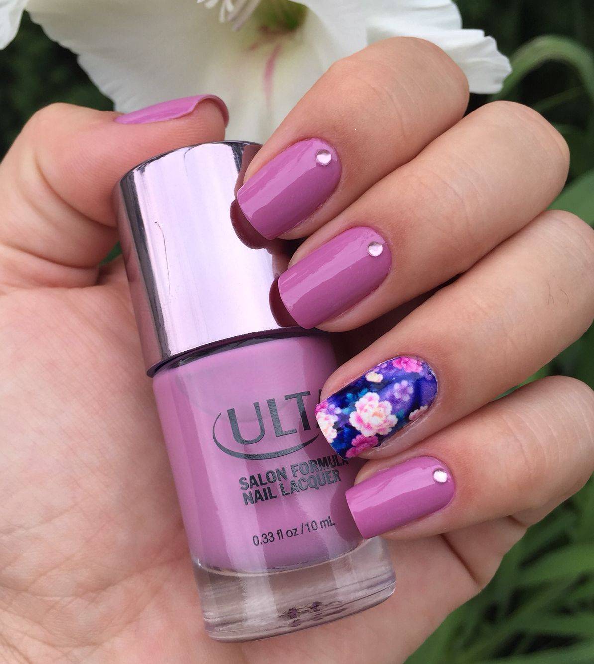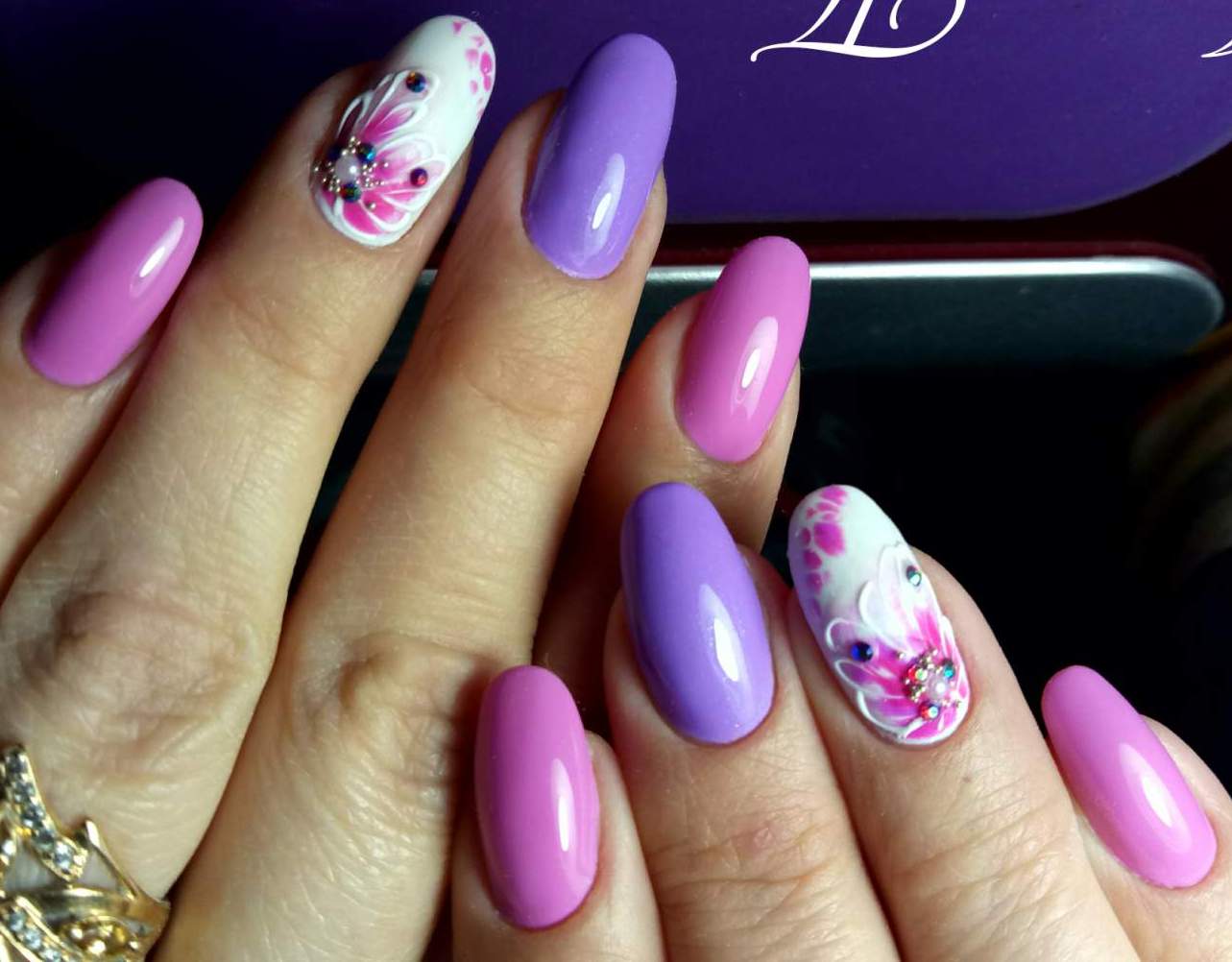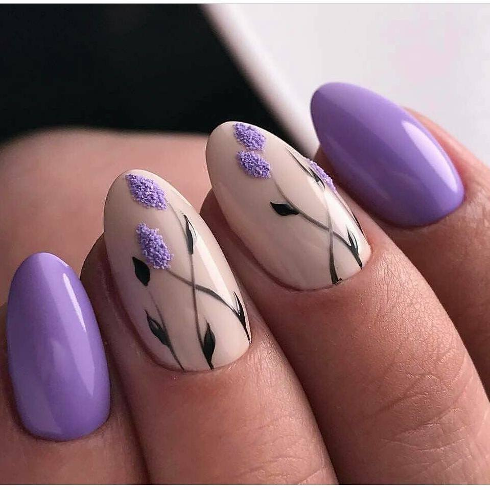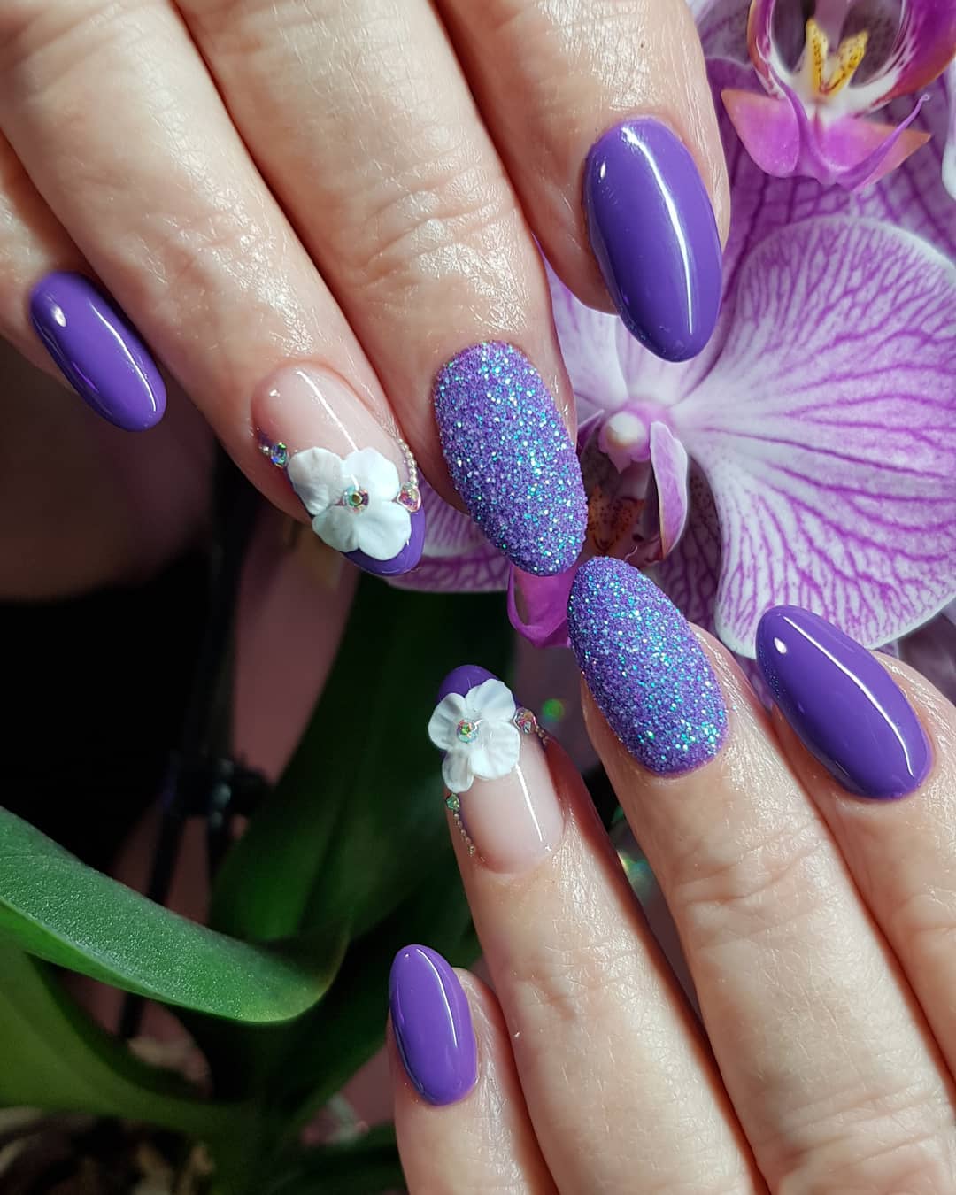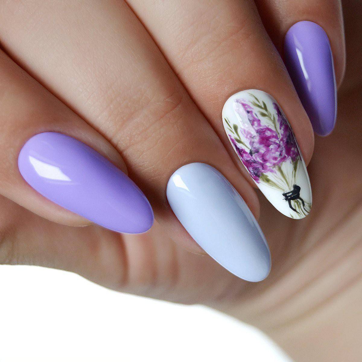 Фиолетовый маникюр – выбор далеко не каждой женщины. Дизайн смотрится очень насыщенно и заметно. Цветочный узор – лучшее, чем можно дополнить фиолетовый оттенок. Цветы гармонично вписываются как в светлые, так и в темные оттенки фиолетового.