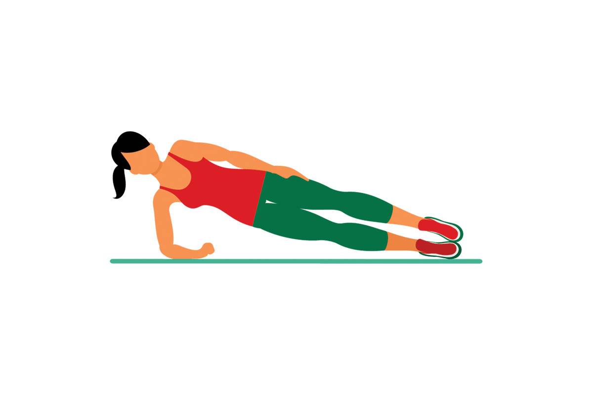 После выполнения динамического упражнения на верхнюю часть тела переходите к статической планке на локтях. Живот должен быть втянут, пресс — напряженным. Задержитесь в положении на 30-45 секунд, сохраняя нормальный ритм дыхания. Повторите 2-3 раза.