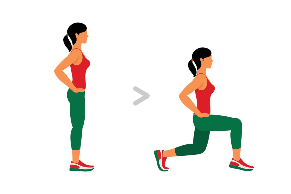 Исходное положение — стоя ровно, ноги на ширине плеч, руки на поясе. На вдохе совершите шаг вперед, одновременно сгибая ногу в колене. Следите за тем, чтобы корпус оставался вертикальным. На выдохе вернитесь назад, затем повторите для другой ноги.