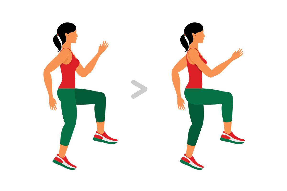 Одно из наиболее мощных кардио упражнений домашней программы тренировок. Совершайте попеременные подъемы согнутых в коленях ног как можно выше — для баланса помогая руками. Держите пресс в напряжении, а также следите за циклами вдоха и выдоха, стараясь дышать быстрее.