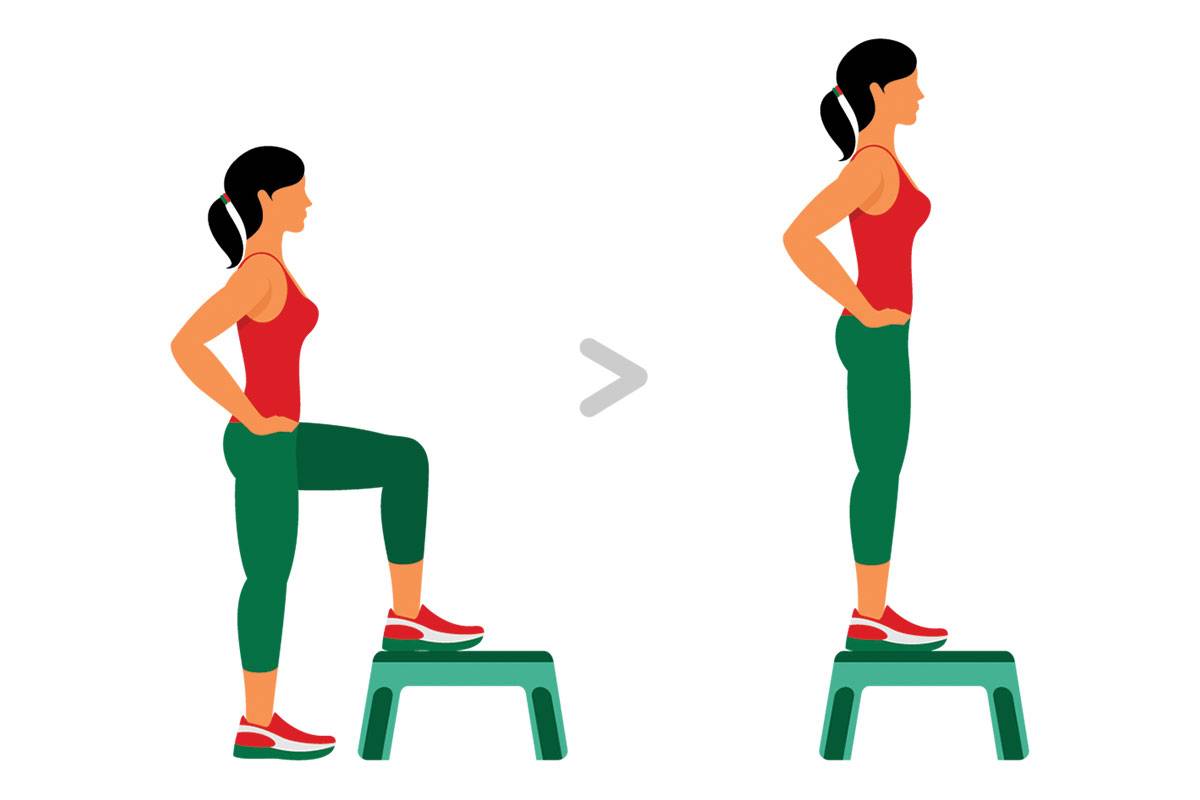Одно из наиболее простых, но при этом эффективных, упражнений для средней ягодичной мышцы. При выполнении в быстром кардио режиме делает мышцы более упругими, усиливая циркуляцию крови и помогая сжигать жир. Поочередно зашагивайте на возвышение, сохраняя пресс в напряжении.