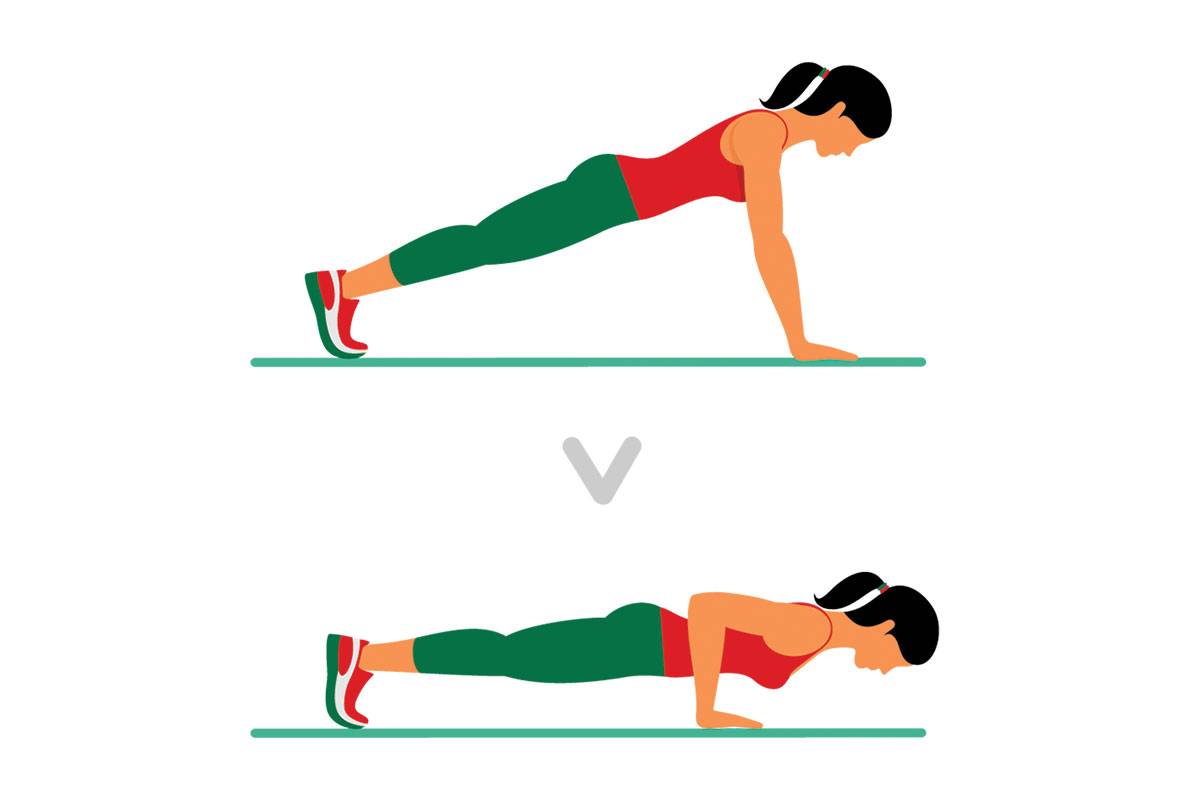 Исходное положение — планка на вытянутых руках. На вдохе медленно опуститесь вниз — руки на уровне пояса, локти под углом 45 градусов к корпусу. Пресс напряжен, позвоночник прямой. На выдохе резко оттолкнитесь руками вверх (это повысит кардио эффективность), затем задержитесь в верхней точке. Повторите 12-15 раз.