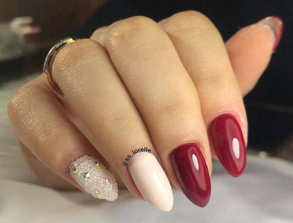 На ногти формы миндальных орехов подходит очень много дизайнов. Но, кто бы что не говорил, стразы и блестки – это одна из любимых частей украшения всех модниц. Не нужно очень много, просто акцентировать несколько ногтей.