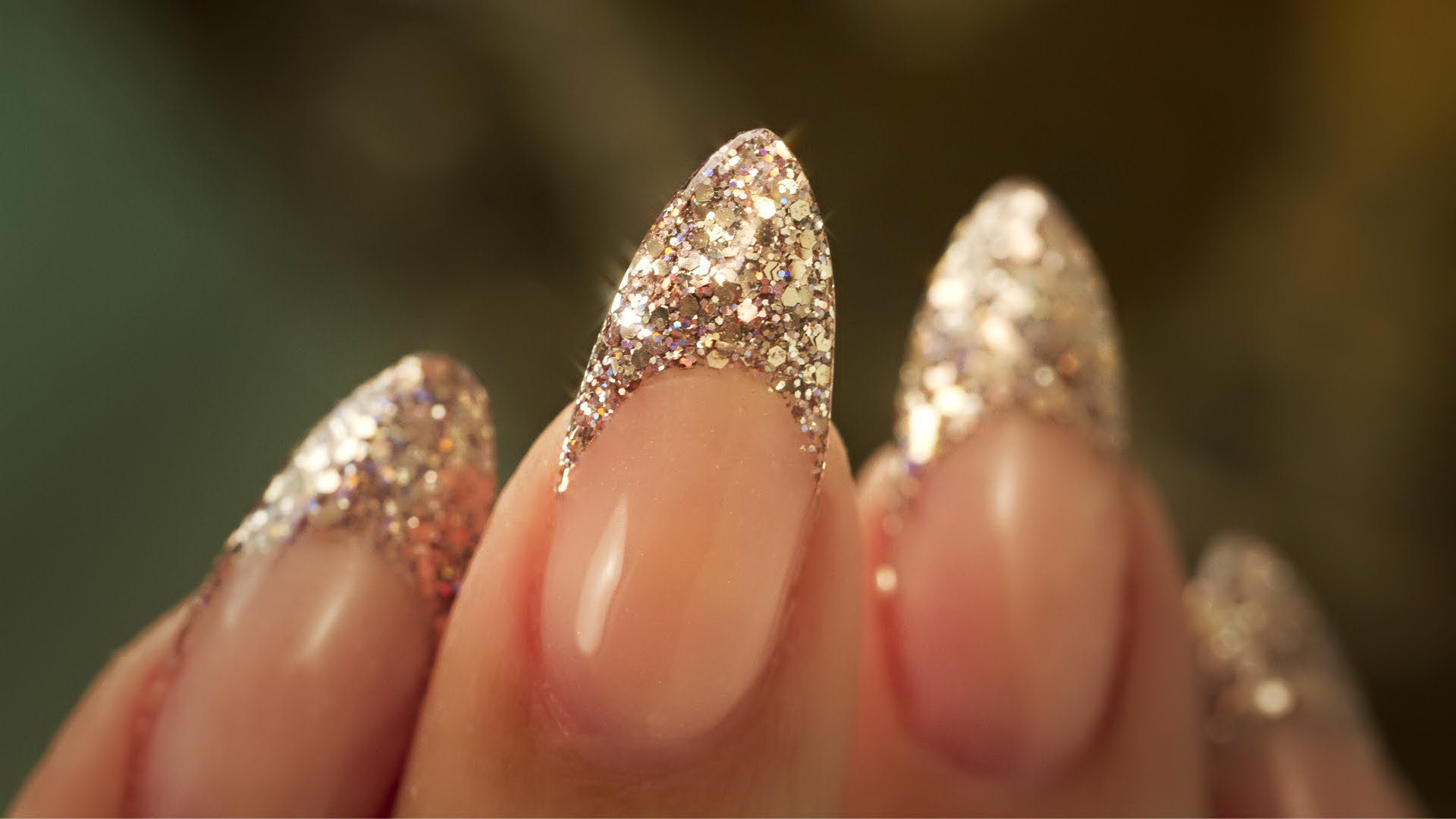 - Глиттеры. После основного покрытия можно нанести на 1-2 ногтя на руке прозрачный гель-лак с блестками. Так классика смотрится более празднично.