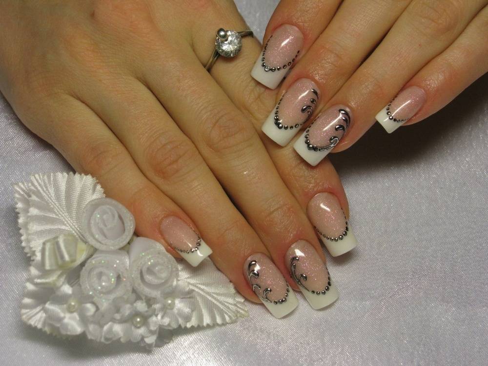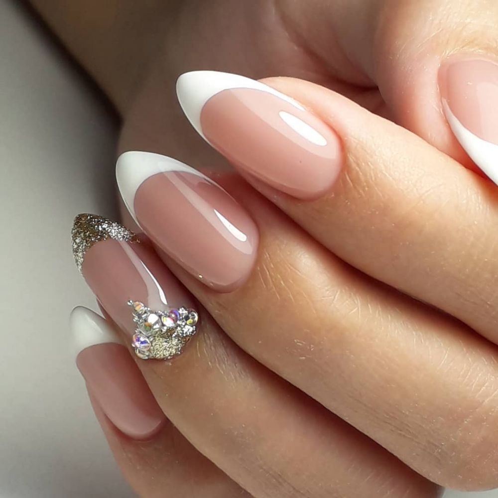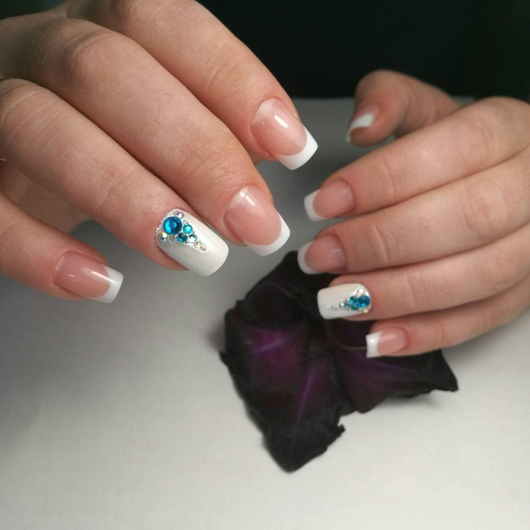 Оформление френча в белом цвете остаётся актуальным во все времена, поскольку белый цвет в нейл-индустрии выполняет роль базового. Благодаря именно этому качеству дамы рискнули немного поэкспериментировать и дополнить маникюр разнообразными видами страз. Для его создания на ногтевую пластину наносится прозрачное, бледно-розовое, персиковое или нюдовое покрытие в качестве основы, а кончик ногтя окрашивается тонкой белой полоской в виде улыбки. Стильно, сдержанно и безумно нежно. Стразы можно расположить непосредственно по линии «смайлика», а можно выложить с их помощью полумесяц или несложный узор в прикорневой зоне. Не менее привлекательно будет смотреться вариант с полным покрытием стразами акцентного ноготка или шармы на белой основе безымянного пальца.