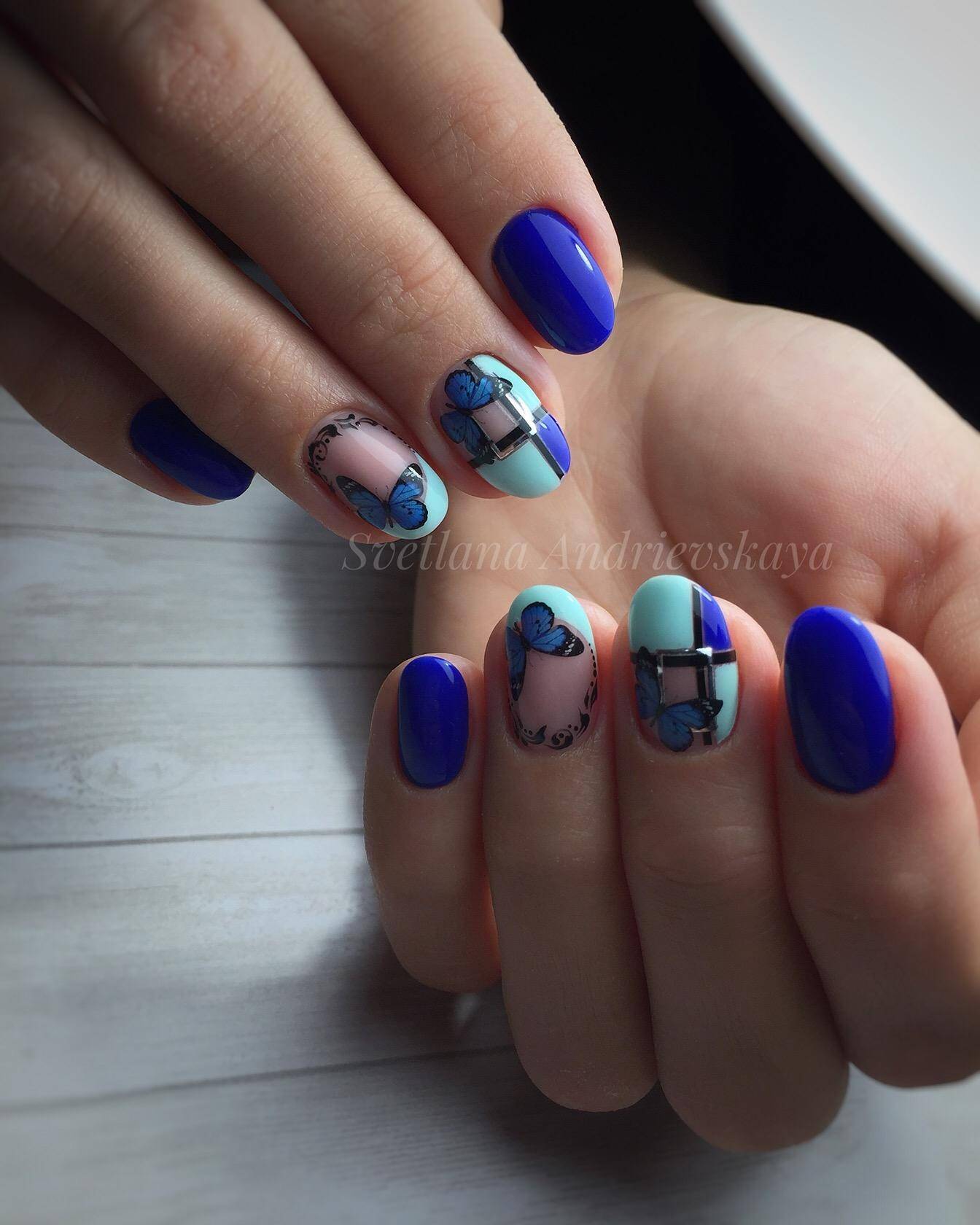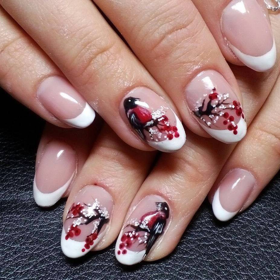 Не менее привлекательно на фоне французского маникюра смотрятся изображения бабочек или стрекоз. В основном они яркие, смелые и буквально созданы для привлечения внимания. Тщательная прорисовка деталей помогает добиться натуральности оформления. А стразы и блестки, размещенные на крылышкам, в основном служат изящным украшением дизайна. В основном такие варианты выбирают в весенне-летнем сезоне. Но при желании всегда можно добавить немного экспериментов и в холодное время года.