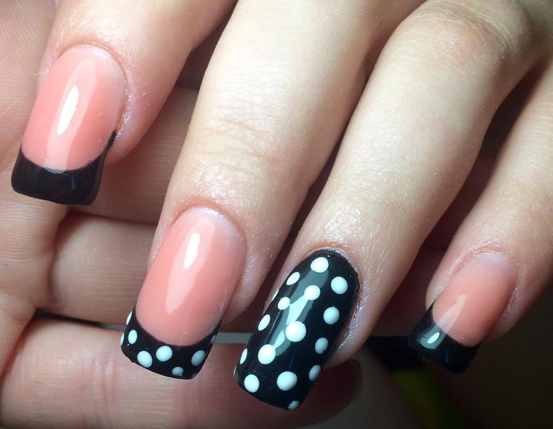 - точки – если классическая форма «улыбки» вам уже надоела, то присмотритесь к нейл-артам, где край ногтевой пластины выделен миниатюрными точками. Такой вариант выручит в том случае, если под рукой нет наклеек для френча и маникюрной кисти. Точки выполняются с помощью дотса.