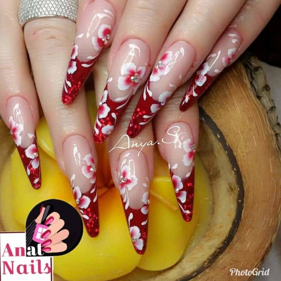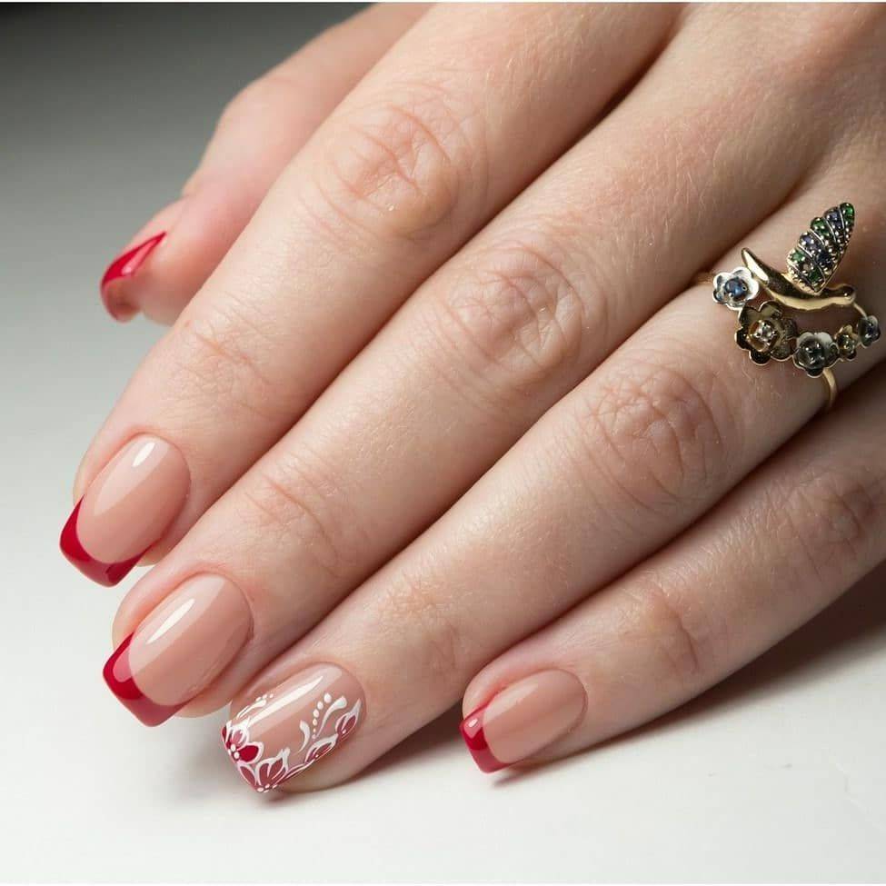 Что касается покрытия в красном цвете, то его чаще всего выбирают для посещения мероприятий. Столь яркий френч можно дополнить дизайном в виде абстракции, кружева, геометрии или цветочного рисунка. Каждый из них по-своему хорошо украшает классику. Дополнительный декор в данном случае все также уместен. Поскольку многое зависит от размера блесток и их количества. Цвет таких деталей лучше выбирать исходя из наряда, который вы планируете надеть на торжество. Наибольшей популярностью пользуются золотистые и серебристые блестки. Считается, что они всегда будут уместными.