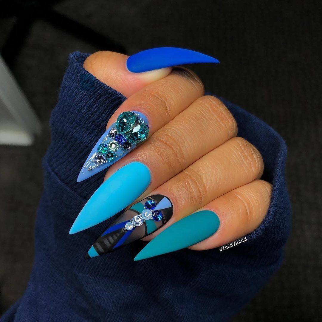 Каждый мастер индивидуально подбирает размер и расцветку камней в зависимости от основного оттенка гель-лака, длины ногтей и предпочтений самой модели. Какие бы камни, оттенки или декор вы ни выбрали, стоить помнить, что на острых ногтях нужно придерживаться стиля минимализм, чтобы не получить вульгарный и вызывающий дизайн.
