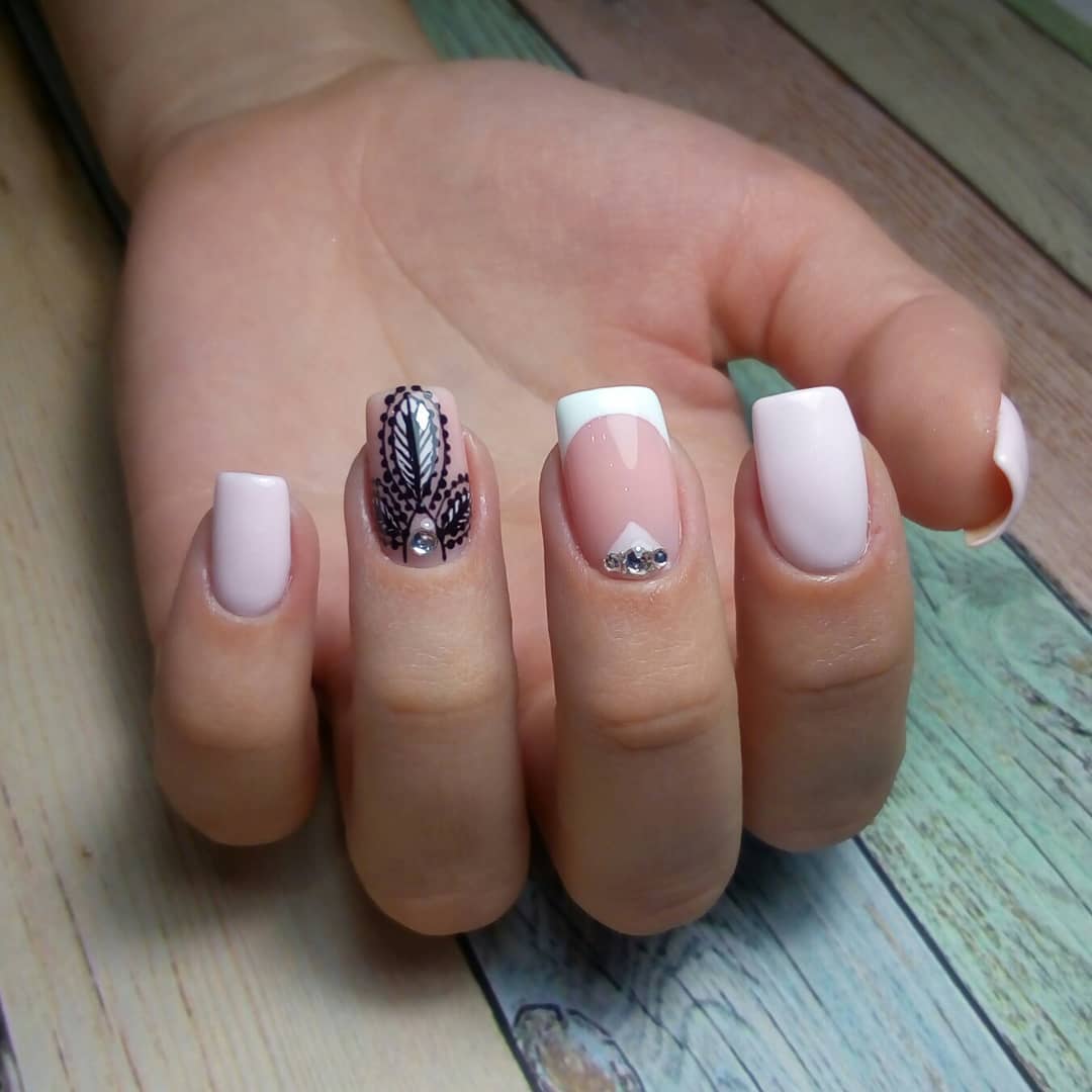 Популярность страз в нейл-дизайне можно сравнить только с рисунками, поэтому сочетание во французском маникюре этих дополнений можно назвать очень актуальным решением. Разнообразные рисунки идеально впишутся как в классический, так и в любой другой вид дизайна. Изображения могут располагаться на одном-двух ноготках или наноситься все пальчики. Среди популярных эскизов можно выделить флористику, геометрические формы, кружевные узоры, часто выполняющие роль «смайлика», а также абстрактные композиции, сезонные изображения и тематические рисунки, которыми украшают ноготки для определённых праздников или торжественных событий. Что касается декора, то благодаря разновидности страз можно освежить и преобразить любые зарисовки. Для вечернего образа приемлемы сложные композиции с крупными камнями, которые располагаются непосредственно на рисунке. При создании повседневного маникюра будет достаточно нескольких элементов. Всё зависит от вашего предпочтения и желаемого результат.