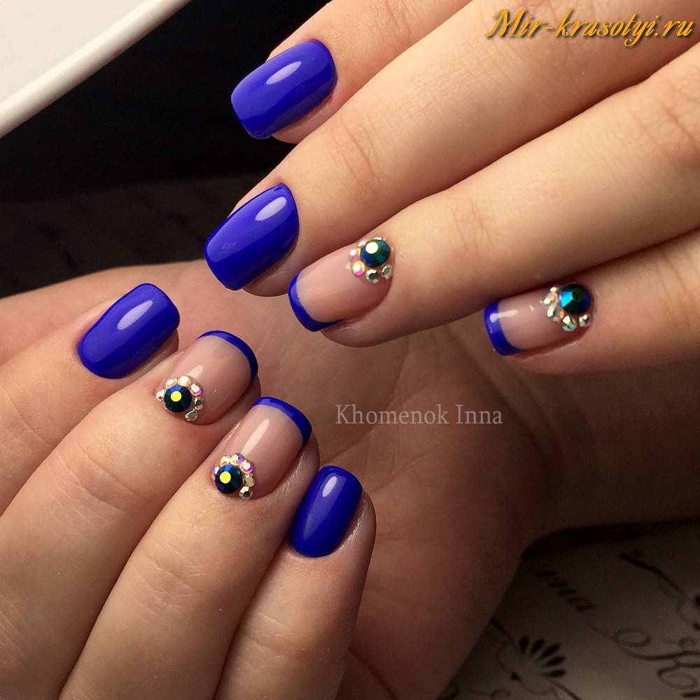Линия улыбки конечно в таких вариантах должна оставаться белой, но может изменять свою форму и быть скошенной, треугольной, двойной или ажурной. Сверкающие элементы декора актуально располагать по кончику ноготка или у его основания. Очень симпатично смотрится идея с декорированием стразами акцентного ноготка, когда вместо френча можно украсить пальчик рисунком либо однотонным дизайном в тон улыбки или фигурирующего цветного лака.
