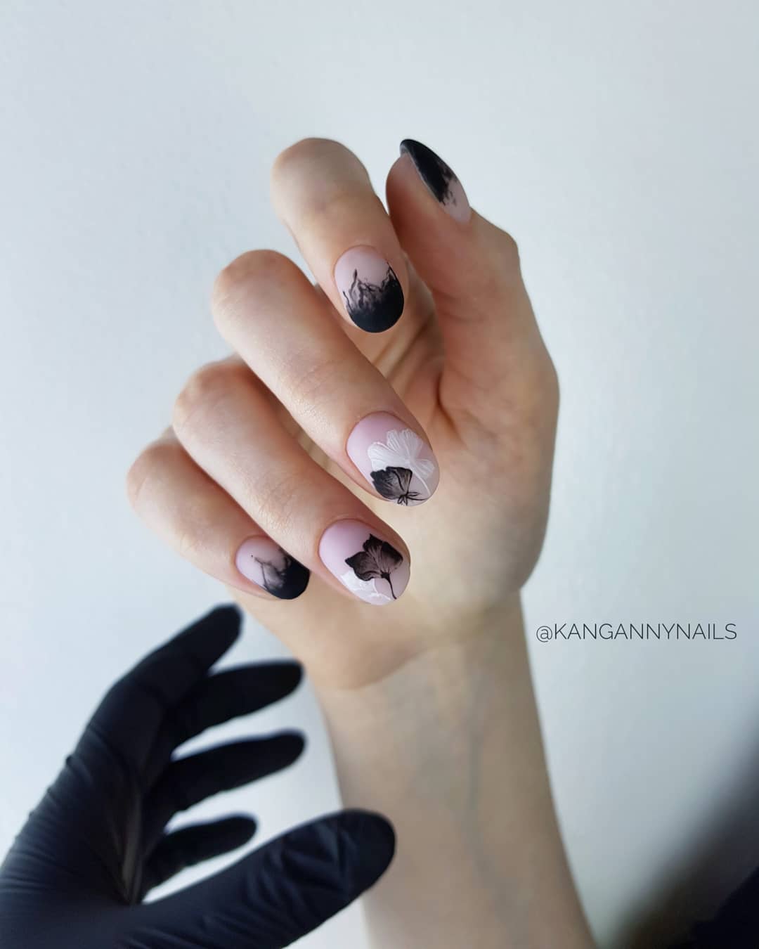 Цветочный принт считается одним из самых популярных узоров, которыми пользуются романтичны барышни, ведь цветы – это символ женственности и нежности. Букетом белых роз или веточкой сакуры можно украсить все ноготки либо же преобразить один-два пальчика. Во всяком случае, самостоятельно выполнить такой вид маникюра не так уж просто. Для облегчения задачи следует приобрести несколько трафаретов и наклеек, и можно будет творить без ограничений.