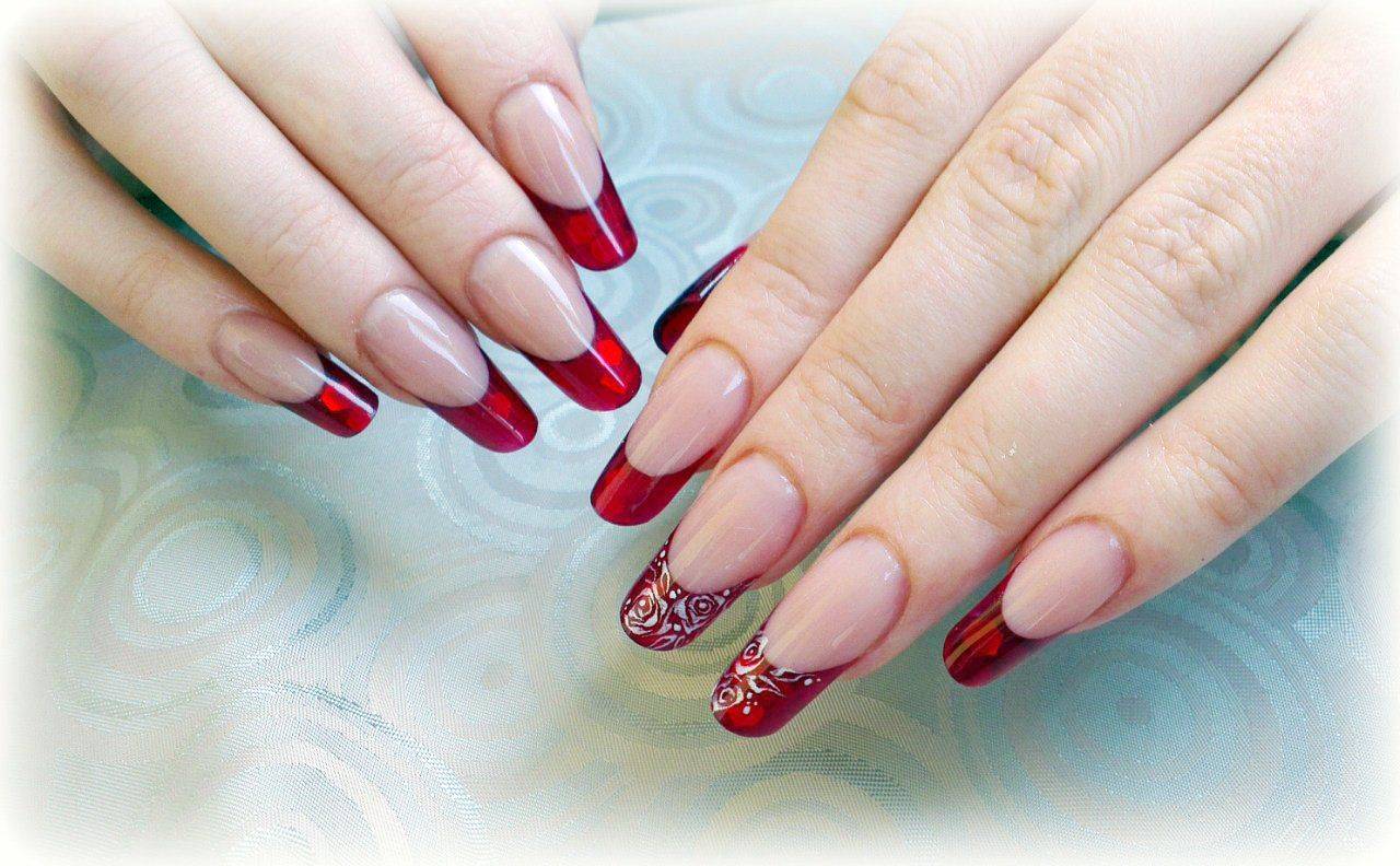 Длинные ноготки и французский маникюр в красно-белом цвете