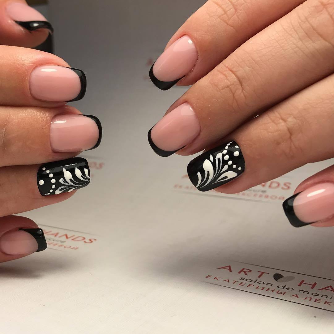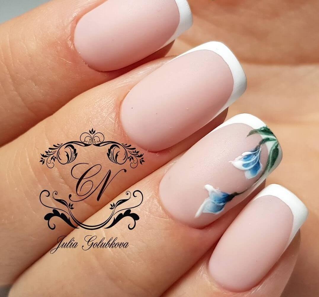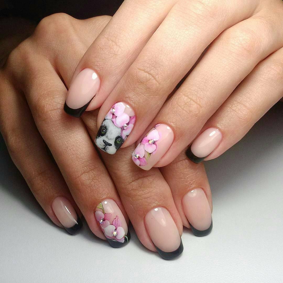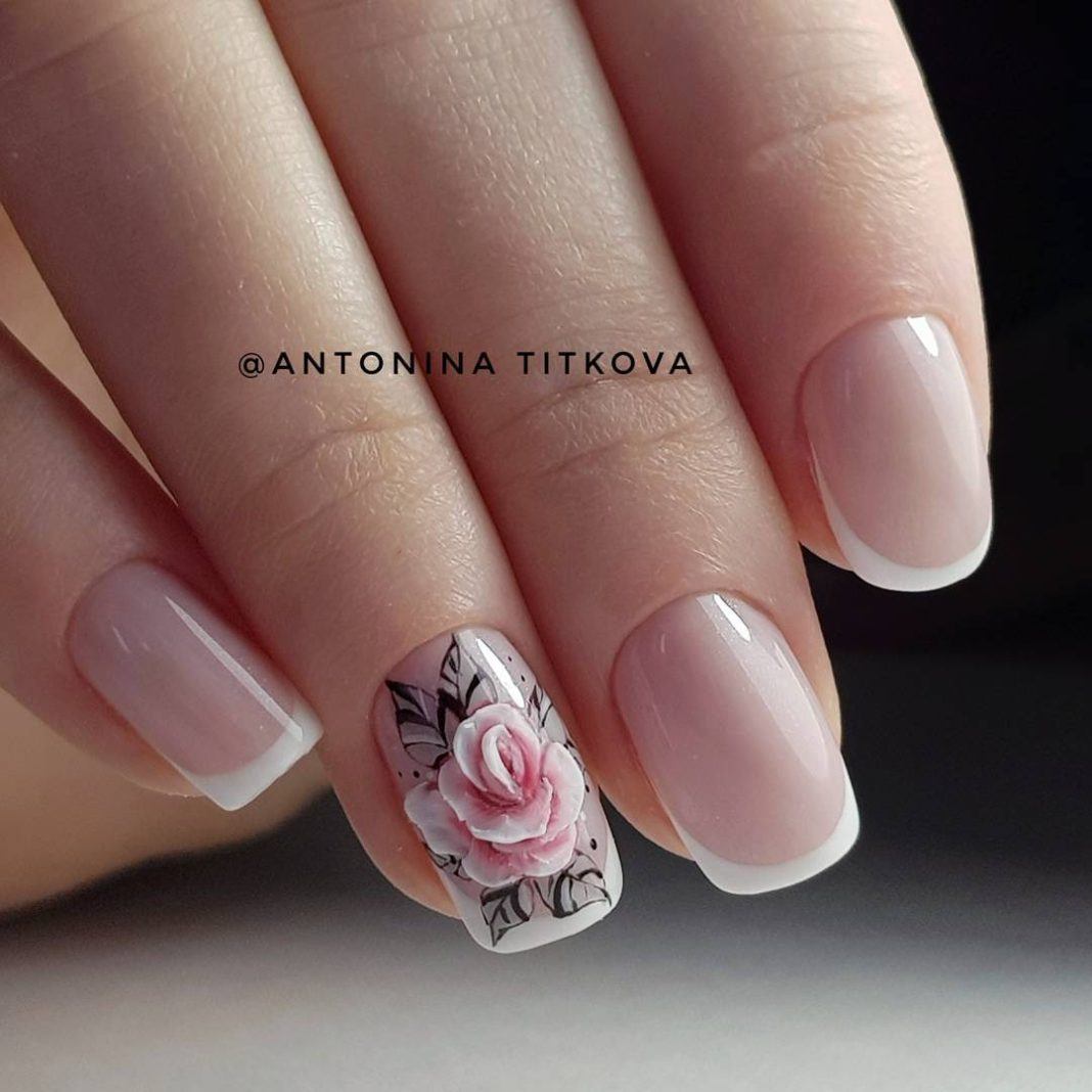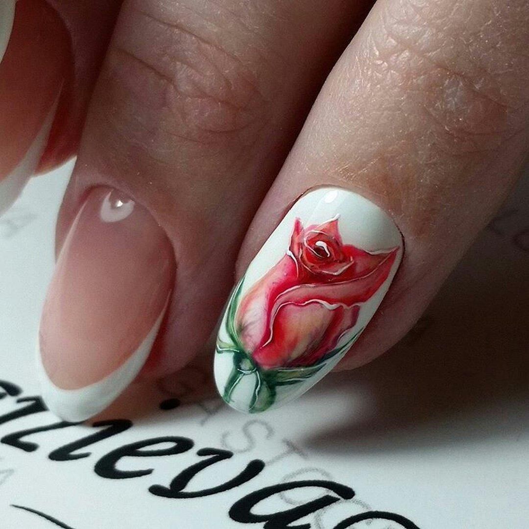 Стильно выглядят небольшие рисунки по линии «смайлика» — например, цветочные. Отдельные ноготки можно украсить масштабными композициями, занимающими всю ногтевую пластину