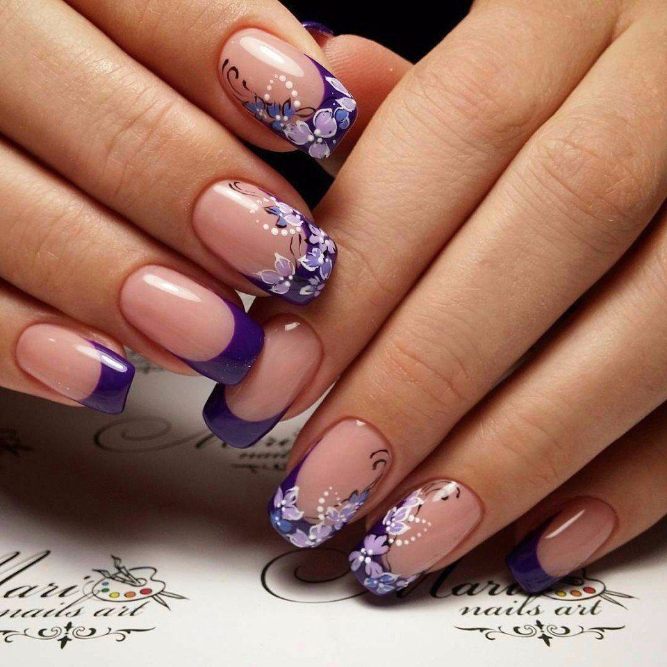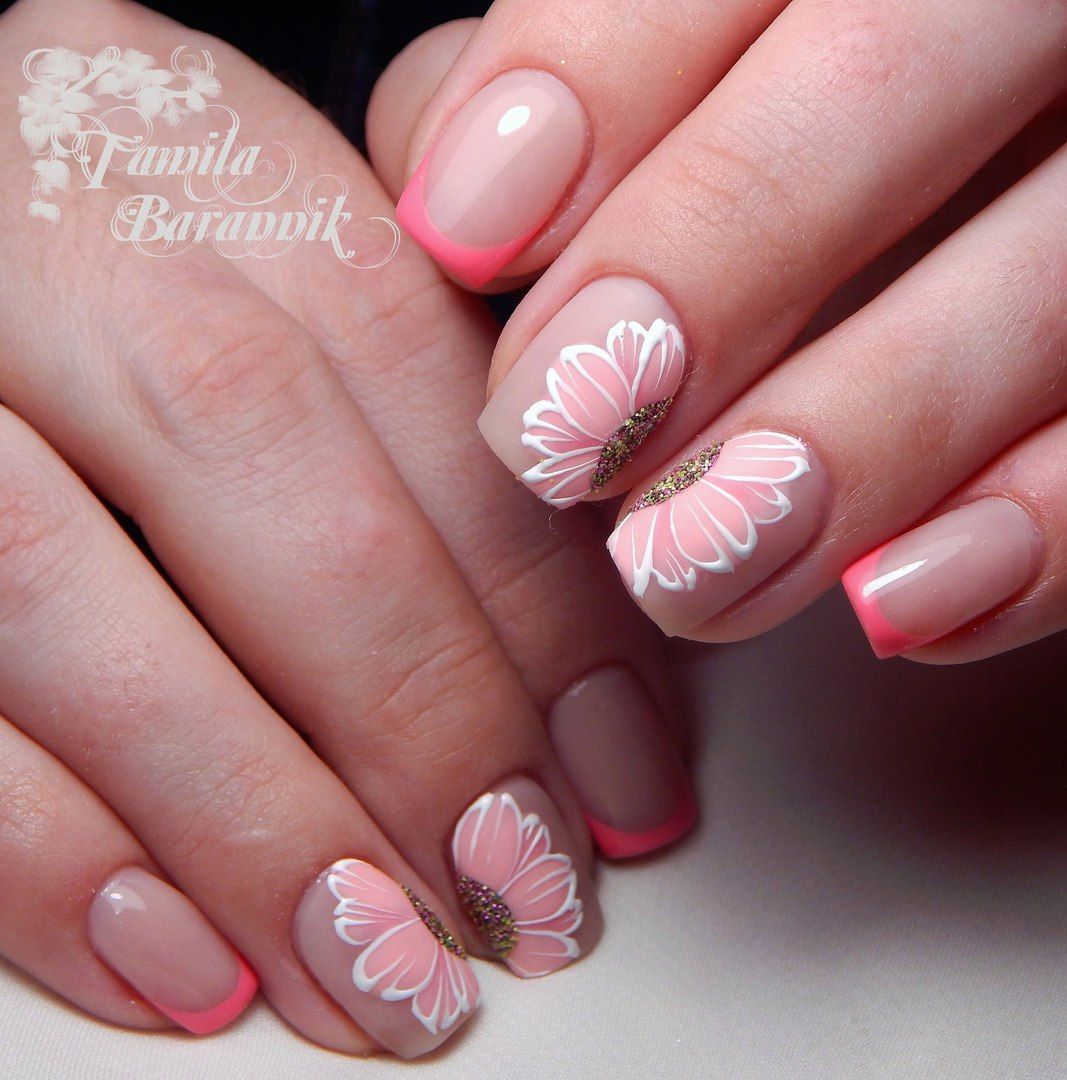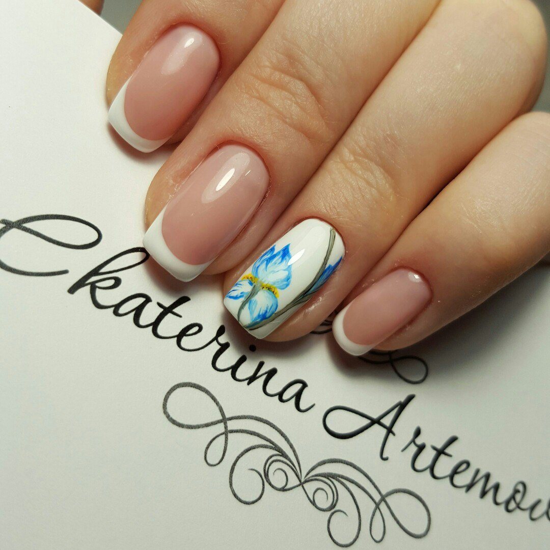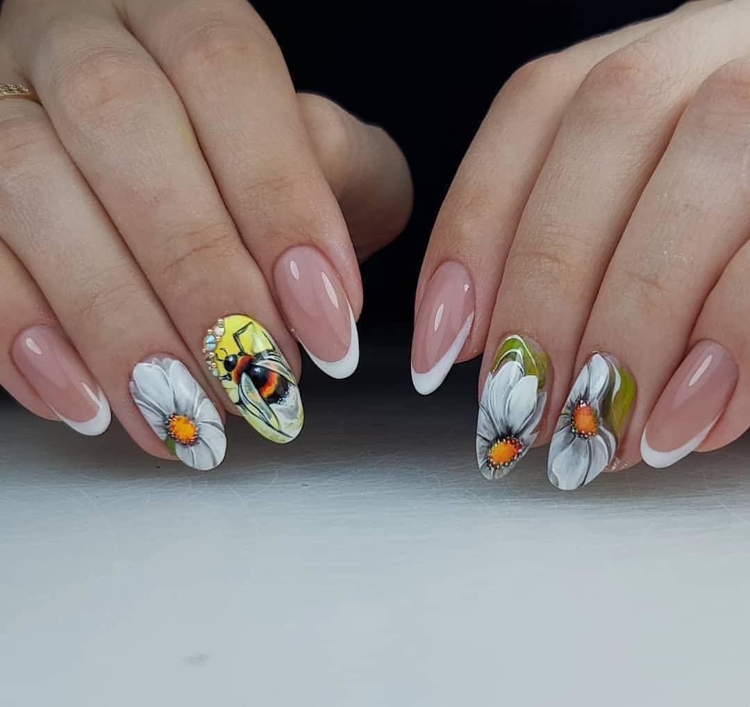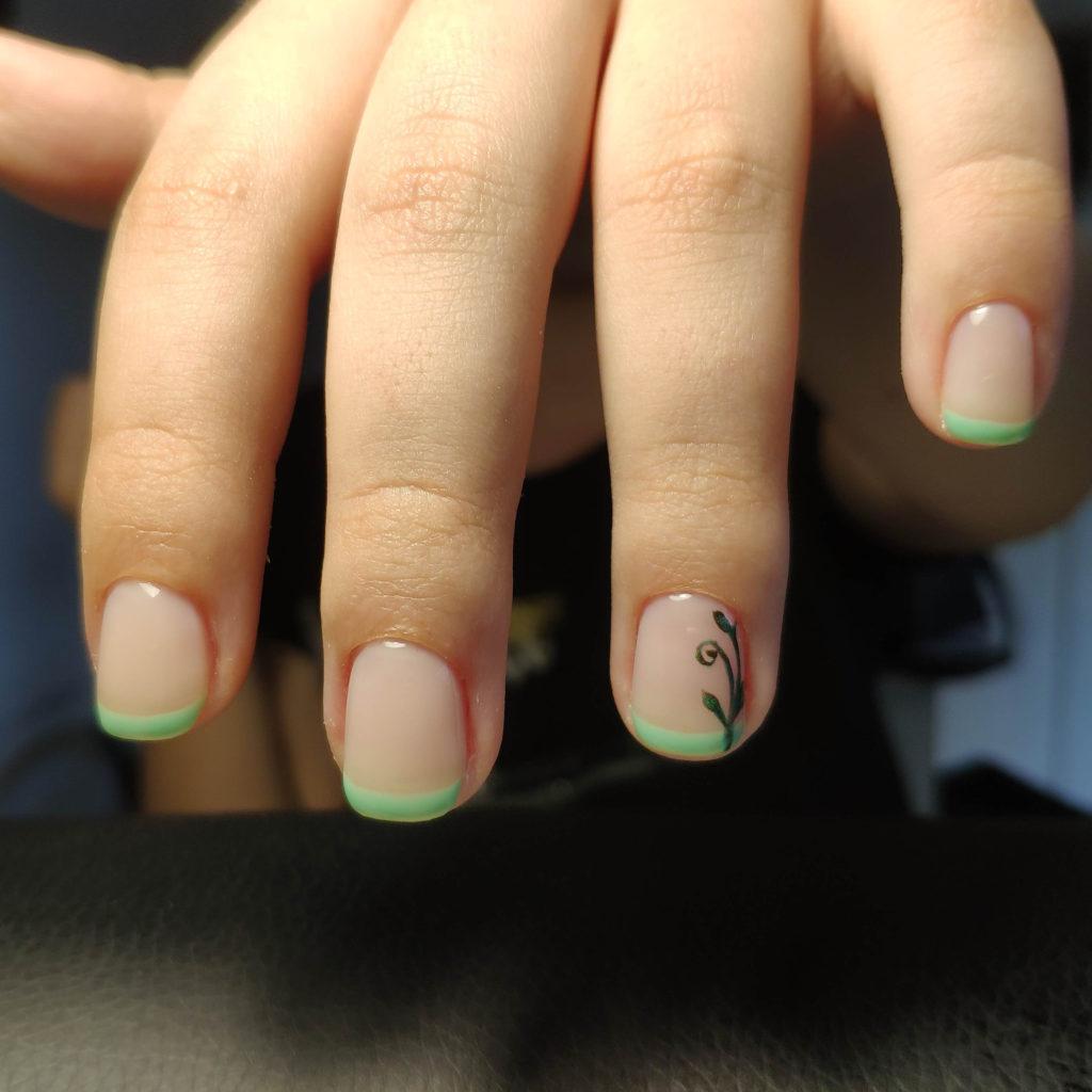 Стильно выглядят небольшие рисунки по линии «смайлика» — например, цветочные. Отдельные ноготки можно украсить масштабными композициями, занимающими всю ногтевую пластину