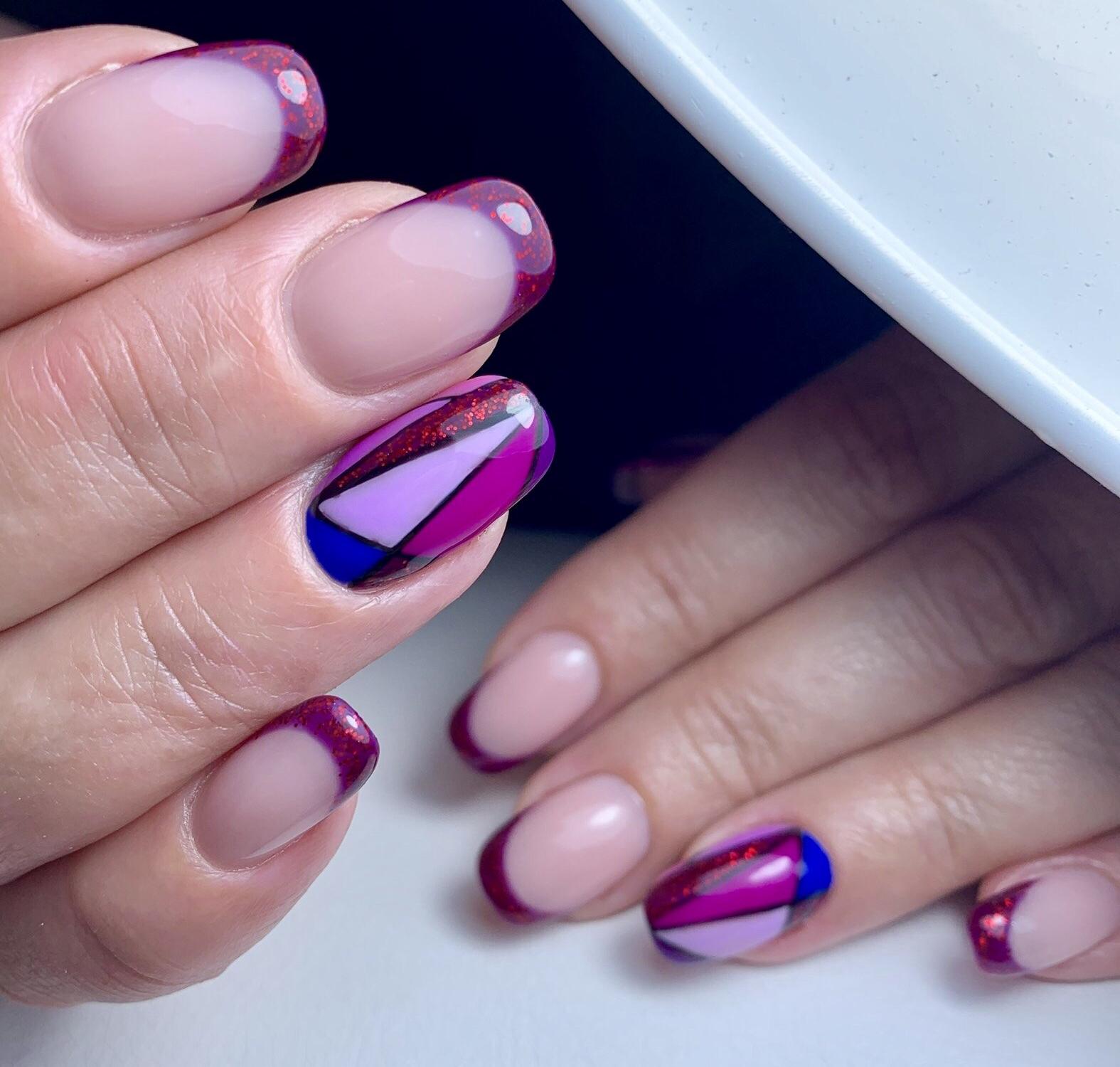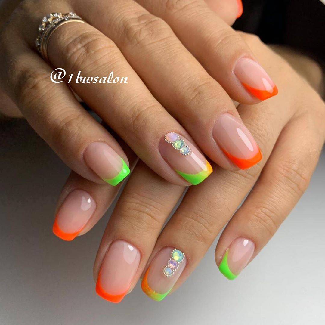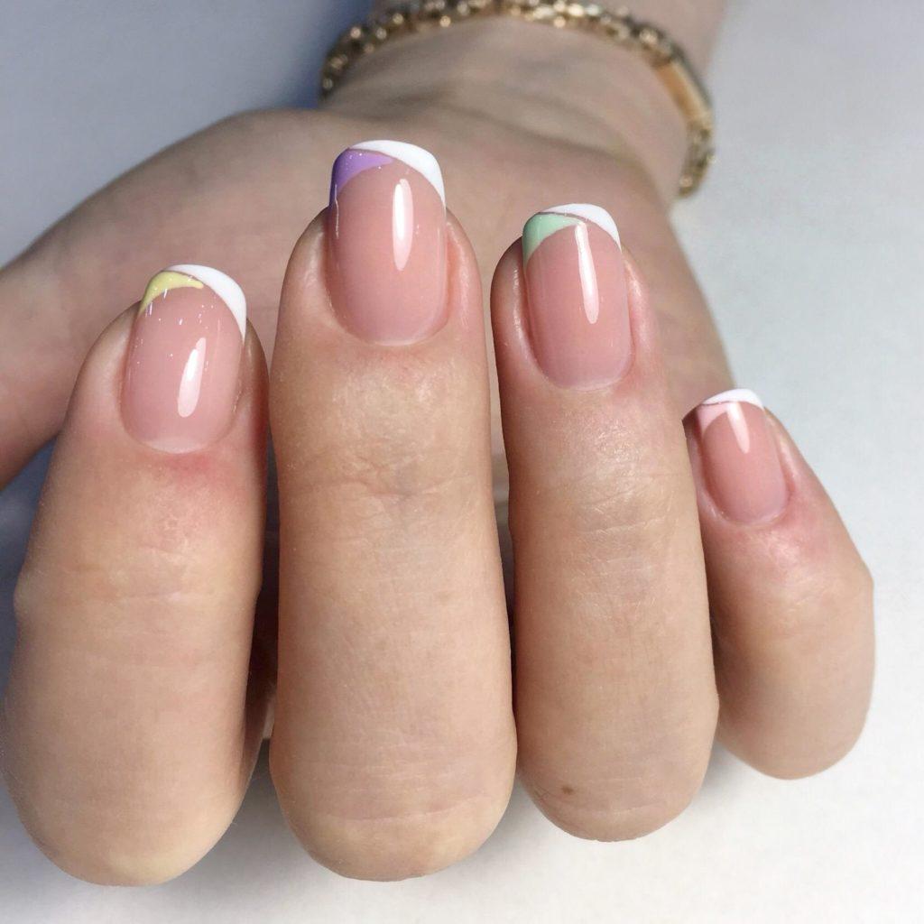 Вариант цветного френча. В таком маникюре один цвет плавно перетекает в другой, четкой границы между ними нет. Этот нежный френч идеально подходит для коротких ноготков.