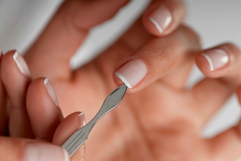 Далее вымойте руки с мылом и хорошенько просушите их. Подпилите ноготки таким образом, чтобы они смотрелись ровными и одинаковыми. В дальнейшем у вас такой возможности не будет. Отодвиньте кутикулу специальной лопаткой или обрезанным краем апельсиновой палочки. Многие предпочитают обрезать кутикулу маникюрными ножницами или специальной заостренной лопаткой.