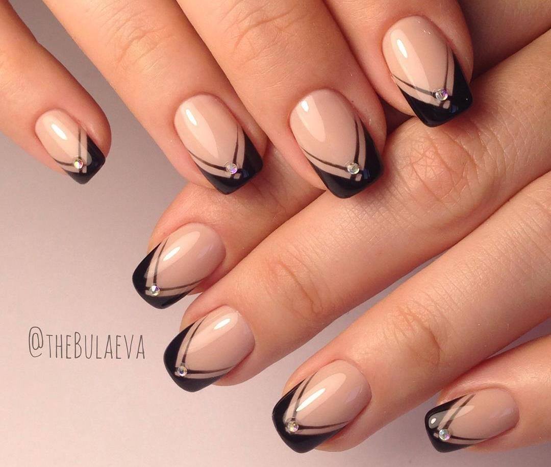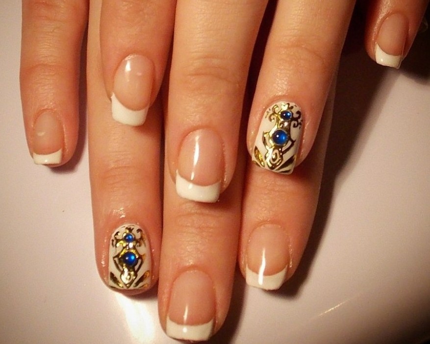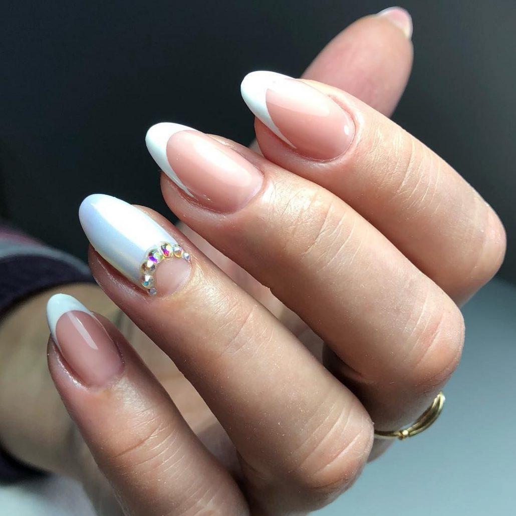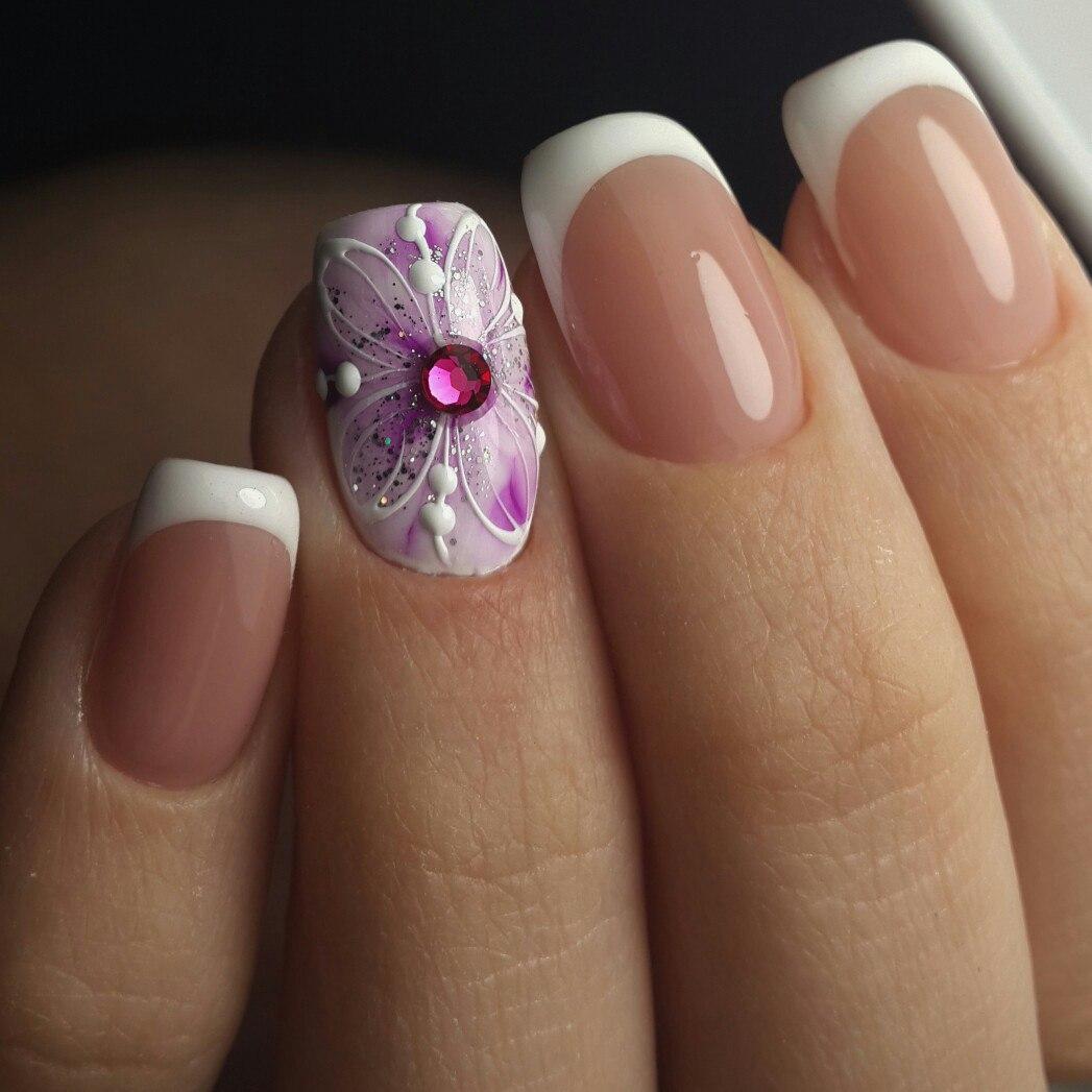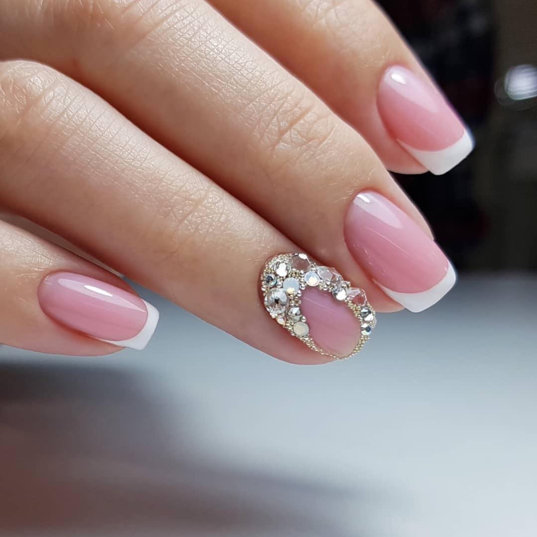 В этом виде френча главное — не переборщить с количеством камушков. Лучше украшать отдельные ногти — например, по краю лунки либо в центре ноготка, выложив узор. Также кристаллики можно сделать частью художественной композиции на безымянном пальце.