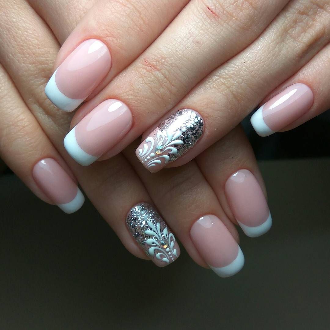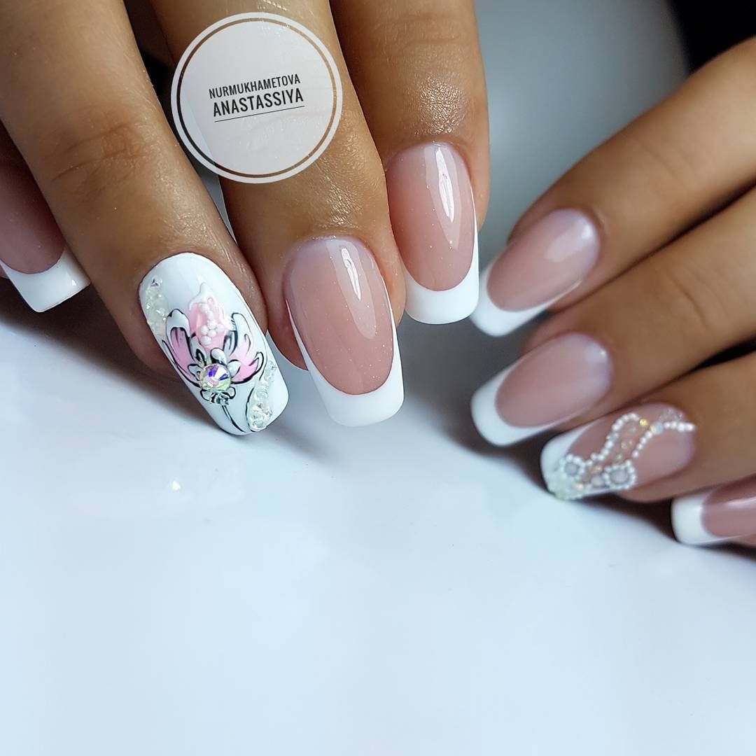 Френч невесты, выполненный в пастельных тонах, а также со стразами или цветочным декором, выглядит нежно и романтично. Если добавить немного страз на безымянный палец, то они подчеркнут красоту обручального кольца.