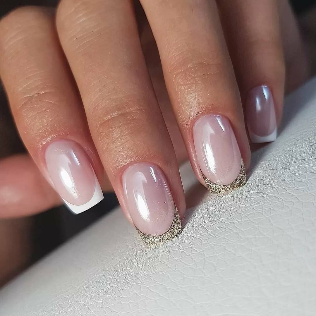 Покрытие ногтей блестками и сияющими лаками делает образ броским и эффектным. Такой френч подходит для вечеринок.