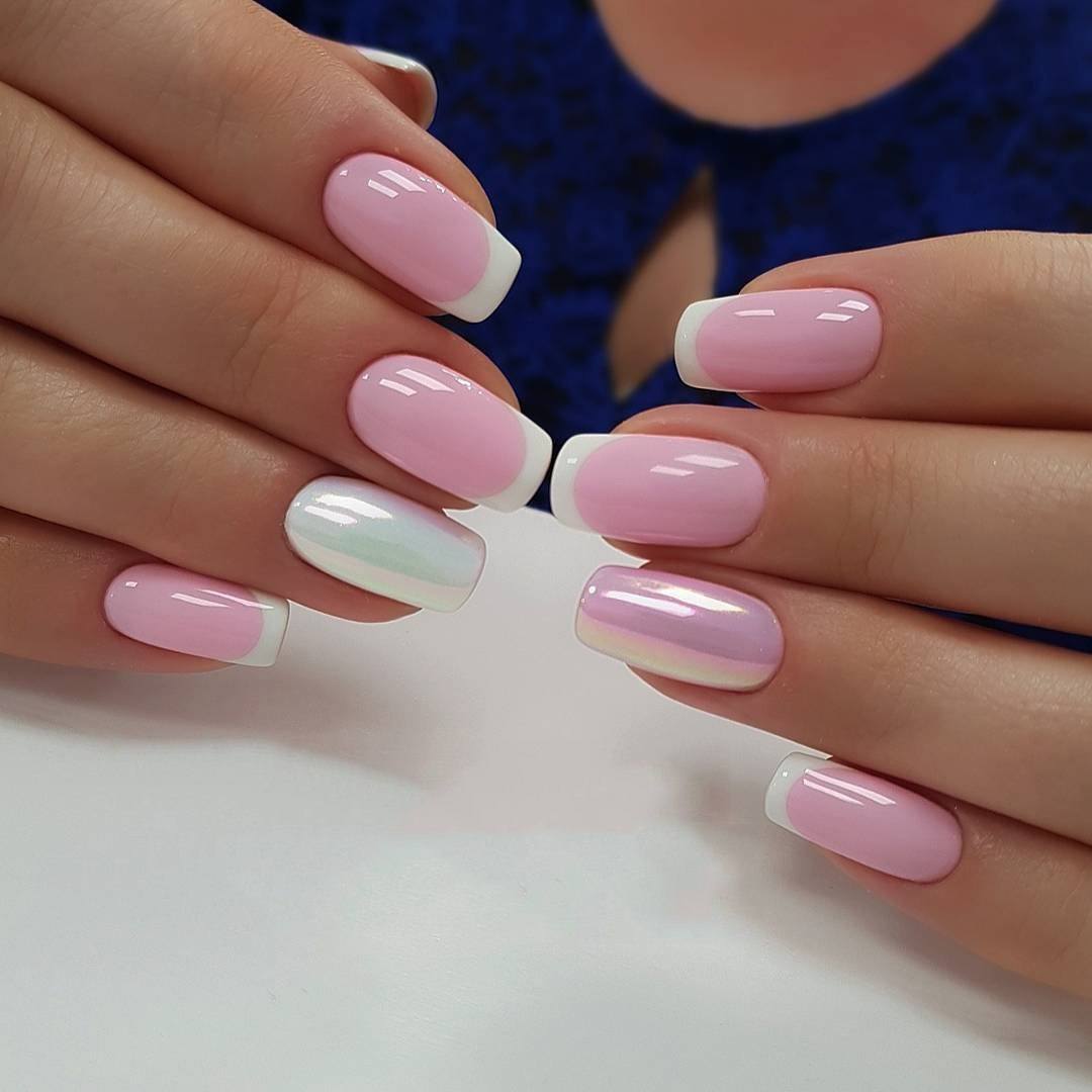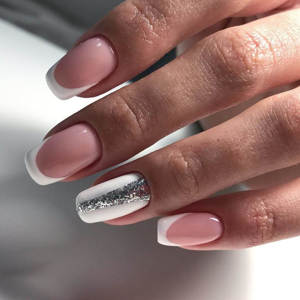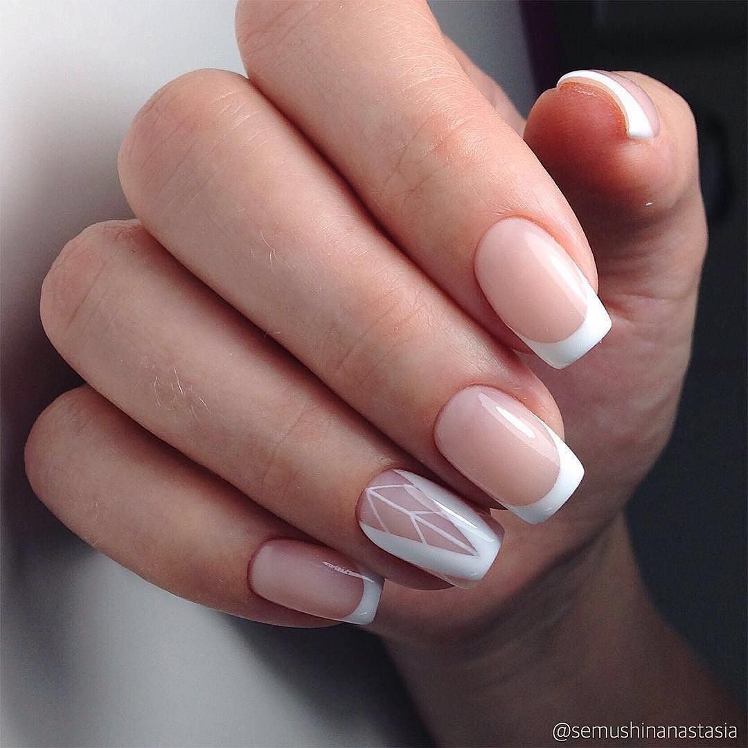 Хорошо знакомый всем вид френча, при котором ногти покрываются прозрачным или нежно-розовым лаком, а по их краям рисуется белая линия. Отличный маникюр для офиса, деловых встреч и прогулок с друзьями.