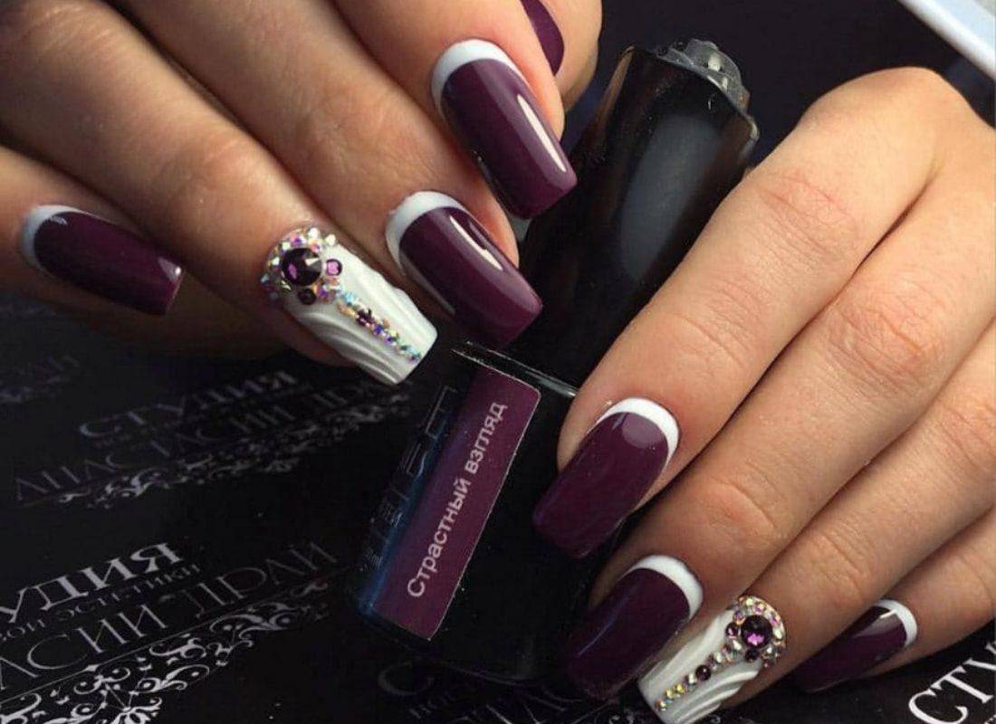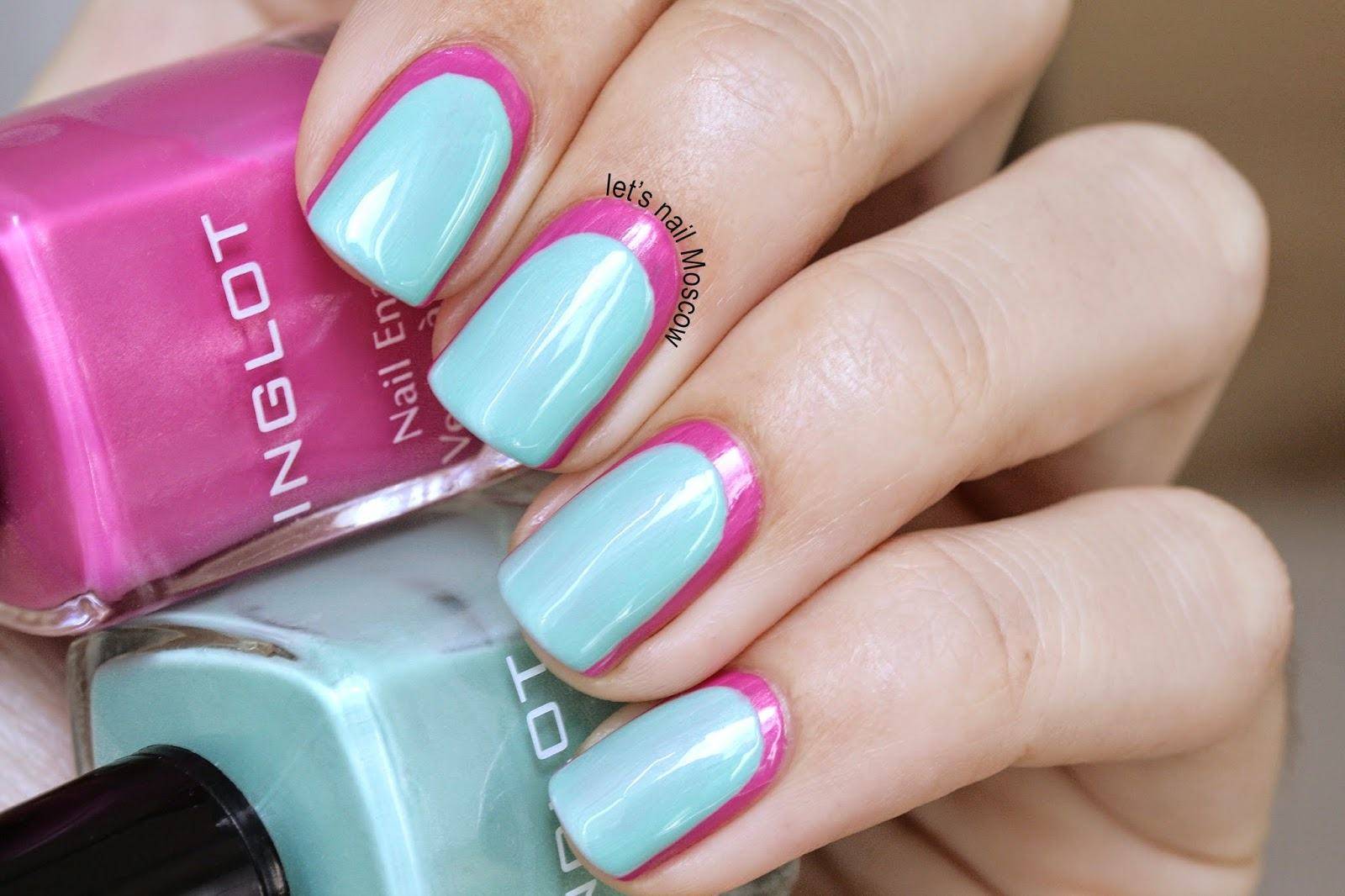 Кроме того в качестве базового цвета нередко выбирают пурпурный, лазурный, розоватый или серый, сохранив дежурный белый или другой подходящий цвет на краешке ногтя.